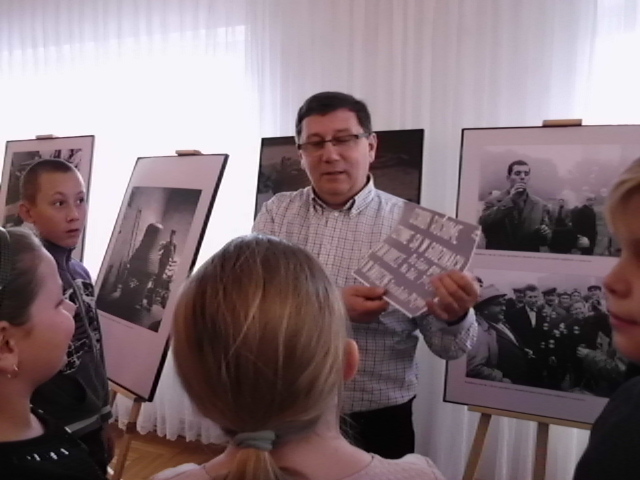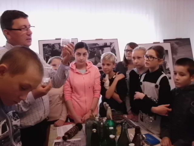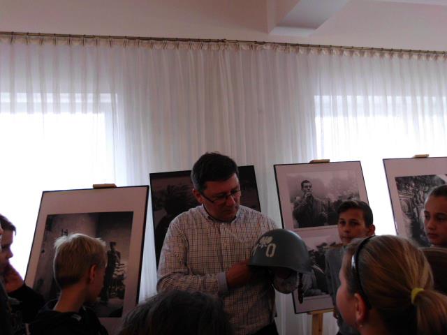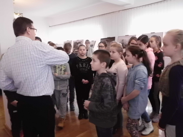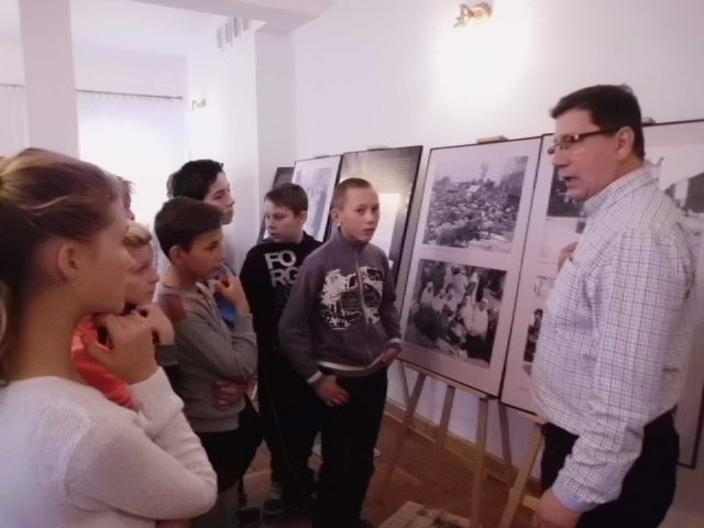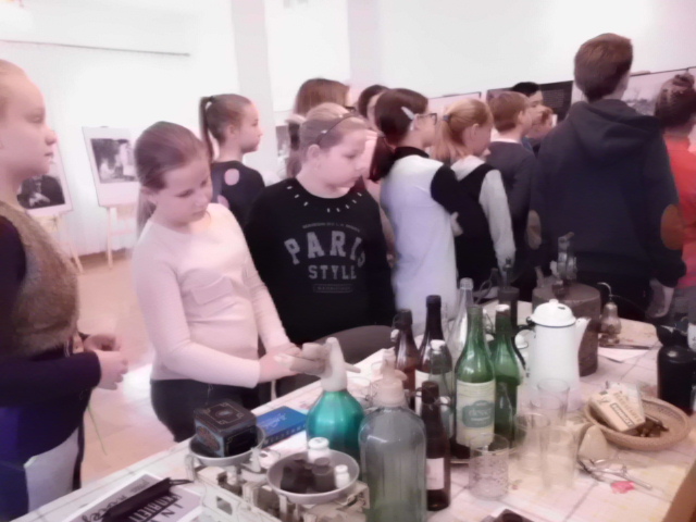 Uczniowie z dużym zainteresowaniem obejrzeli zgoromadzone na wystawie fotografie i eksponaty - m.in. radio tranzystorowe, walizkową maszynę do pisania, kartki żywnościowe i monety z okresu PRL - u.