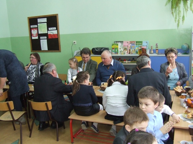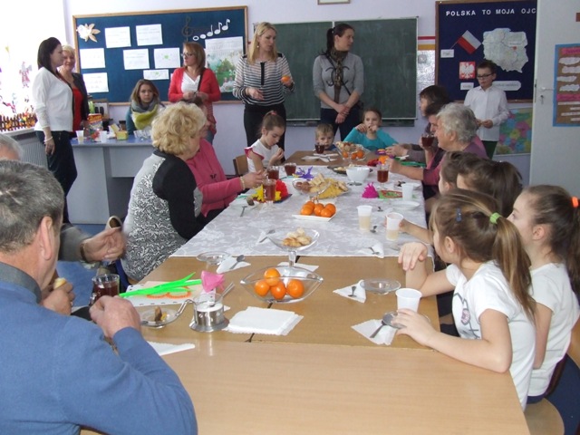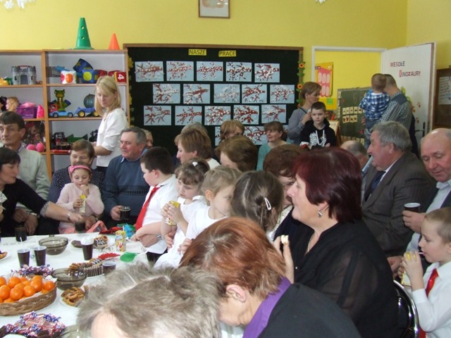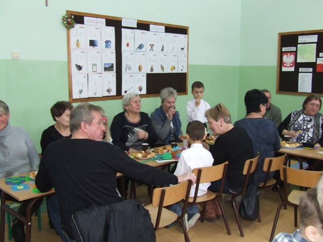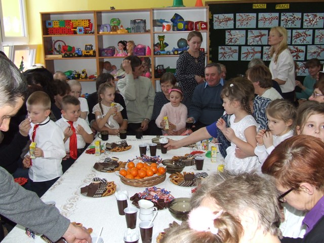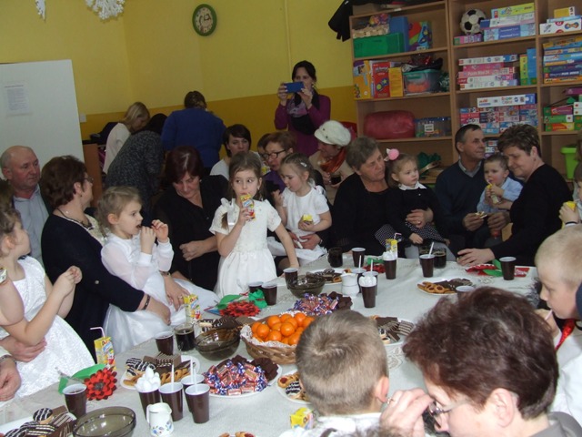 Po odśpiewaniu „100 lat” dzieci wręczyły babciom i dziadkom własnoręcznie wykonane laurki i upominki. W przyjęciu gości pomagali rodzice, którzy przygotowali słodki poczęstunek. Był to niezwykły dzień nie tylko dla dzieci, ale przede wszystkim dla ich babć i dziadków. Dzień, który obfitował w uśmiechy, chwile wzruszeń i radości… Jedna z sentencji głosi: „Serce jest bogactwem, które się nie sprzedaje ani nie kupuje, ale które się ofiaruje” (Gustaw Flaubert). Dlatego też dziękujemy wszystkim babciom i dziadkom za bezgraniczną miłość, dobroć i ciepło i życzymy Im dużo, dużo zdrowia oraz długich lat życia.