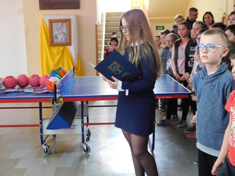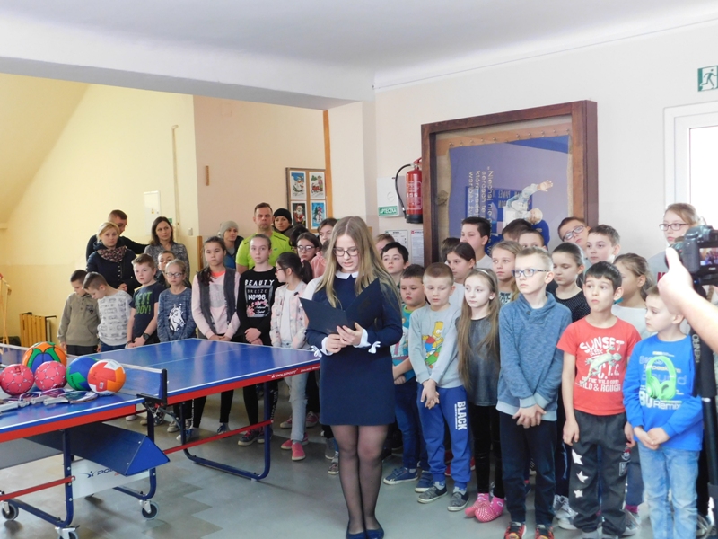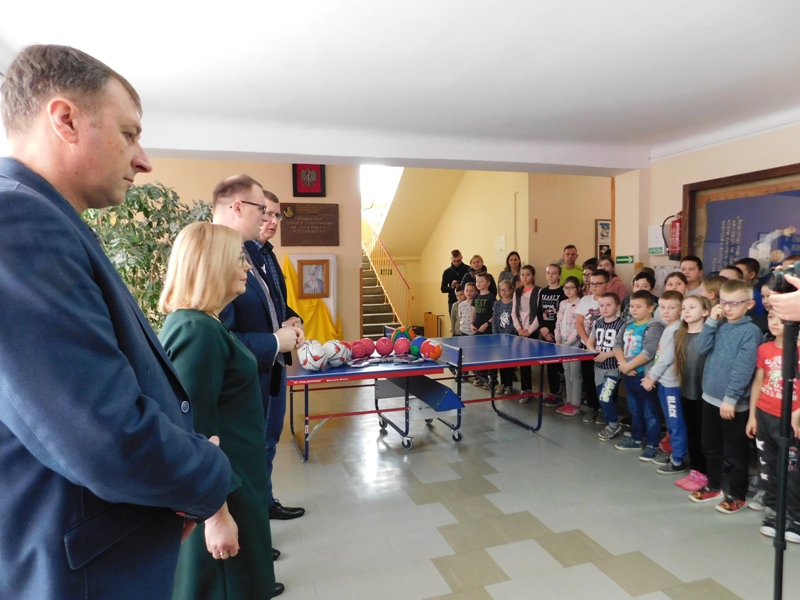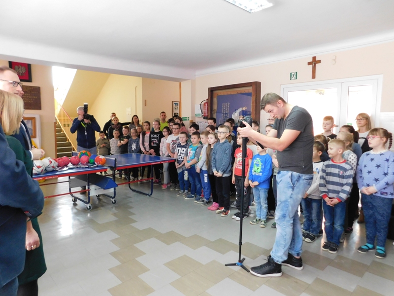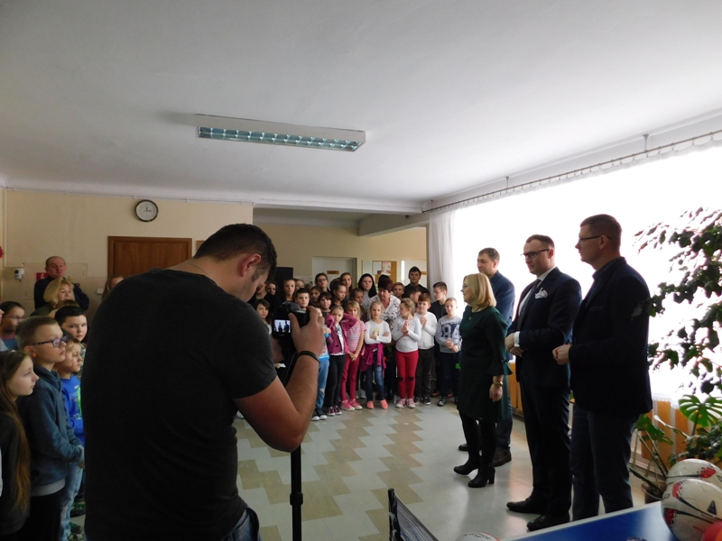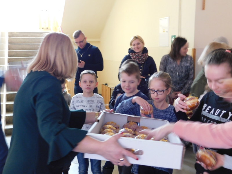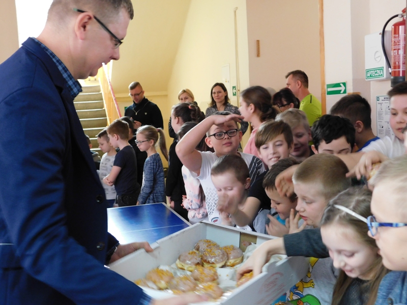 Przekazali oni społeczności szkolnej sprzęt sportowy ufundowany z środków gminy. Zgodnie z tradycją tłustego czwartku wszyscy obecni poczęstowani zostali pysznymi pączkami