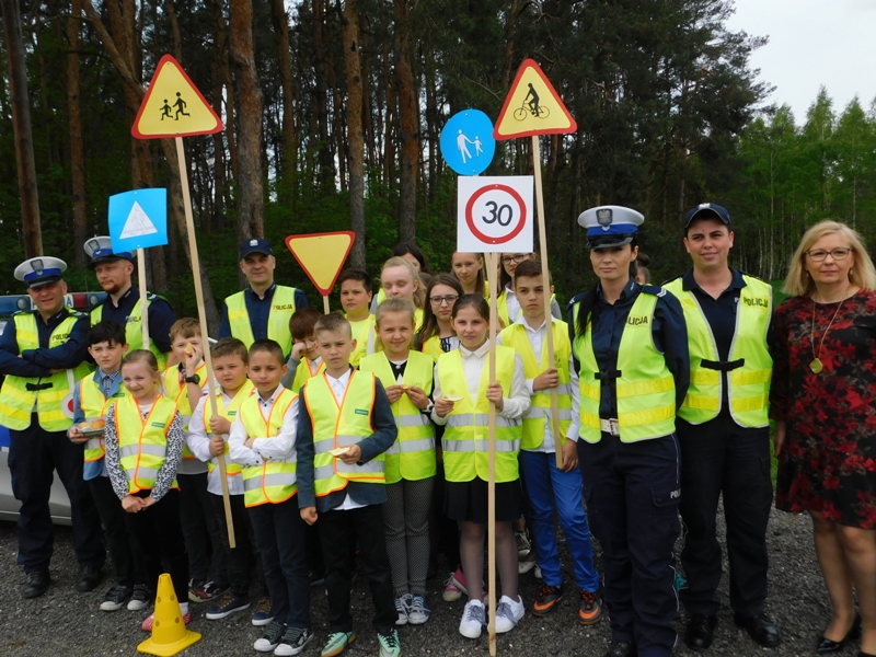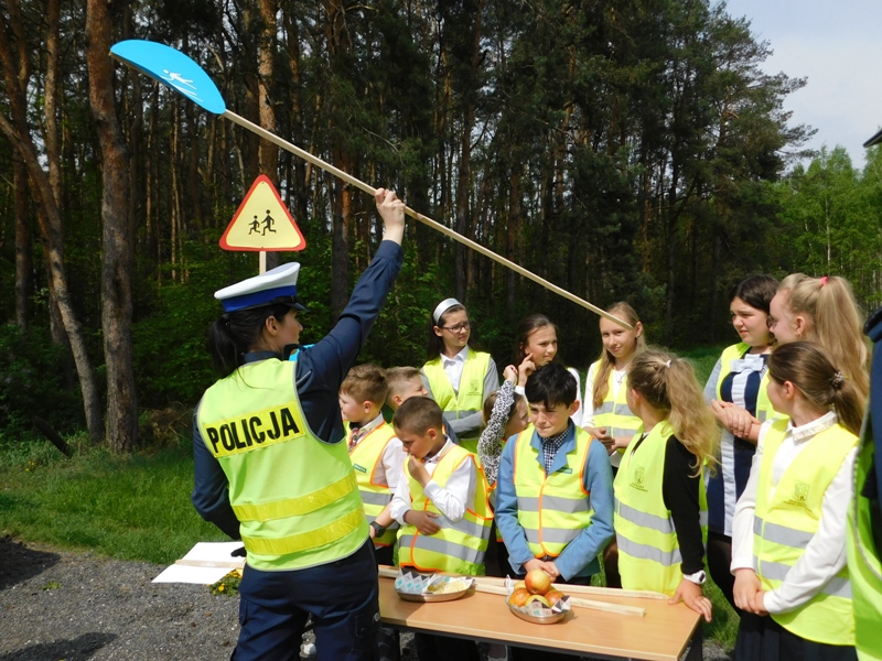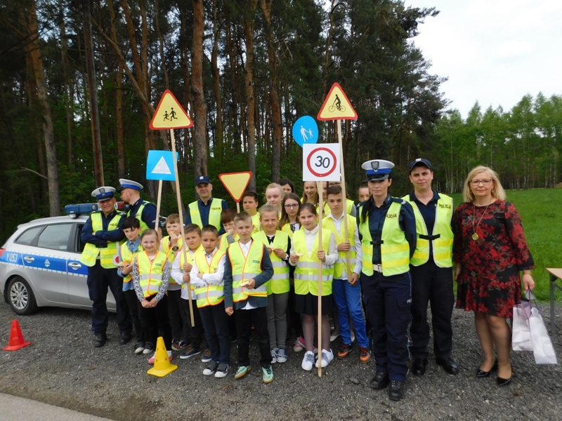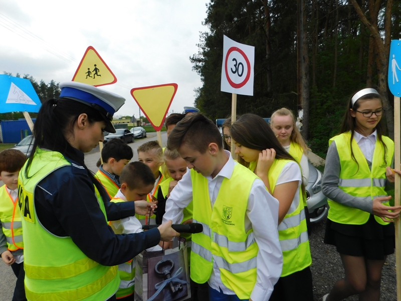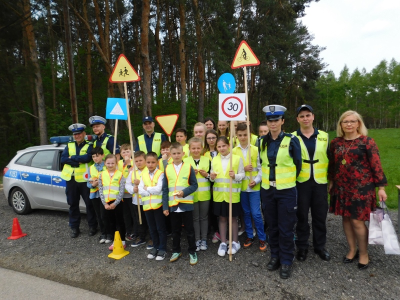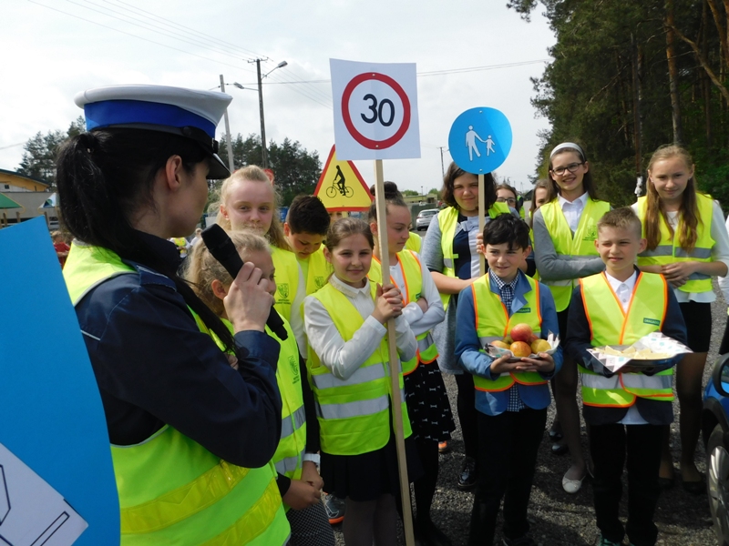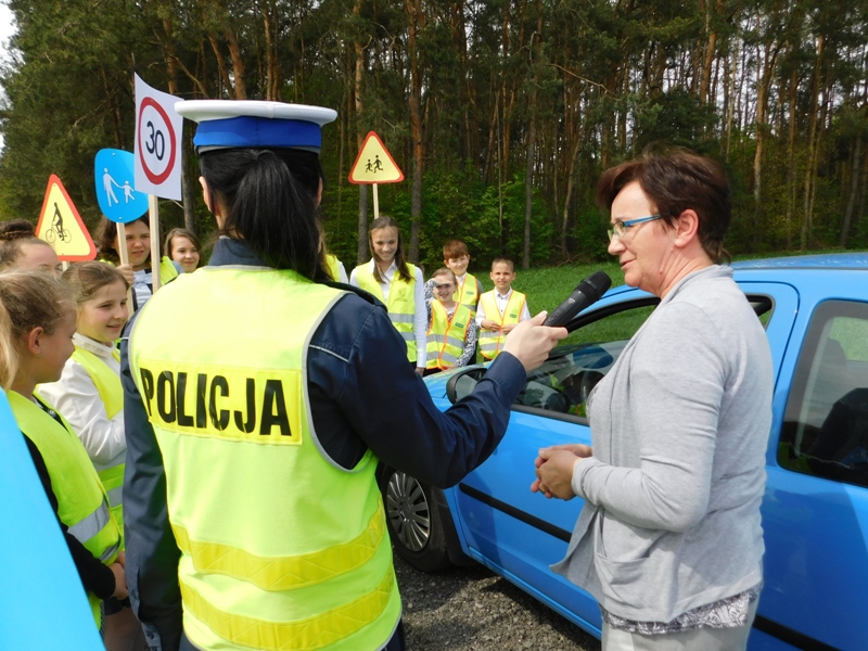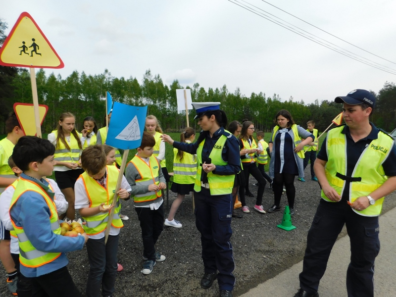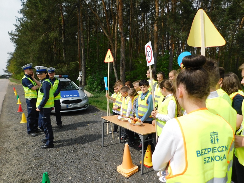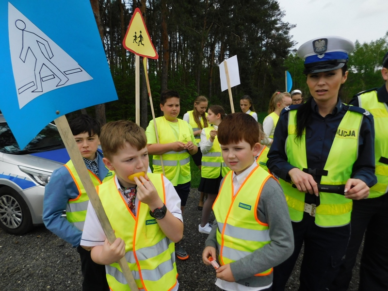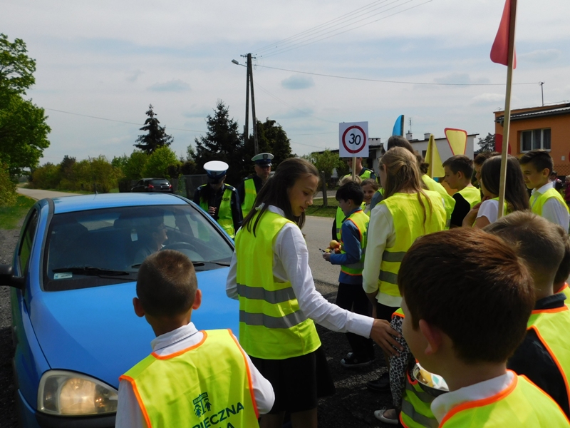 Dzieci utrwaliły wiadomości dotyczące znaków drogowych i zasad bezpiecznego poruszania się po drodze, a następnie uczestniczyły w „akcji terenowej”. Pod kierunkiem st. sierż. Renaty Gawryś brały udział w kontroli zatrzymywanych pojazdów. Niestety, wszyscy zatrzymani dzisiaj kierowcy popełnili większe lub mniejsze wykroczenia (przekroczenie prędkości, brak dokumentów, brak świateł) i zostali pouczeni oraz surowo ukarani… zjedzeniem cytryny.