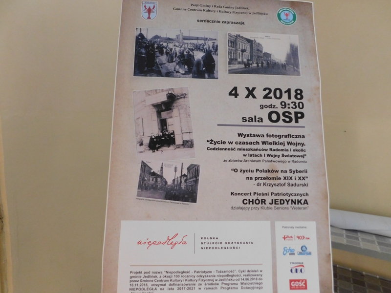 Zgodnie ze szkolnym planem obchodów 100-lecia odzyskania niepodległości uczniowie klas VII i VIII uczestniczyli w niezwykle interesującym wydarzeniu, które przygotowane zostało przez GCKiKF w Jedlińsku w ramach projektu Niepodległość - Patriotyzm - Tożsamość. W sali OSP w Jedlińsku obejrzeli wystawę fotograficzną Życie w latach Wielkiej Wojny. Codzienność mieszkańców Radomia i okolic w czasie I Wojny Światowej.
