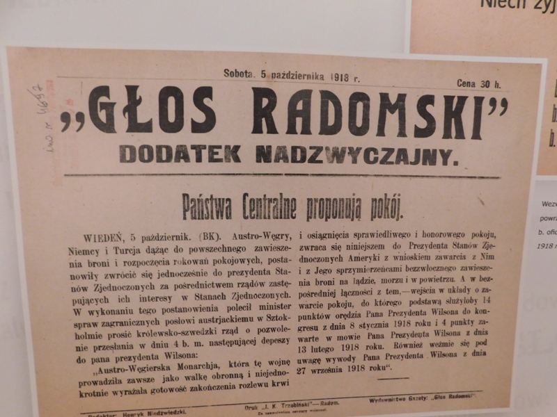 Ostatnia część wystawy ukazuje koniec wojny i zbliżającą się niepodległość. Obrazuje to m.in. plakat informujący o przejęciu 2 listopada 1918 r. władzy w Radomiu przez tzw. Komitet Pięciu, stworzony przez lokalnych patriotów, który rządził miastem przez kilka dni, zanim podporządkował się innym ośrodkom władzy.