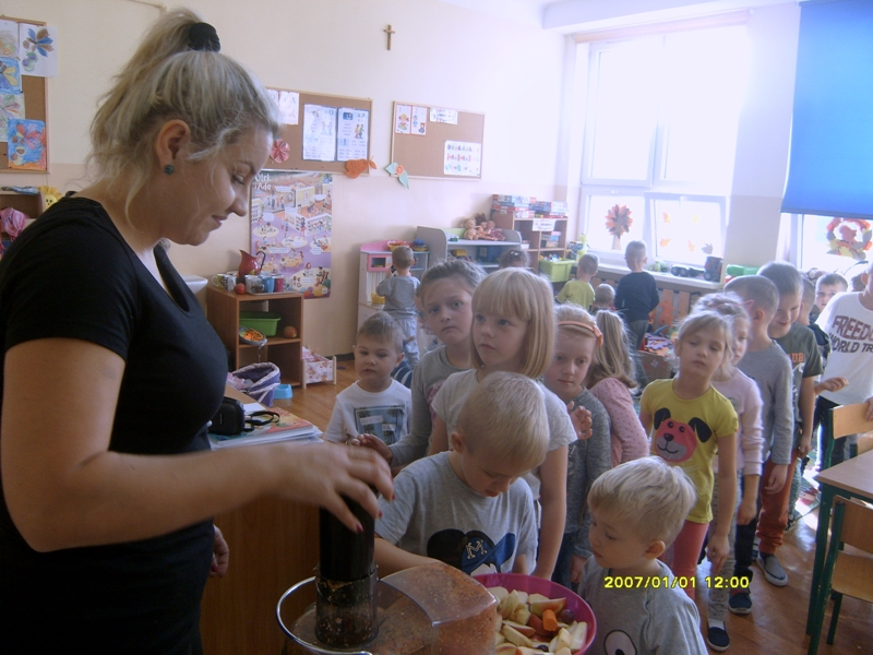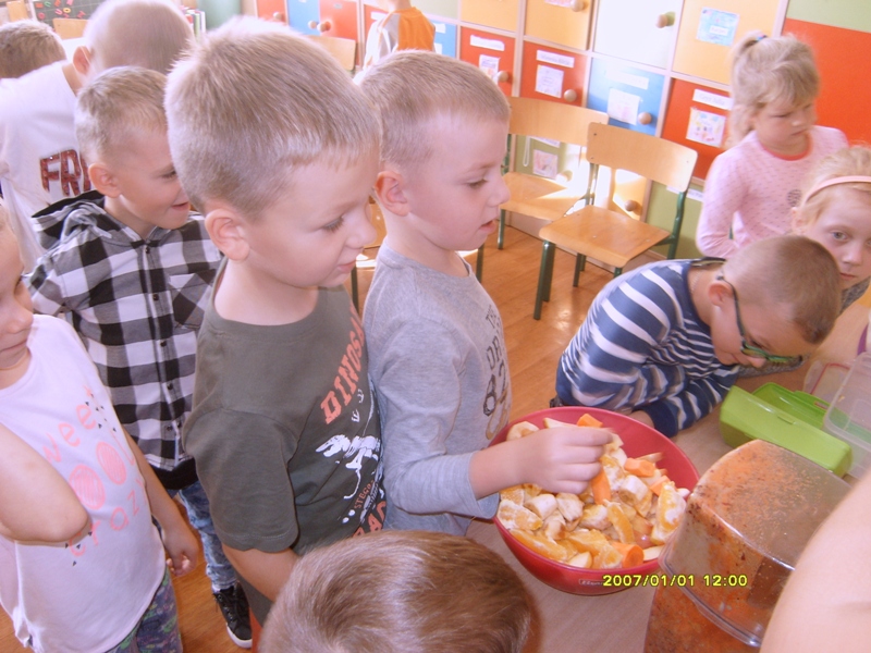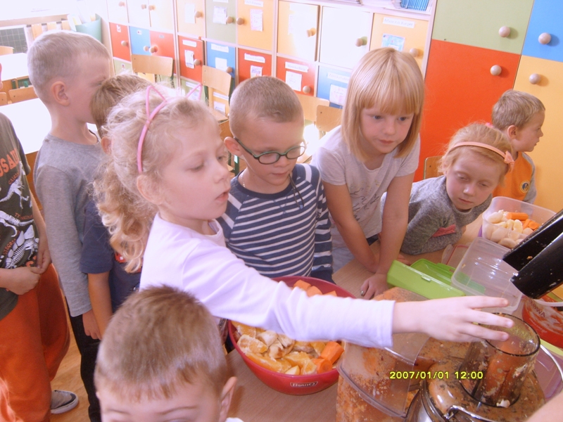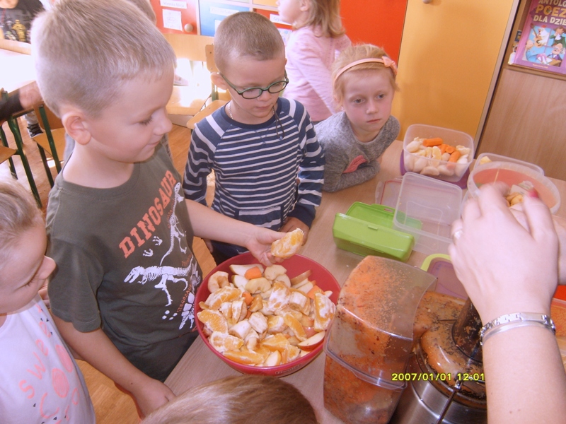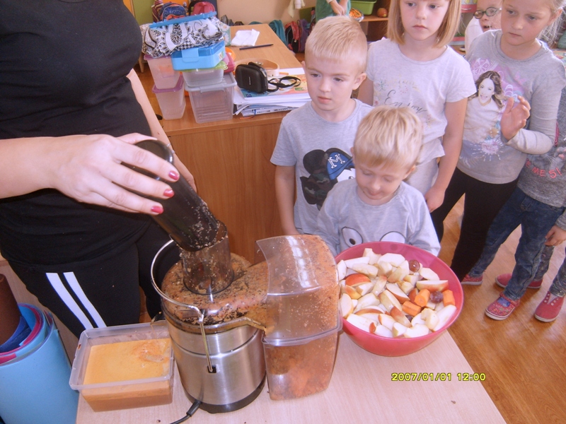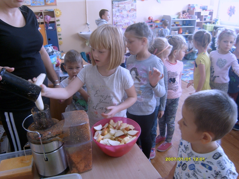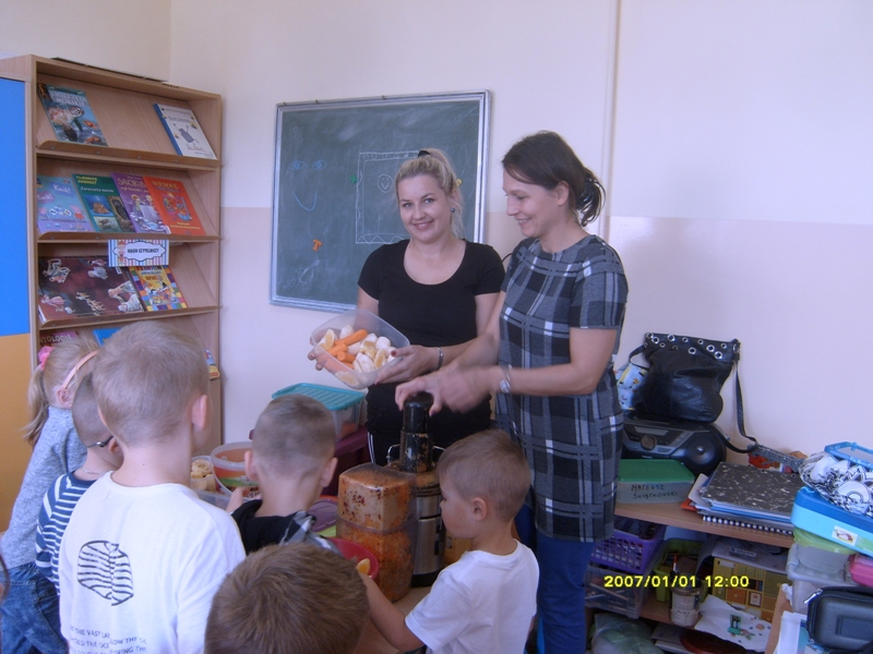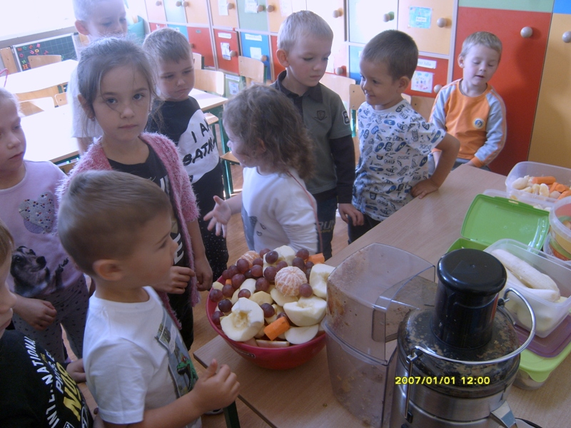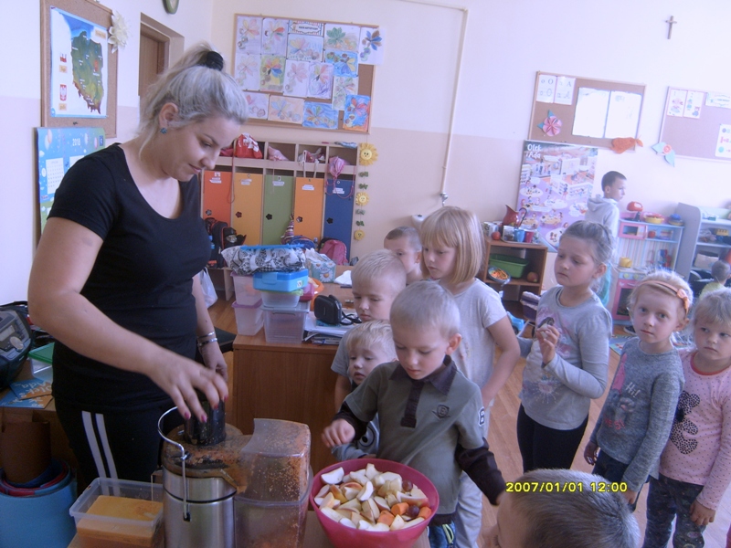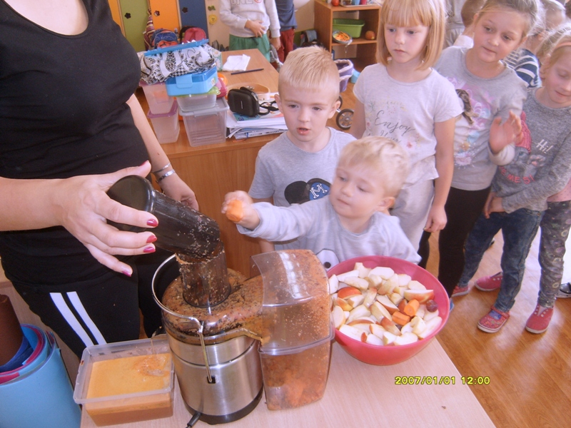 W miesiącu paździrniku przedszkolaki realizując tematykę dotyczącą owoców i warzyw wykonały sok owocowo -warzywny. Dzieci już od samego rana gromadziły w sali produkty, a zaraz po śniadaniu przystąpiły do działania. Ustaliliśmy etapy naszej pracy, zasady higieny i bezpieczeństwa. Poznaliśmy urządzenie elektryczne ułatwiające pracę w kuchni- sokowirówkę. Dzieci chętnie uczestniczyły w produkcji soczku i pod nadzorem wkładały owoce i warzywa do urządzenia. Na koniec odbyła się degustacja. Było pysznie i zdrowo.