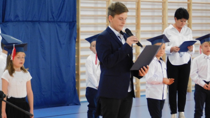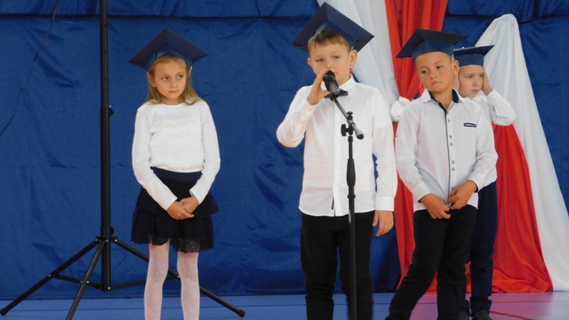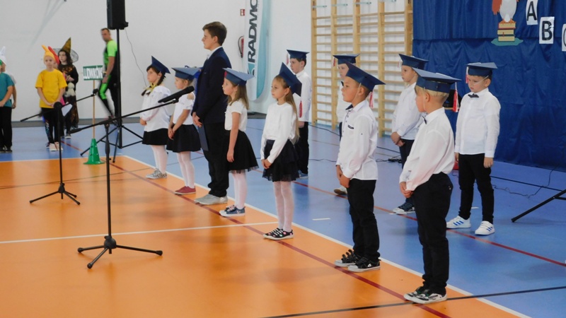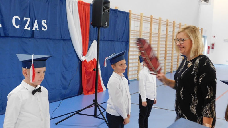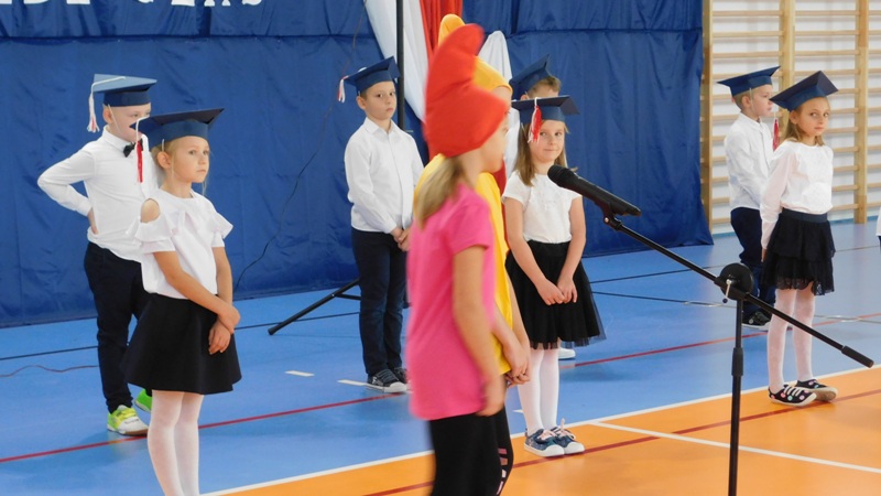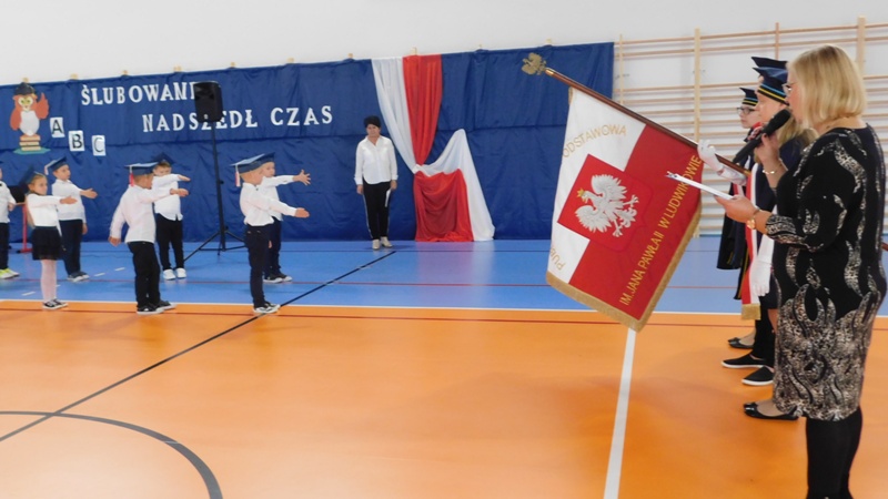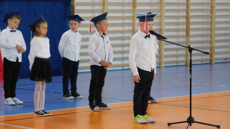 Uroczystość rozpoczęła się wprowadzeniem sztandaru szkoły i odśpiewaniem hymnu państwowego. Następnie głos zabrała Dyrektor Szkoły pani Małgorzata Sobień, która pogratulowała pierwszakom przyjęcia w poczet uczniów szkoły i życzyła, by swoją postawą i nauką zasłużyli na miano wzorowych uczniów. W imieniu społeczności uczniowskiej głos zabrał przedstawiciel Rady SU – Dawid Wójcik.