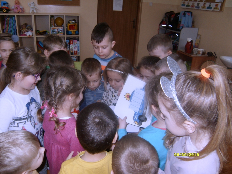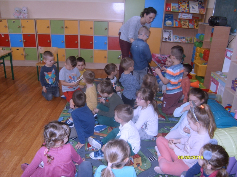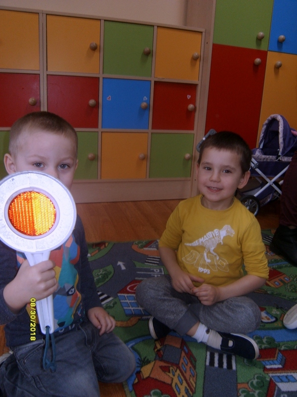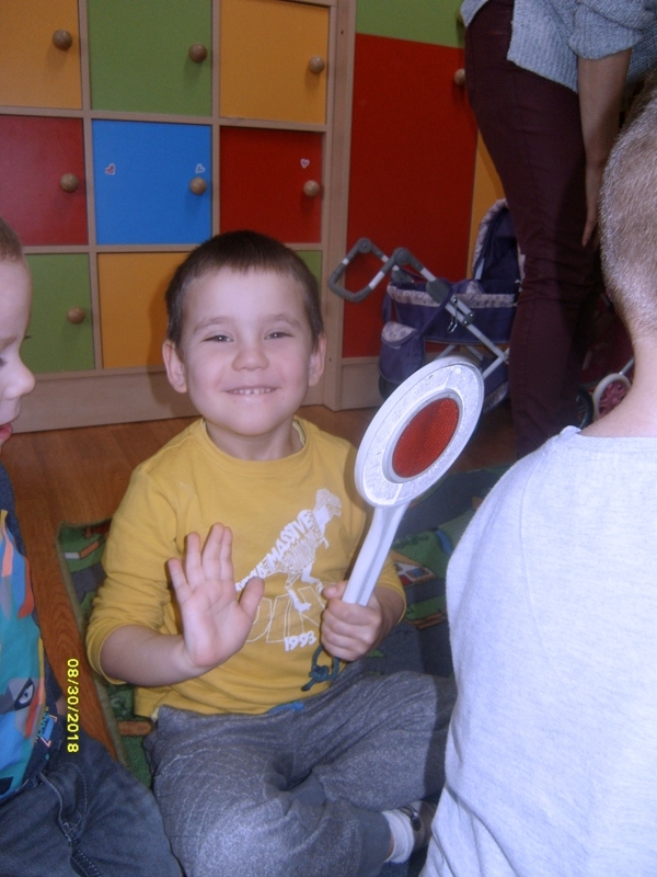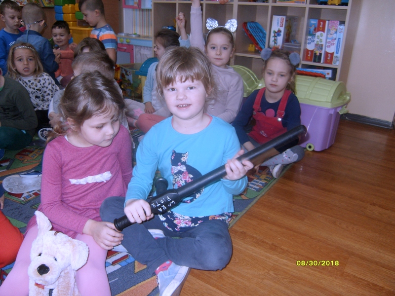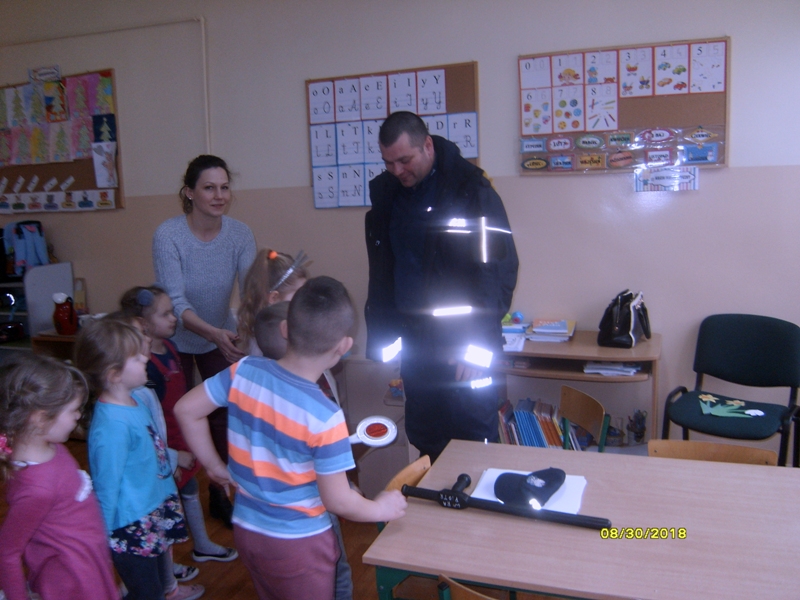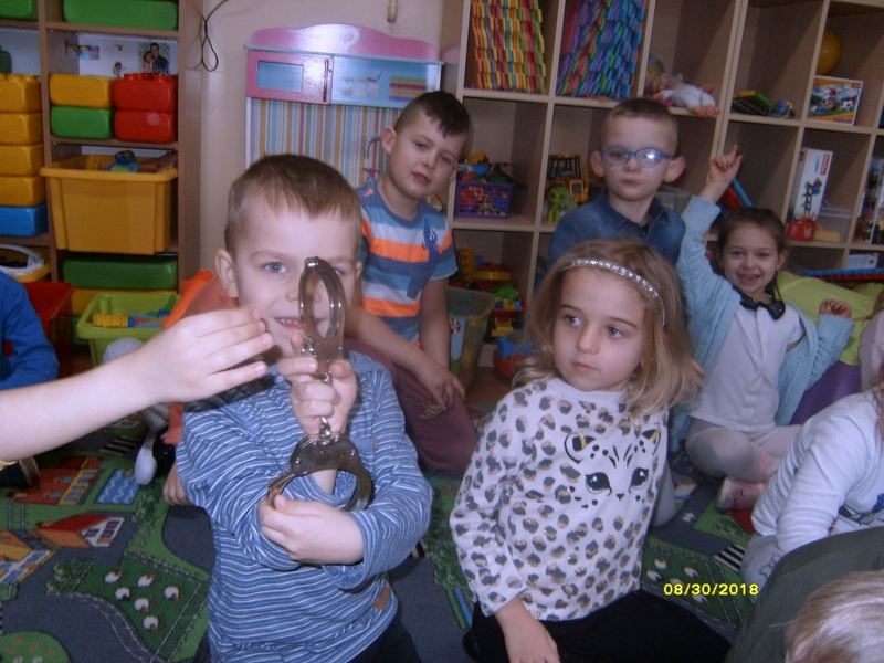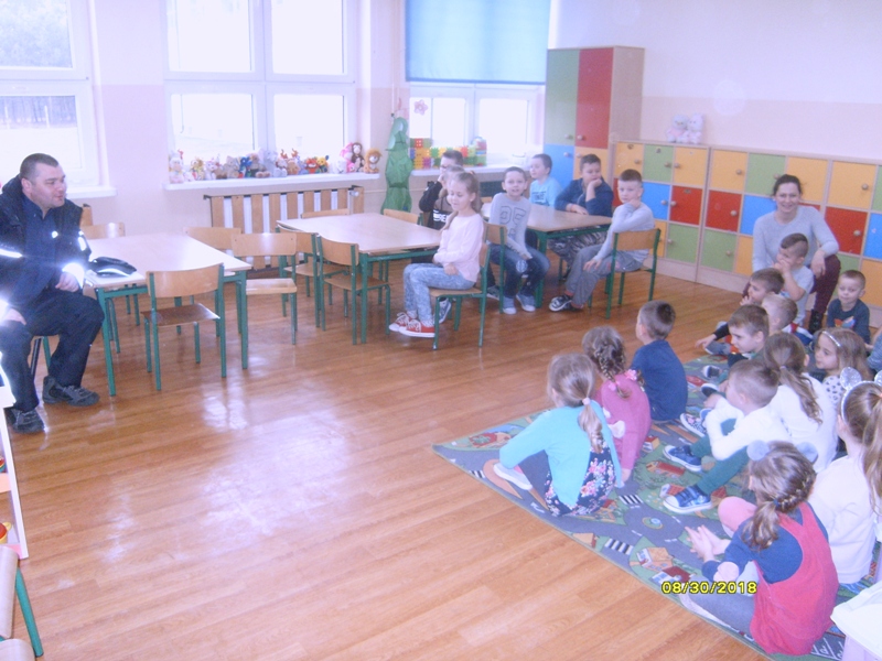 W dniu 28 lutego nasze oddziały przedszkolne odwiedził pan policjant, który przybliżył dzieciom podstawowe zasady bezpiecznego poruszania się po drogach oraz przypomniał numery alarmowe. Dzieci otrzymały wskazówki, jak zachować się w różnych sytuacjach. Wśród wielu ochotników znalazło się kilku odważnych przedszkolaków, którzy zademonstrowali innym, jak należy rozglądać się przed przejściem przez jezdnię oraz jak należy odczytywać sygnalizator świetlny dla pieszych i pojazdów. Jednak największym zainteresowaniem cieszyła się prezentacja wyposażenia policyjnego, niezbędnego podczas wykonywania pracy policjanta. Na zakończenie spotkania, pan obdarował dzieci upominkami, a przedszkolaki dziękując za cenne rady wręczyły dyplom.