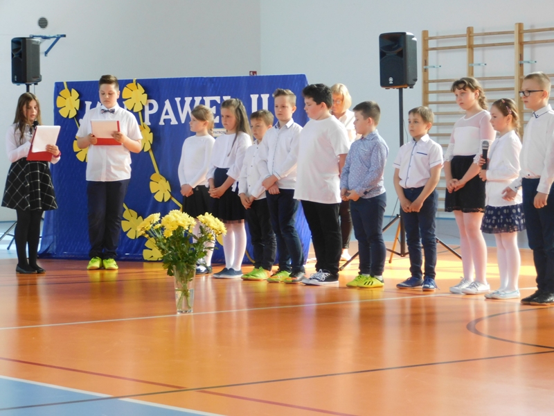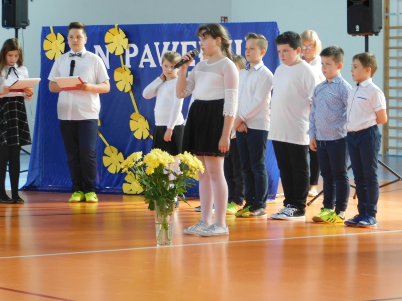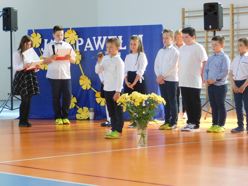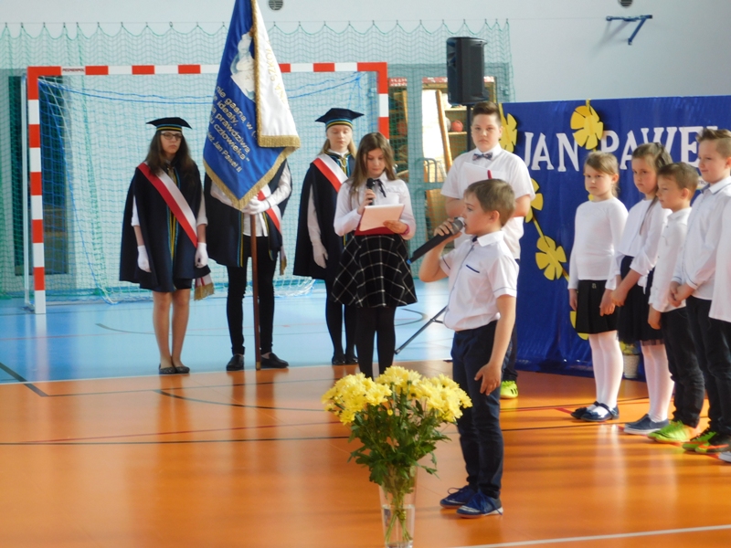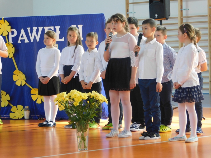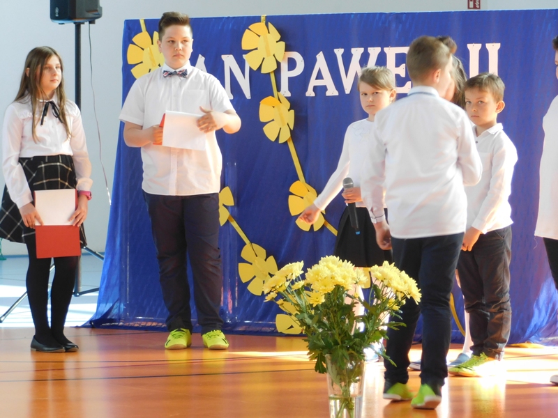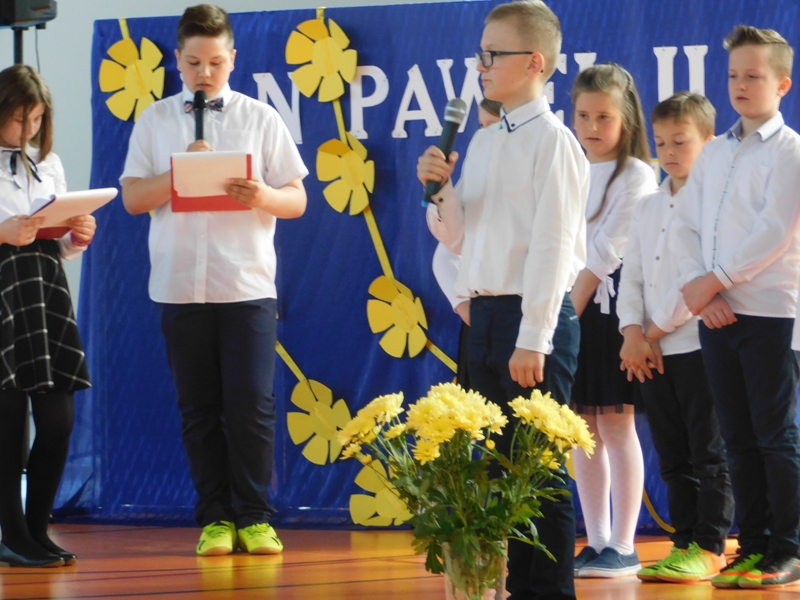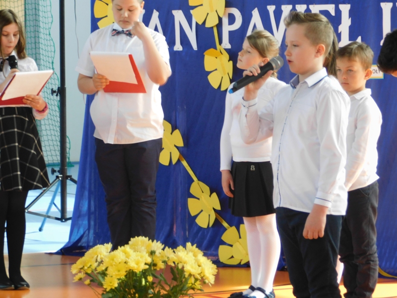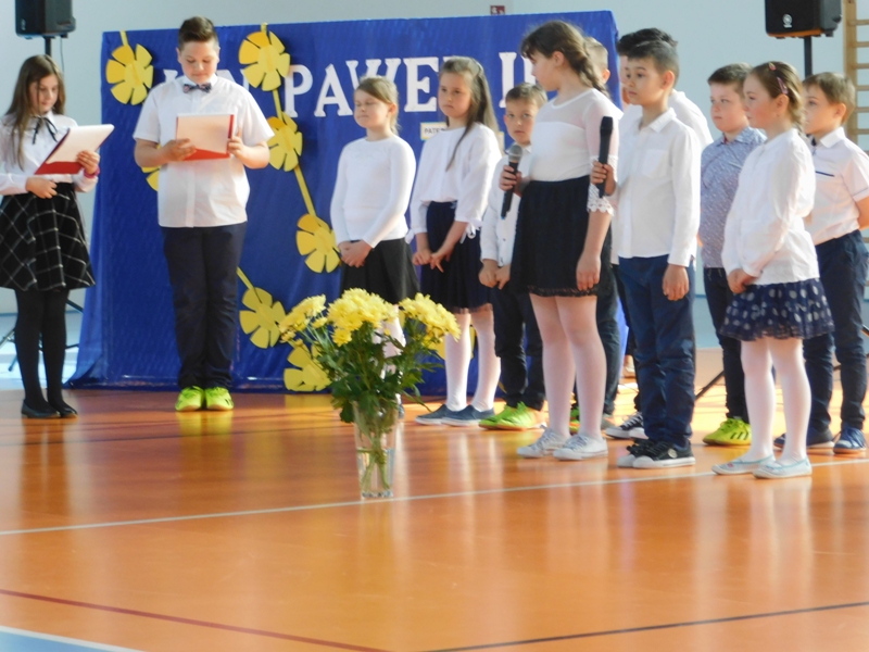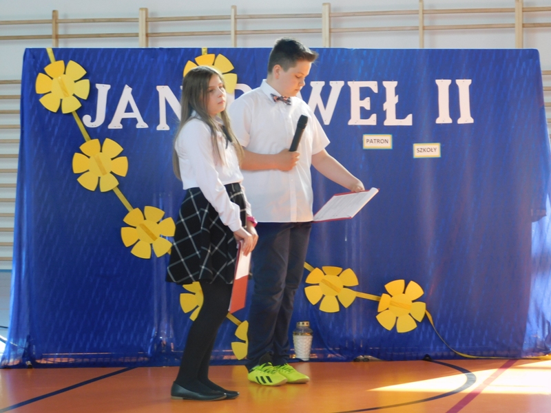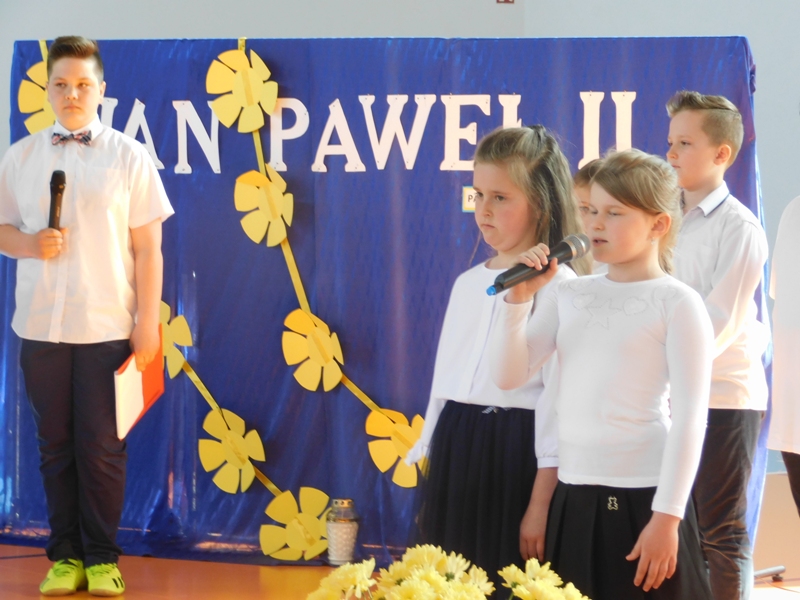 Na wzruszającą „lekcję” pamięci, wspomnień i refleksji o przemijaniu zaprosili nas uczniowie klasy drugiej wraz z wychowawczynią panią Wiolettą Kaletą, którzy przygotowali uroczystość poświęconą Patronowi Szkoły. Na program złożyły się wiersze , ulubione pieśni Ojca Świętego i fragmenty wypowiedzi osób, które osobiście znały Karola Wojtyłę.