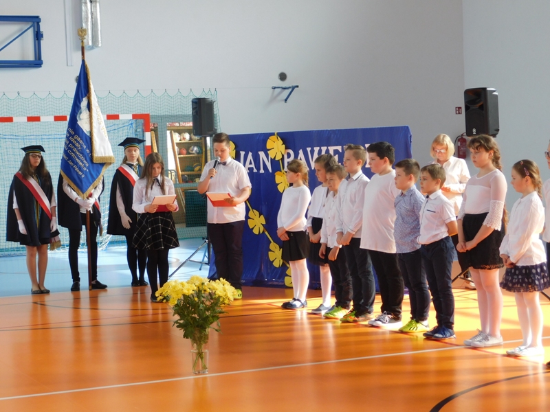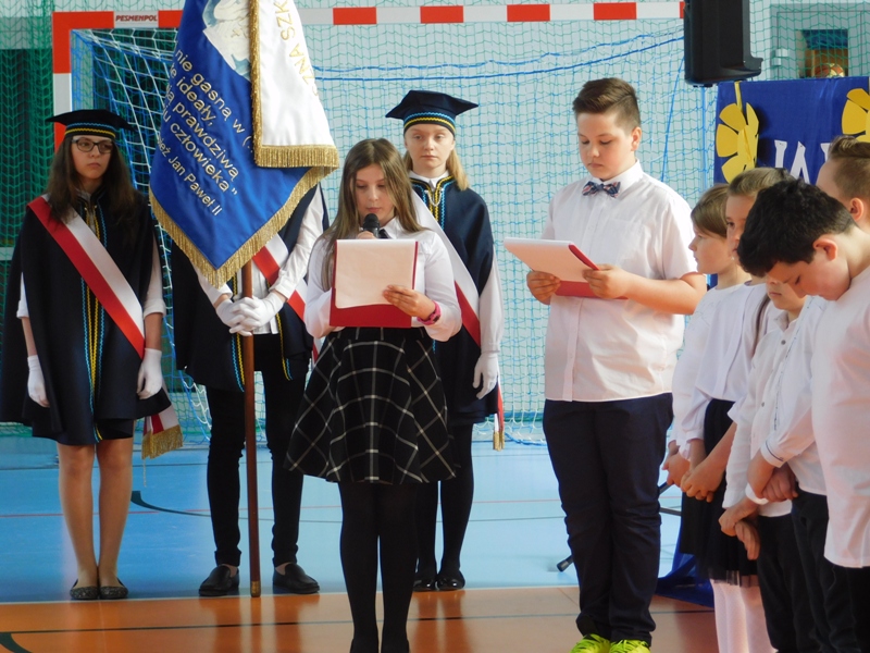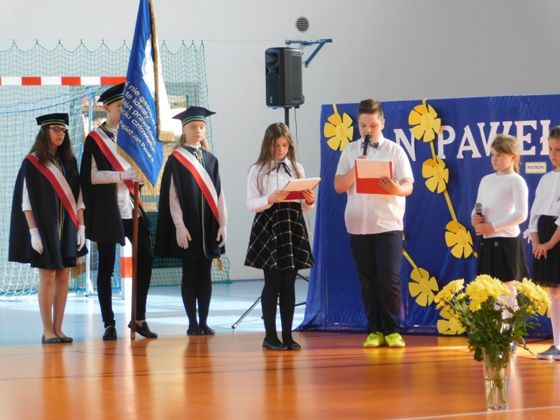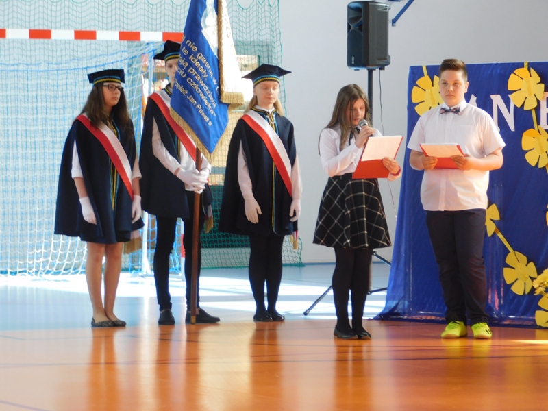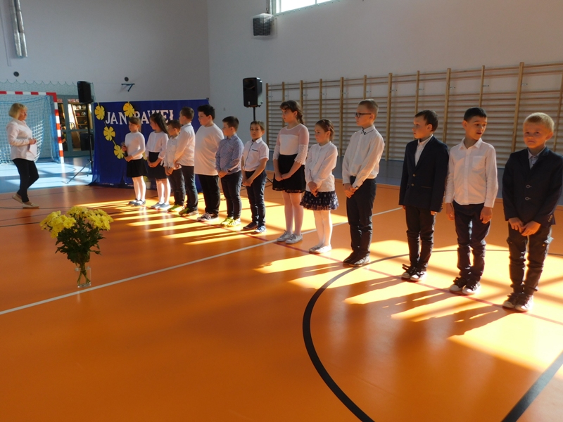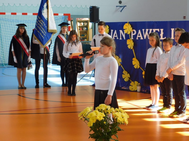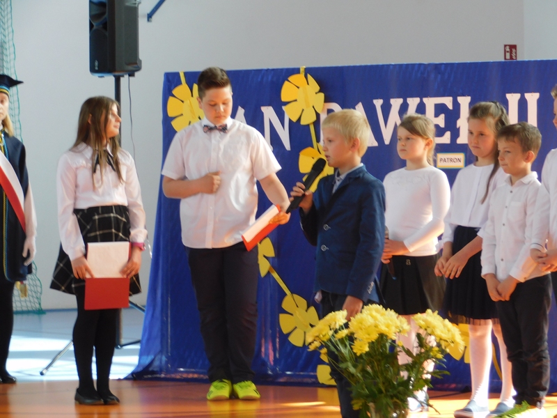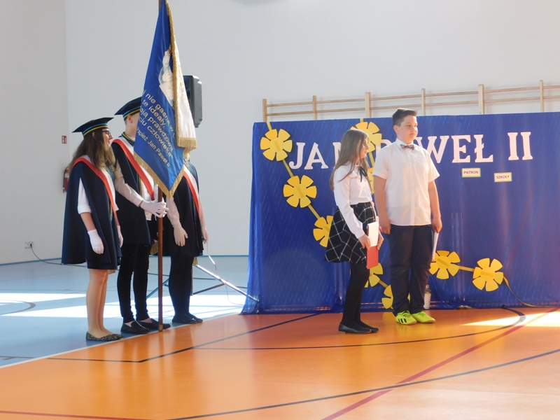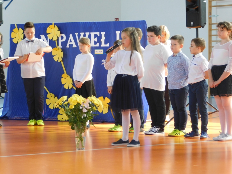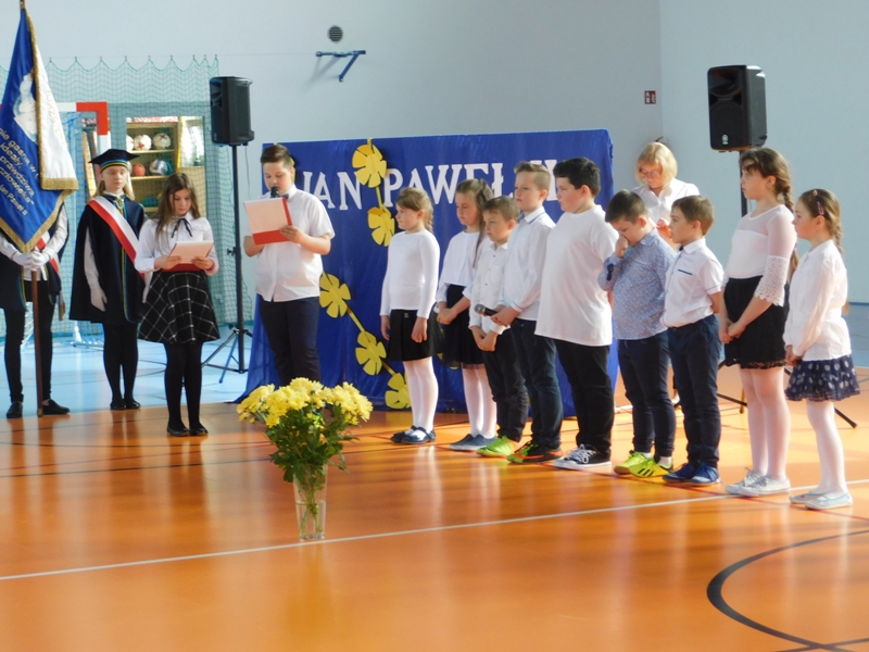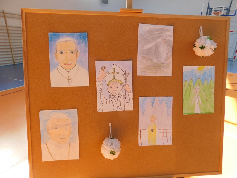 Na wzruszającą „lekcję” pamięci, wspomnień i refleksji o przemijaniu zaprosili nas uczniowie klasy drugiej wraz z wychowawczynią panią Wiolettą Kaletą, którzy przygotowali uroczystość poświęconą Patronowi Szkoły. Na program złożyły się wiersze , ulubione pieśni Ojca Świętego i fragmenty wypowiedzi osób, które osobiście znały Karola Wojtyłę.
