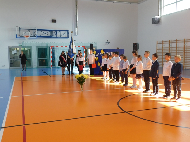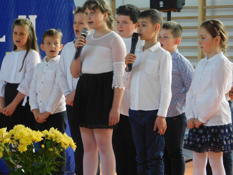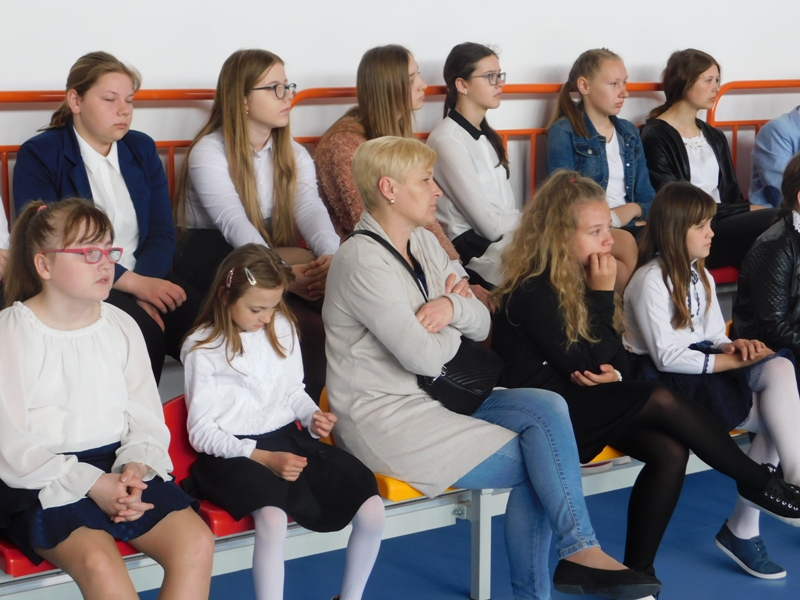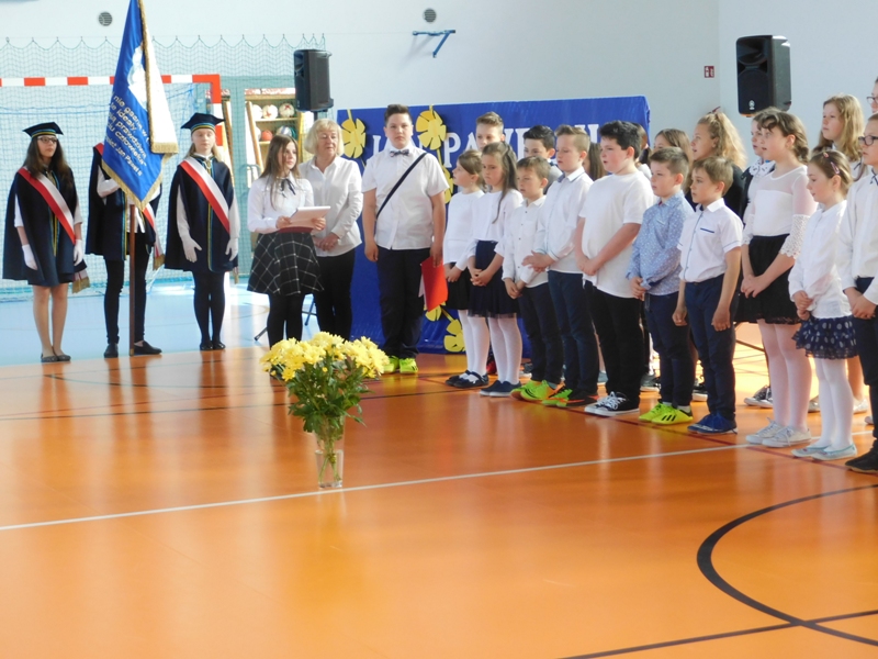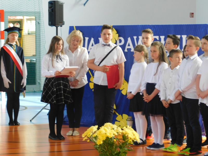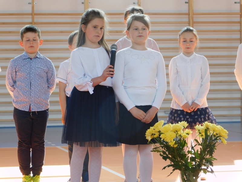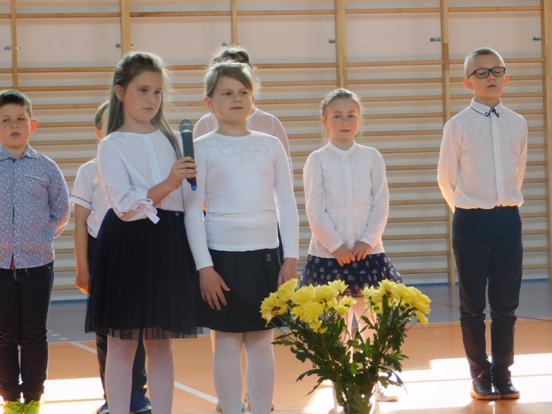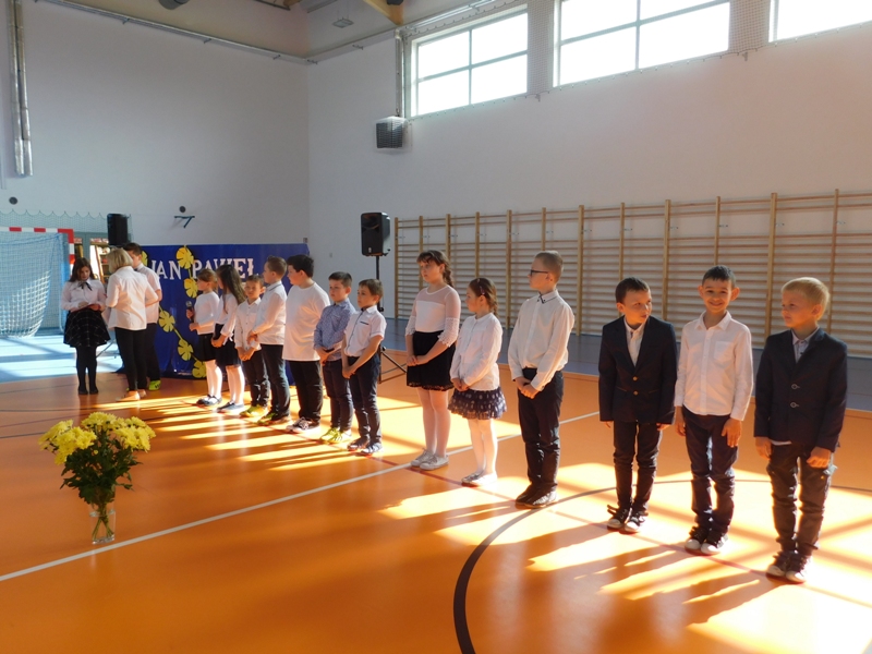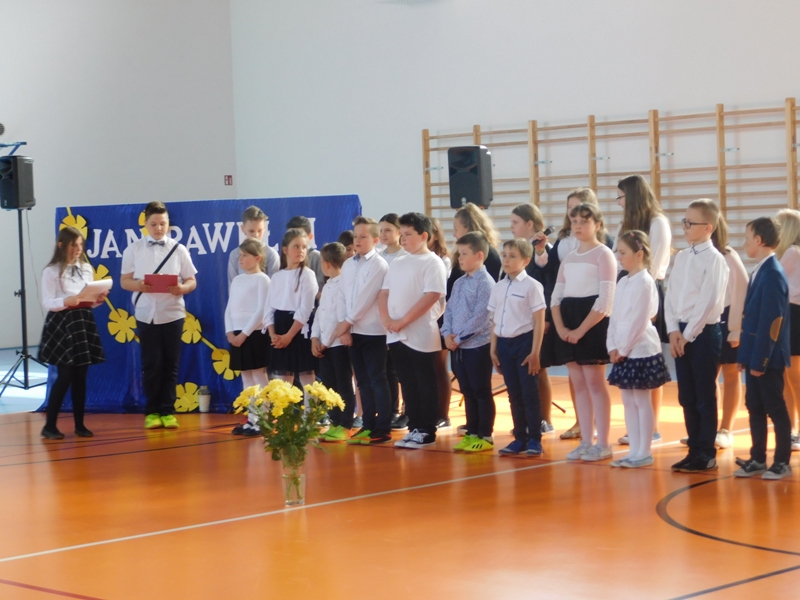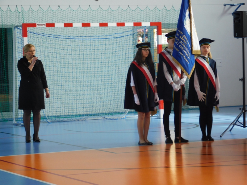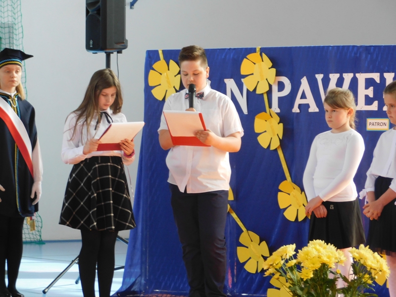 Na wzruszającą „lekcję” pamięci, wspomnień i refleksji o przemijaniu zaprosili nas uczniowie klasy drugiej wraz z wychowawczynią panią Wiolettą Kaletą, którzy przygotowali uroczystość poświęconą Patronowi Szkoły. Na program złożyły się wiersze , ulubione pieśni Ojca Świętego i fragmenty wypowiedzi osób, które osobiście znały Karola Wojtyłę.