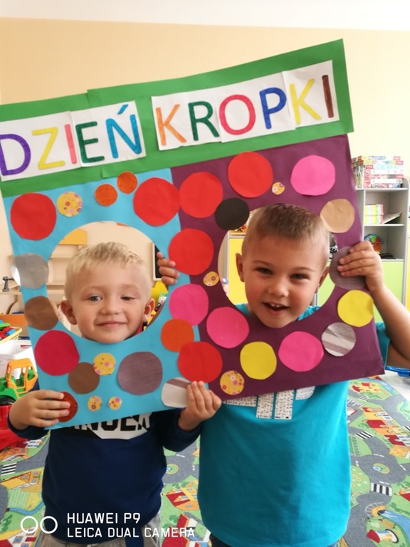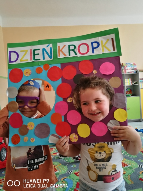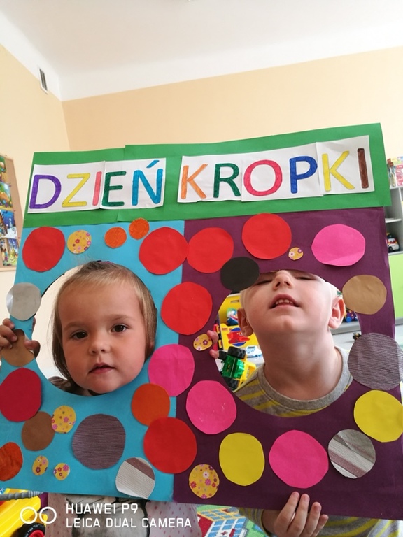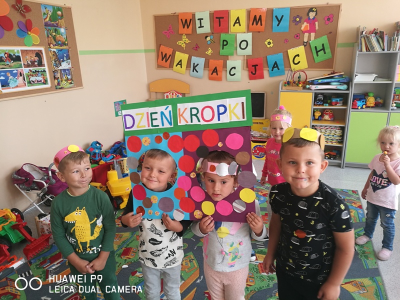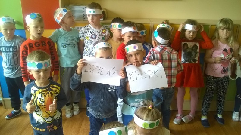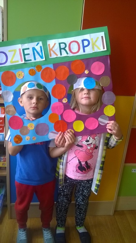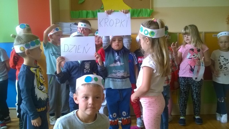 Tego dnia również dostrzegaliśmy kropki tam, gdzie wcześniej nikt na nie nie zwracał uwagi. Okazało się, że kropki towarzyszą nam w codziennym życiu. Są w literce "i”, kropkach biedronki, są w diamentowej koronie króla, a nawet zdobią kapelusz muchomora. Wspólnie z dziećmi ułożyliśmy też własną historię małej Kropki, a potem wykonaliśmy prace plastyczne, okleiliśmy opaski na głowy kolorowymi kropeczkami. Największą radość jednak sprawiło dzieciom ozdabianie fotobudki, w której zrobiliśmy sobie kropkowe zdjęcia.