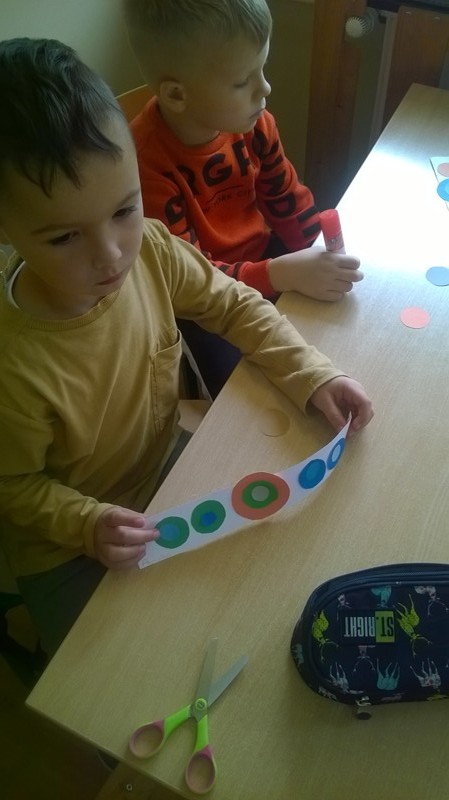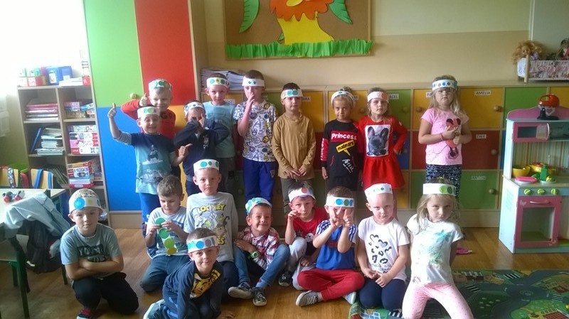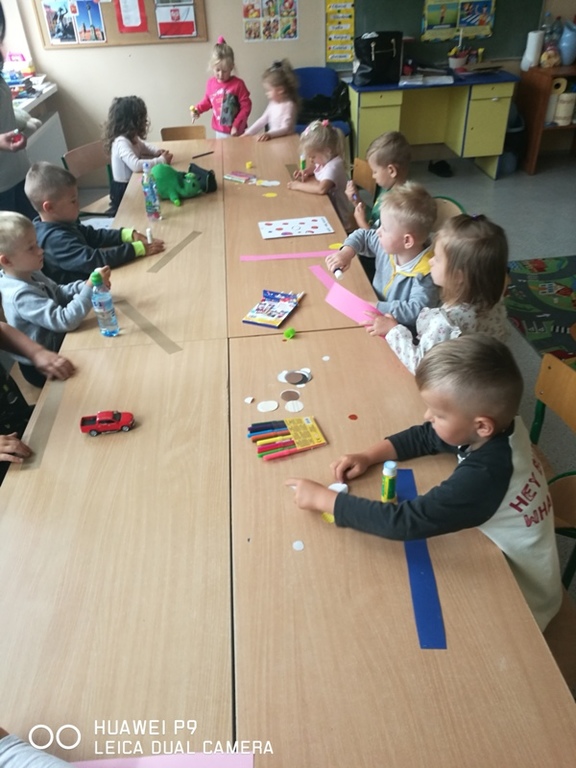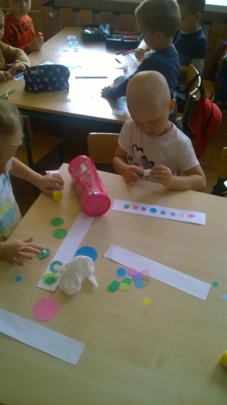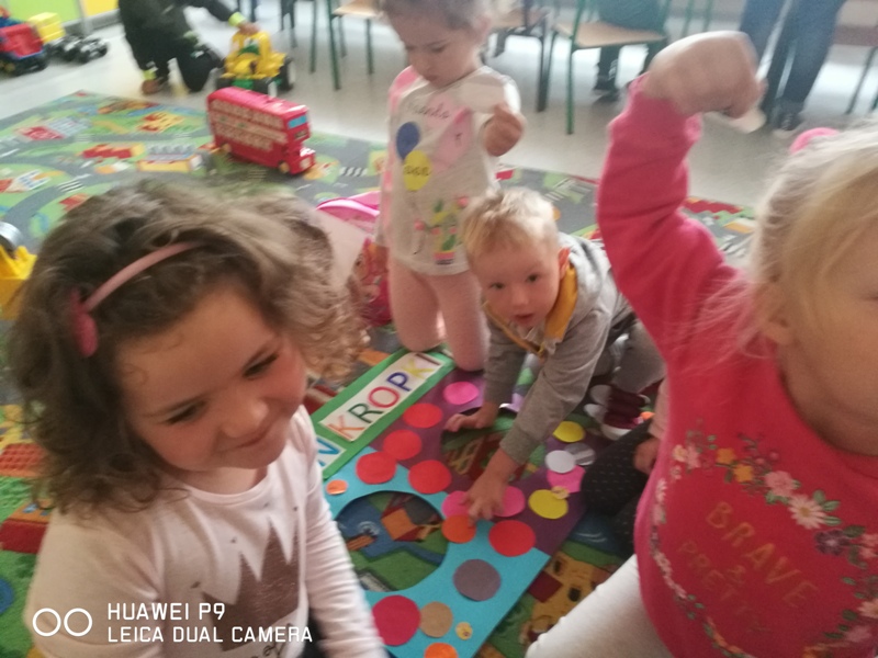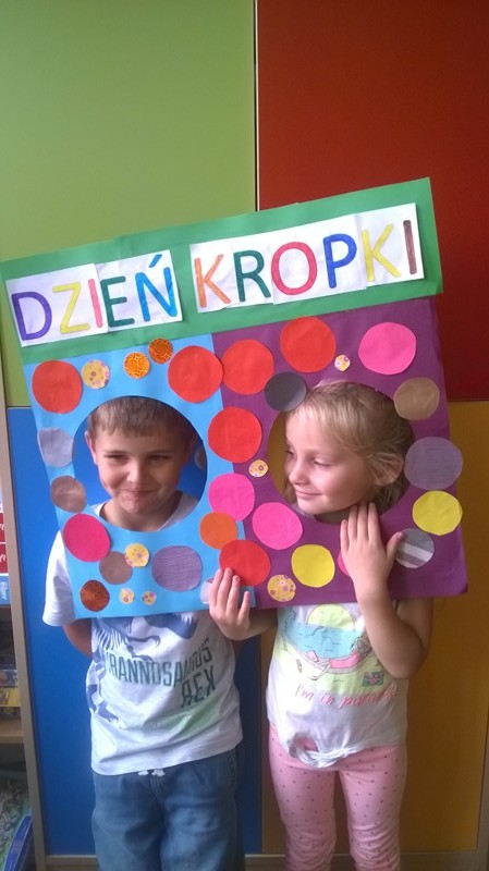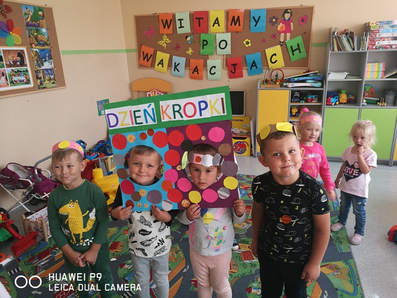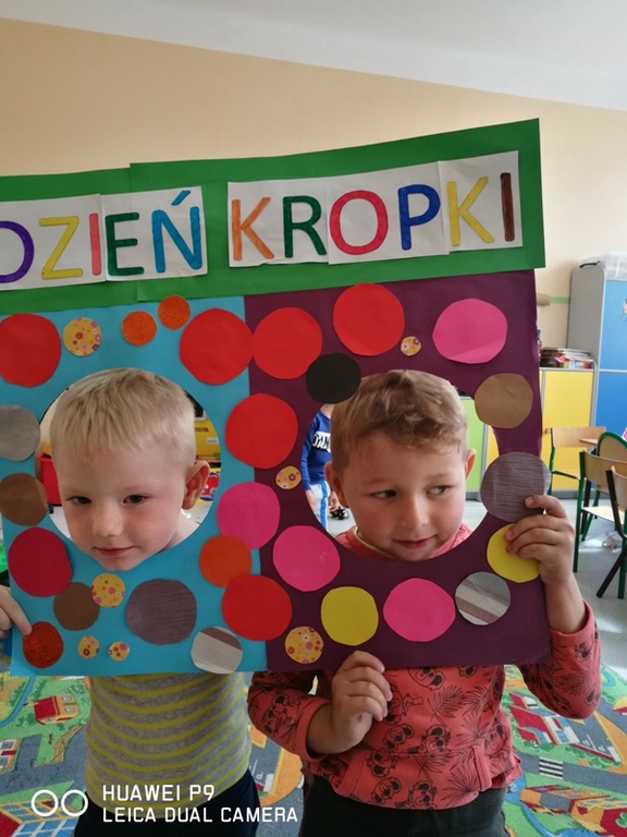 Tego dnia również dostrzegaliśmy kropki tam, gdzie wcześniej nikt na nie nie zwracał uwagi. Okazało się, że kropki towarzyszą nam w codziennym życiu. Są w literce "i”, kropkach biedronki, są w diamentowej koronie króla, a nawet zdobią kapelusz muchomora. Wspólnie z dziećmi ułożyliśmy też własną historię małej Kropki, a potem wykonaliśmy prace plastyczne, okleiliśmy opaski na głowy kolorowymi kropeczkami. Największą radość jednak sprawiło dzieciom ozdabianie fotobudki, w której zrobiliśmy sobie kropkowe zdjęcia.