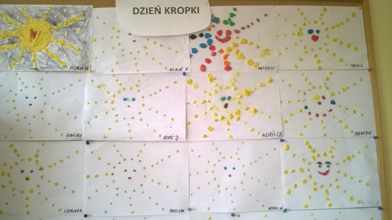 15 września Misie i Żuczki uroczyście obchodziły Międzynarodowy Dzień Kropki. Na zajęciach poznaliśmy genezę tego święta. Uważnie wysłuchaliśmy opowiadania, jak zwyczajna kropka zmieniła świat małej dziewczynki o imieniu Vashti. Historia ta uświadomiła przedszkolakom, że każdy z nas ma jakieś ukryte zdolności, talenty, które drzemią gdzieś głęboko i czekają na odkrycie.