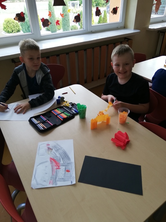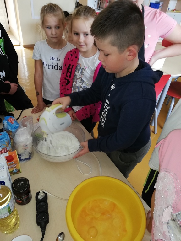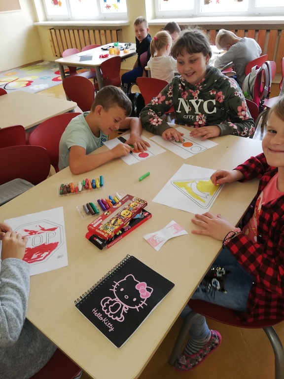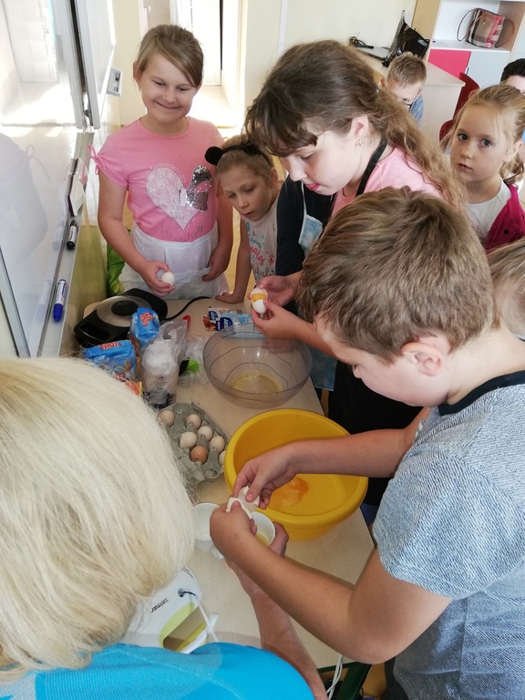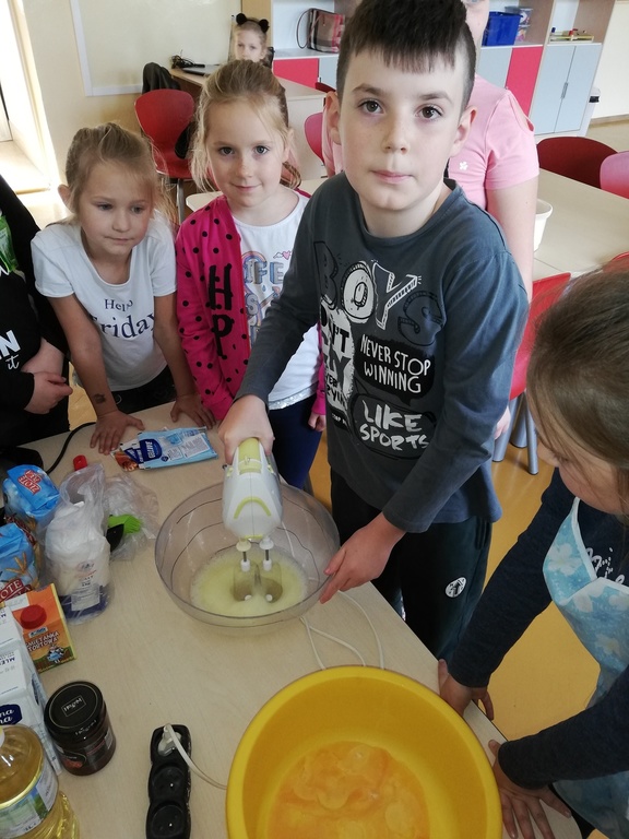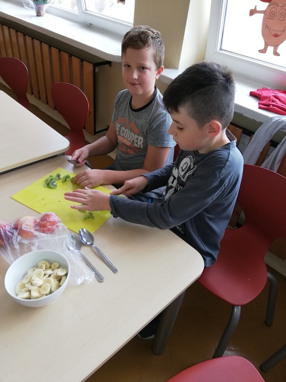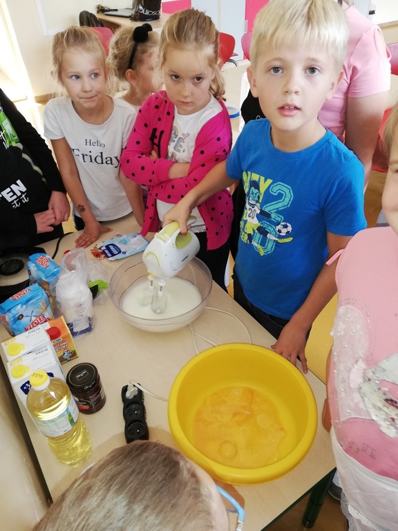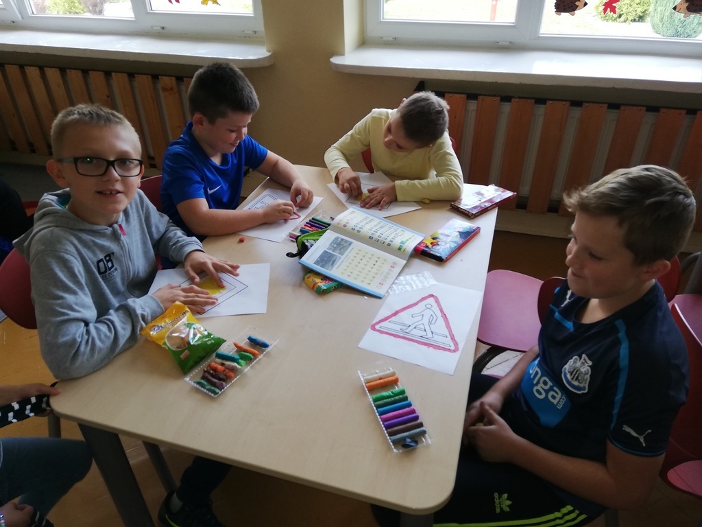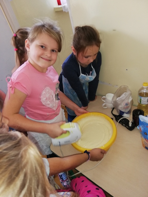 We wrześniu dużo uwagi poswięcono zagadnieniom bezpieczeństwu na drodze. Uczniowie przypomnieli sobie zasady ruchu drogowego, wygląd znaków drogowych oraz ich znaczenie. Wykonali znaki drogowe dwiema różnymi technikami. Uczniowie uwielbiają zajęcia kulinarne, dlatego też w październiku własnoręcznie zrobili pyszne gofry z dżemem i owocami. Dzieci z dużym zapałem wyrabiały ciasto, uczyły się oddzielać żółtka od białek oraz kroiły owoce. Było bardzo smacznie!