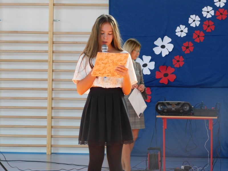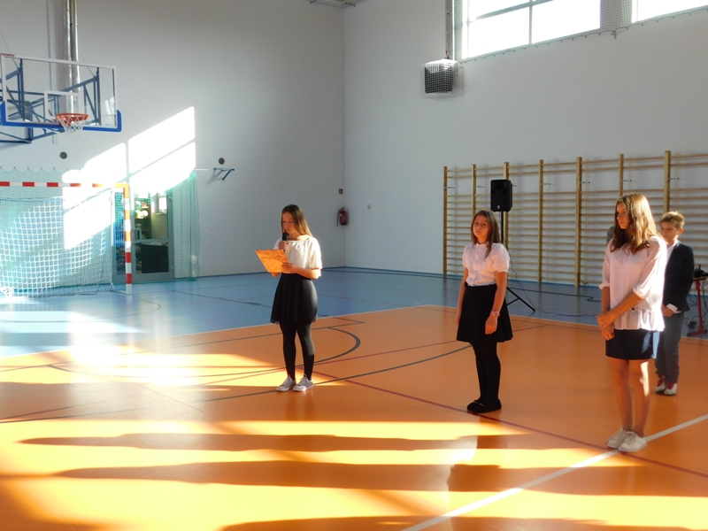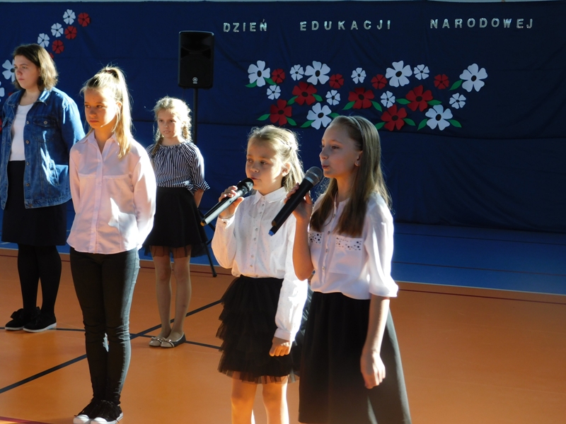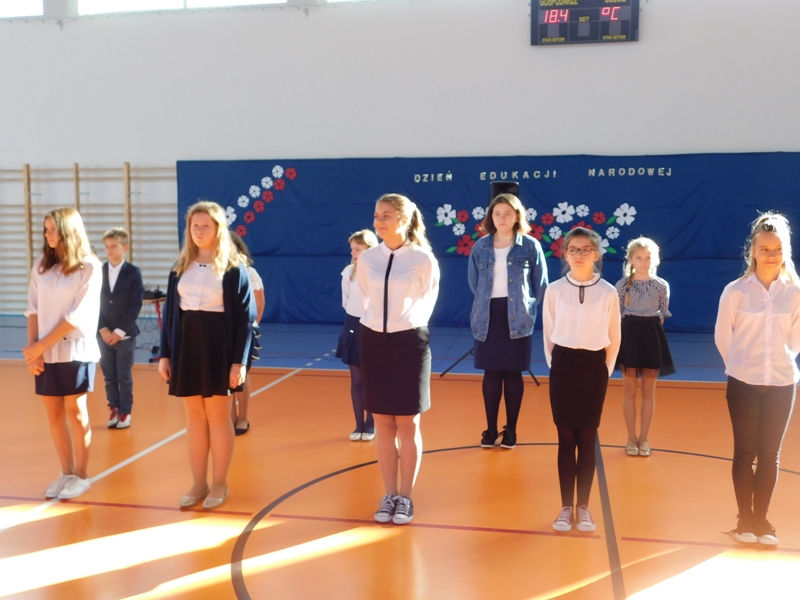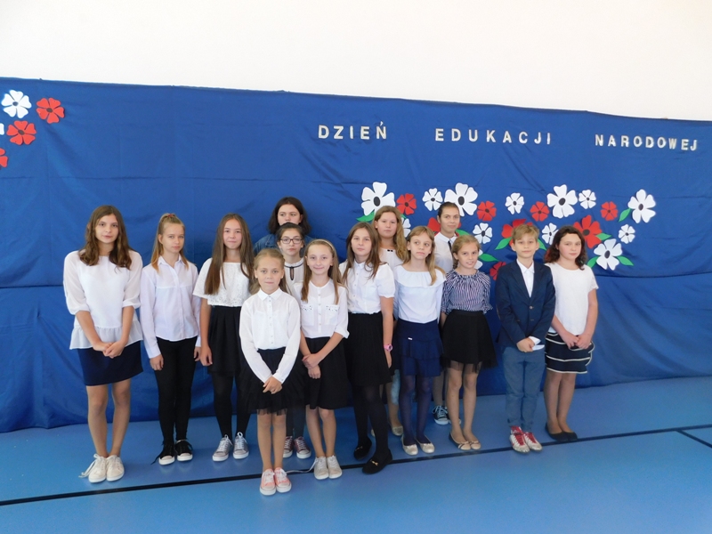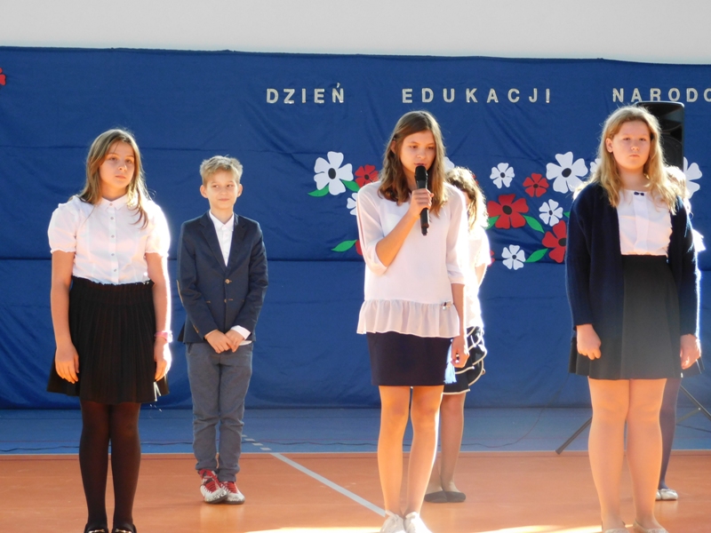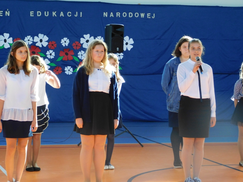 Życzenia dla pracowników pedagogicznych i niepedagogicznych szkoły złożyła Dyrektor Szkoły pani Małgorzata Sobień i przewodnicząca Rady SU Zuzanna Dudzik. Następnie uczniowie przybliżyli zgromadzonym genezę DEN. Dzień Edukacji Narodowej - zwany potocznie Dniem Nauczyciela - obchodzony jest w rocznicę powstania 14 października 1773 r. Komisji Edukacji Narodowej, pierwszego w Europie ministerstwa oświaty, która zajęła się reformowaniem szkolnictwa w Polsce.