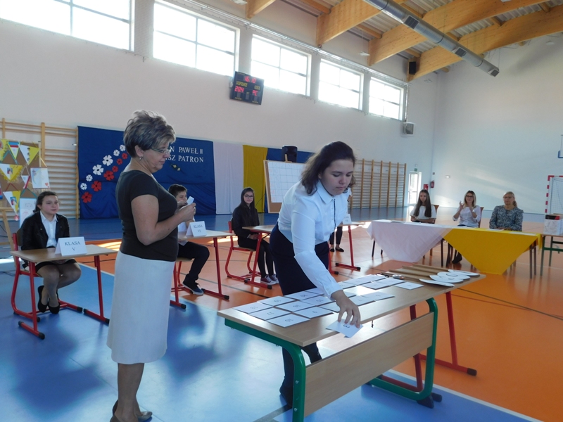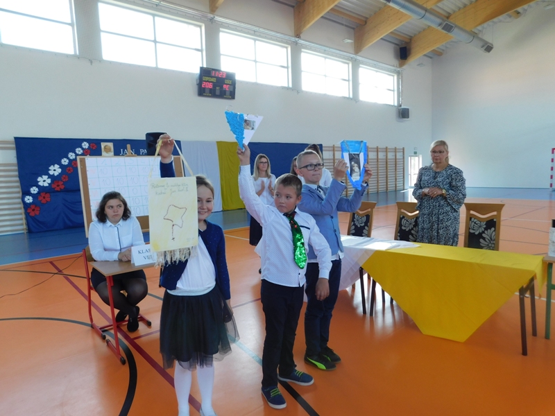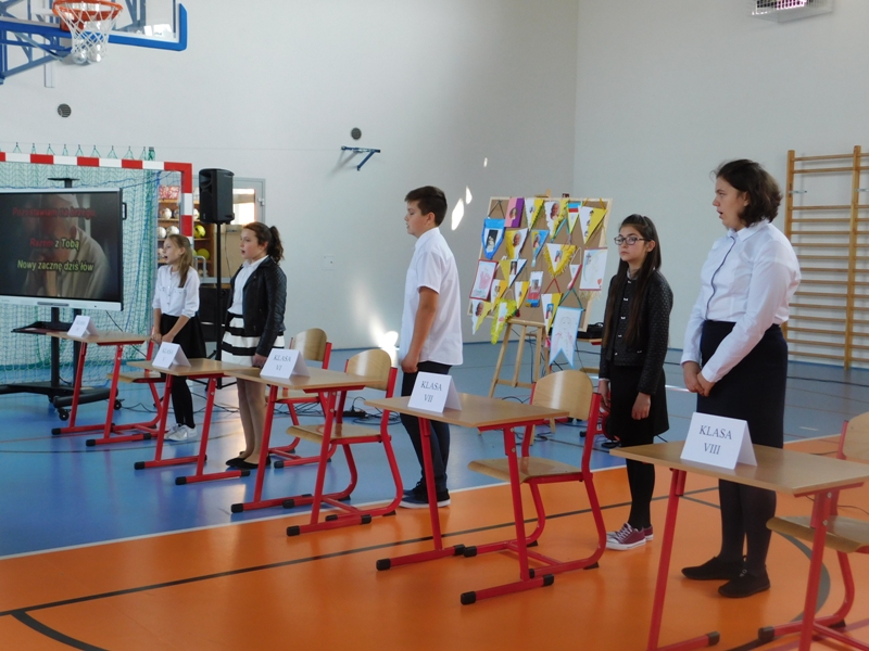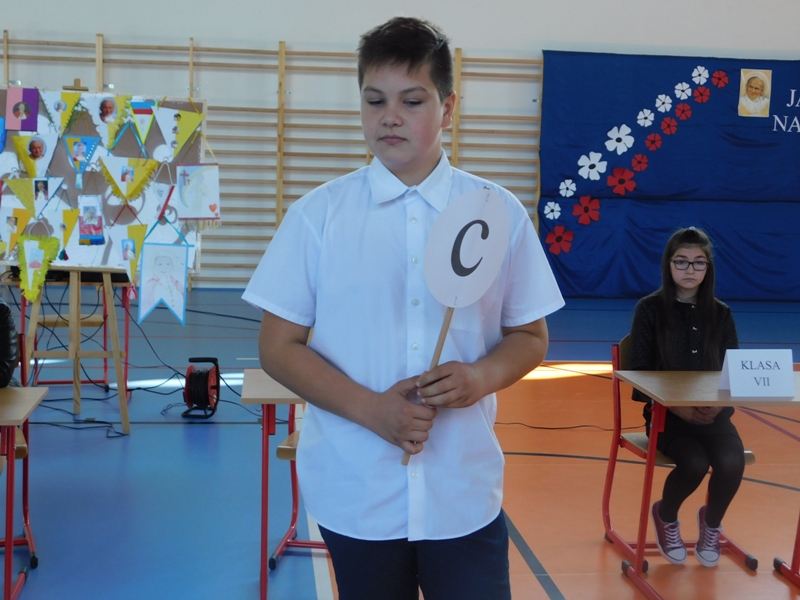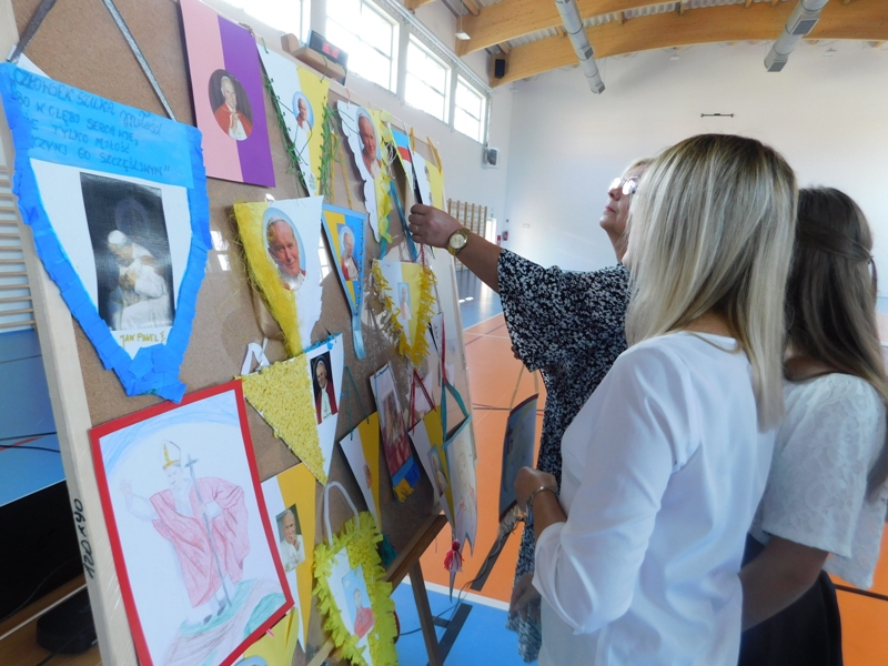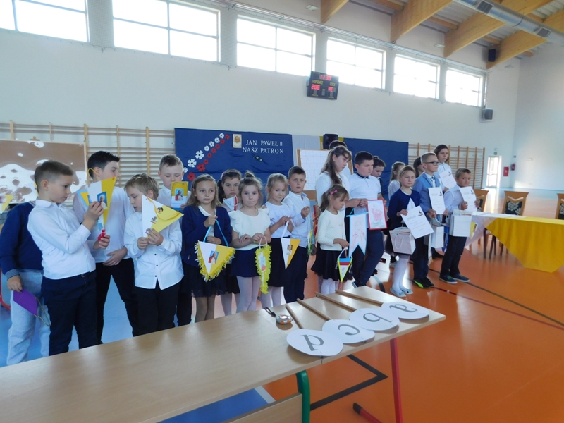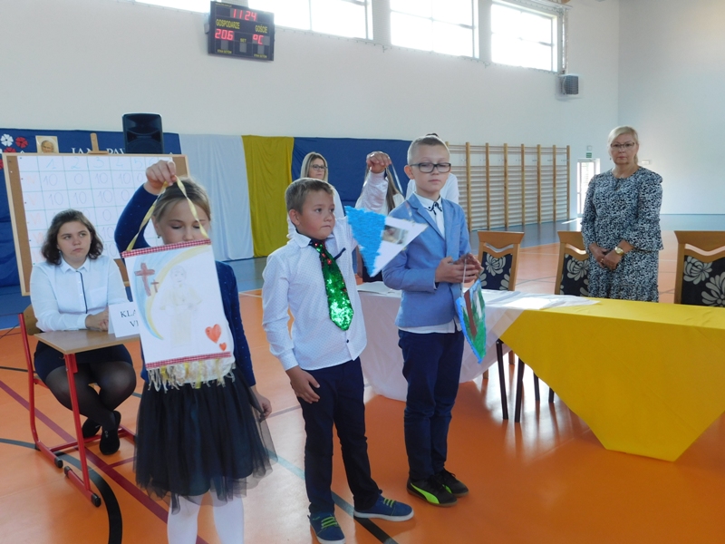 Uroczystość, upamiętniająca dzień wyboru Polaka na papieża, rozpoczęła się w naszej szkole w dniu 16 października od wprowadzenia Sztandaru Szkoły i odśpiewania Hymnu Szkoły. Po wyprowadzeniu sztandaru przystąpiono do przeprowadzeniu konkursu wiedzy o patronie naszej szkoły Janie Pawle II. Do komisji konkursowej zostały zaproszone panie: Dyrektor Szkoły – mgr Małgorzata Sobień, opiekun Samorządu Uczniowskiego – mgr Edyta Skrzypczyńska – Hernik, przewodnicząca Samorządu Uczniowskiego uczennica Zuzanna Dudzik.