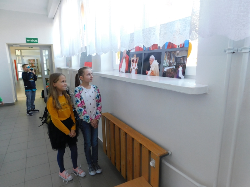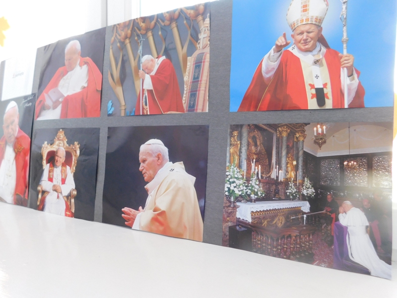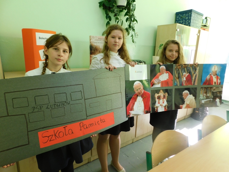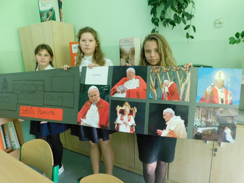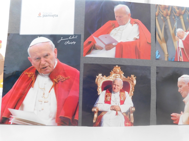 Uczniowie klasy VI zaplanowali projekt muralu oraz wykonali gazetkę ścienną – prace upamiętniające patrona naszej szkoły św. Jana Pawła II. Dodatkowo zobowiązali się posprzątać bezimienne i opuszczone mogiły. Zorganizowali zbiórkę kwiatów i zniczy, by udekorować te groby.