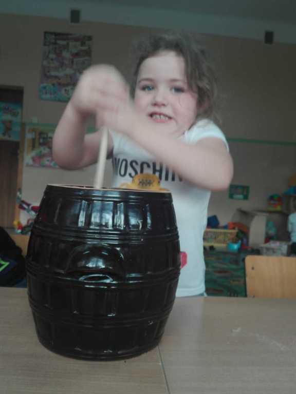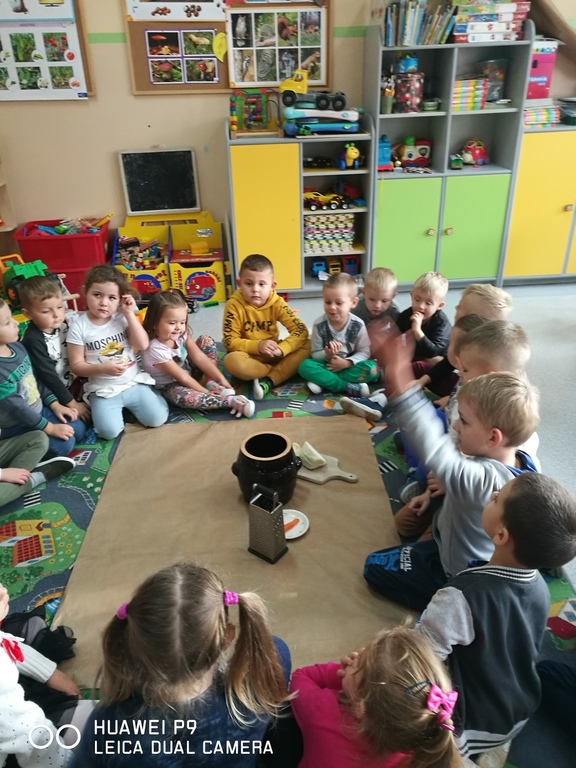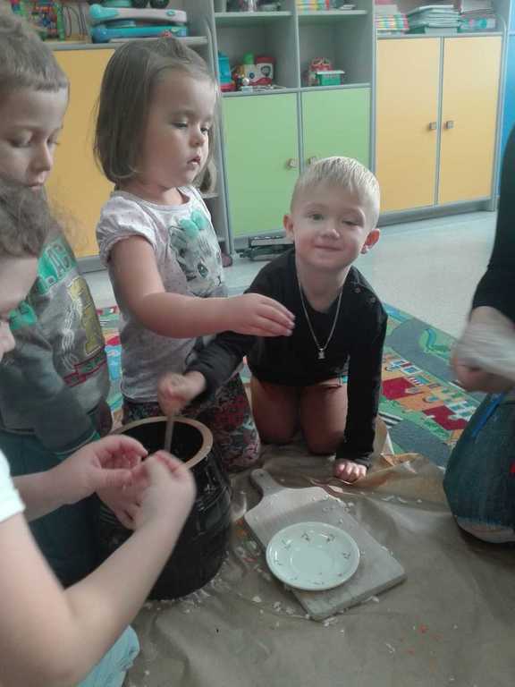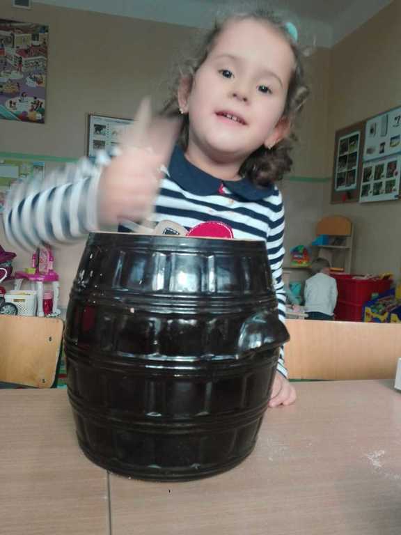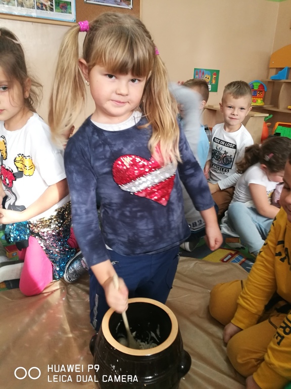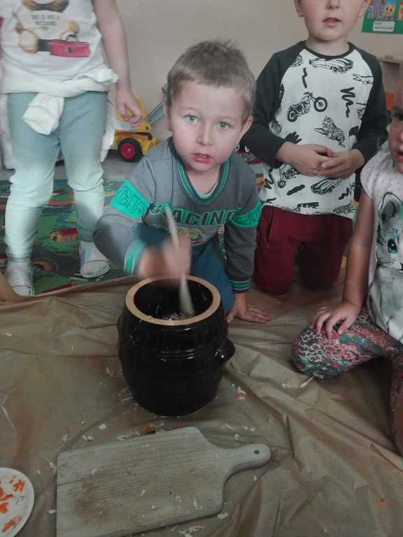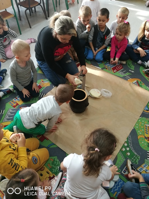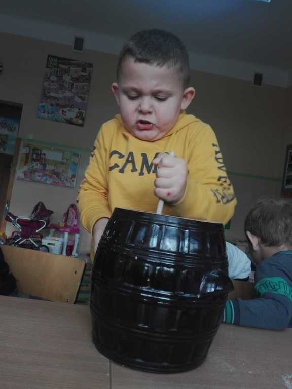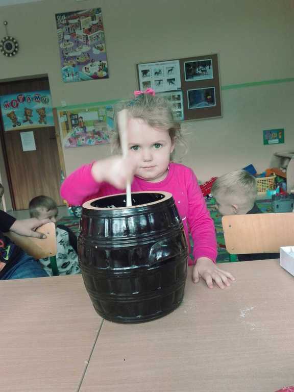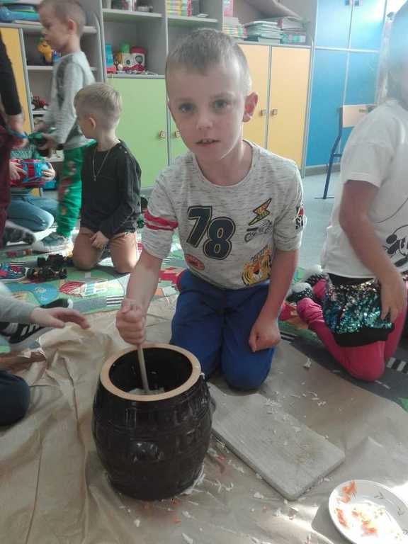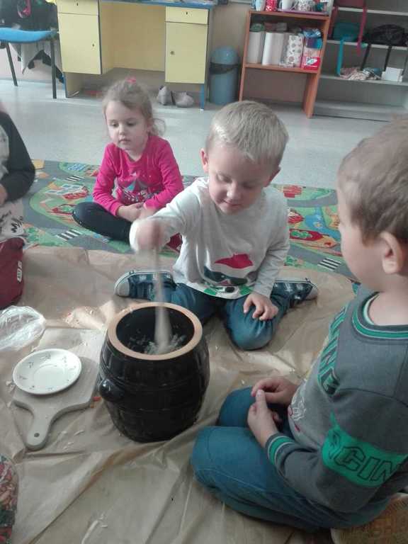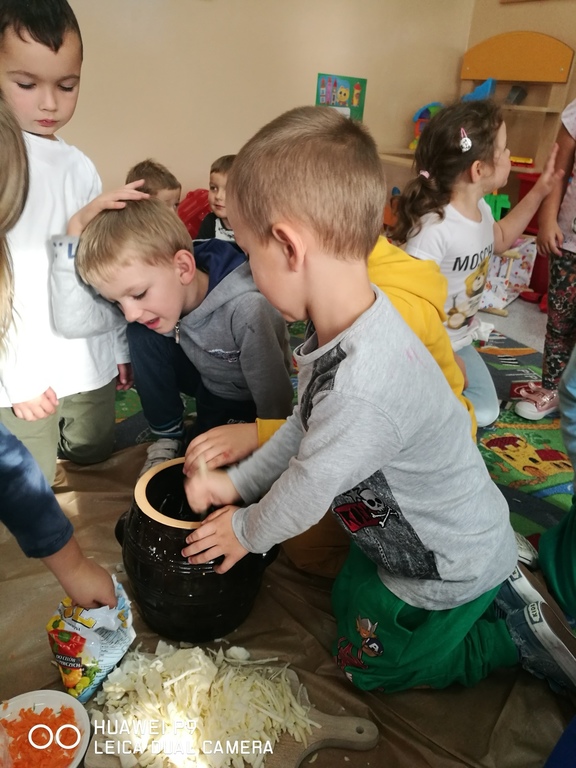 W drugiej części „ Misie" i „Żuczki” zapoznały się z etapami kiszenia kapusty oraz z przyprawami niezbędnymi do jej zakiszenia (tj. liść laurowy, ziele angielskie oraz sól). Następnie przygotowani do działań, przedszkolaki w mig zabrały się do pracy. Poszatkowaną kapustę wrzucały do przygotowanego w tym celu naczynia, a także marchew i przyprawy. Oczywiście każdą warstwę posypywały solą. Należy wspomnieć, że dzieciaki nie zapominały o jej dokładnym ugnieceniu tak, aż kapusta puściła sok. Z kolei naczynie zostało umieszone w kąciku przyrody, gdzie dzieci będą mogły obserwować proces kiszenia.