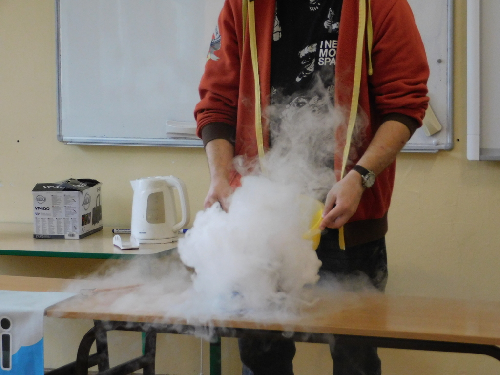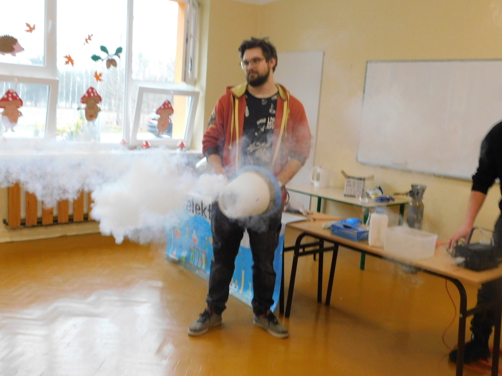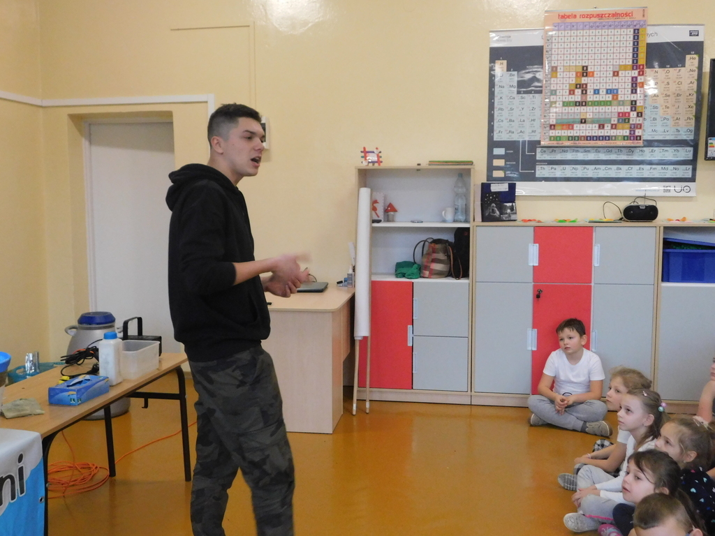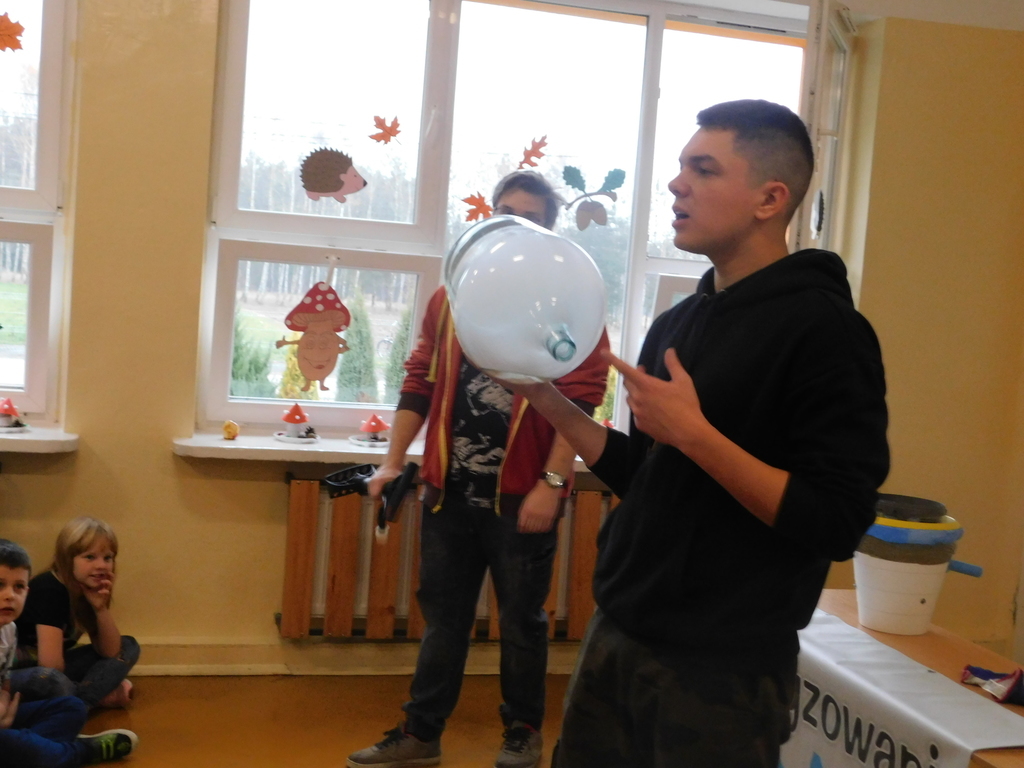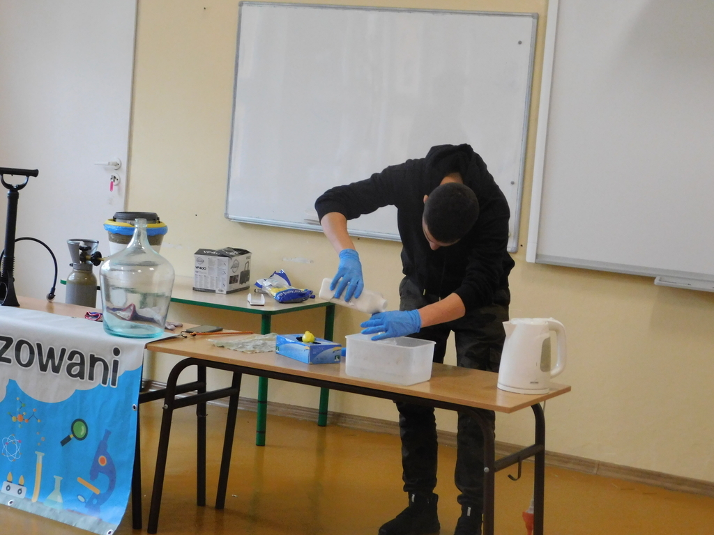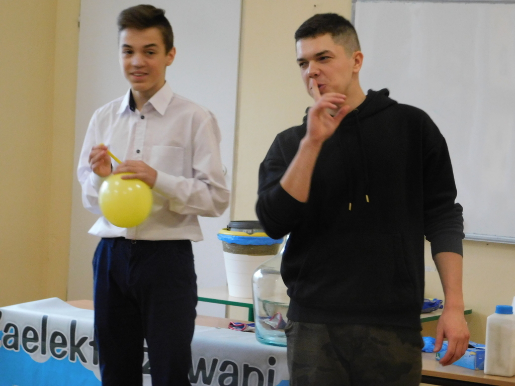 Podczas tej niecodziennej lekcji nasi goście zaprezentowali widowiskowe eksperymenty i doświadczenia związane z naukami przyrodniczymi. Wśród nich znalazły się: wybuchowa zabawa z wodorem, oddziaływanie helu na nasz głos, kolorowy test .