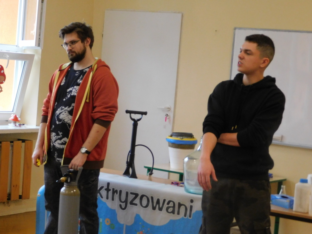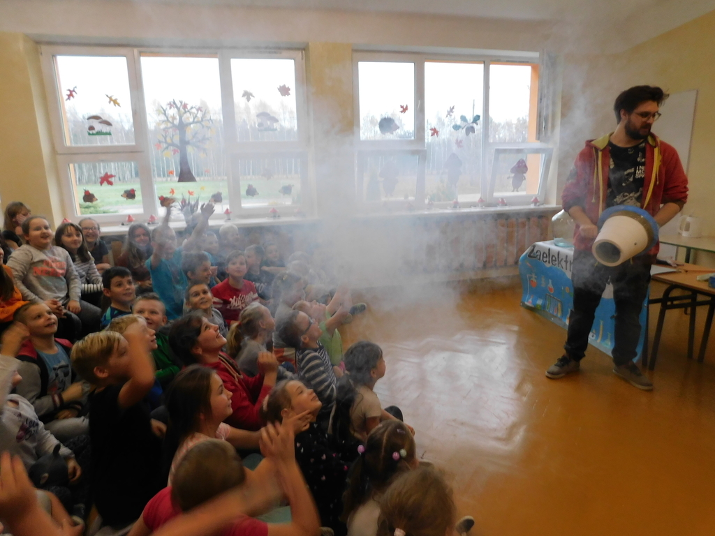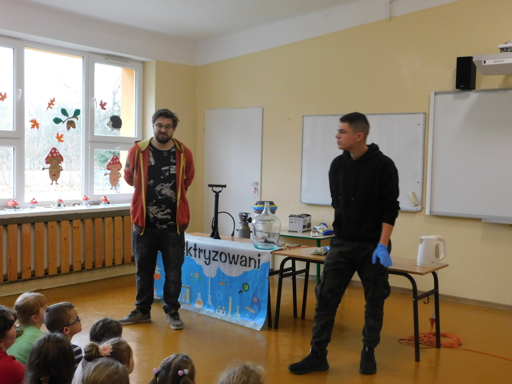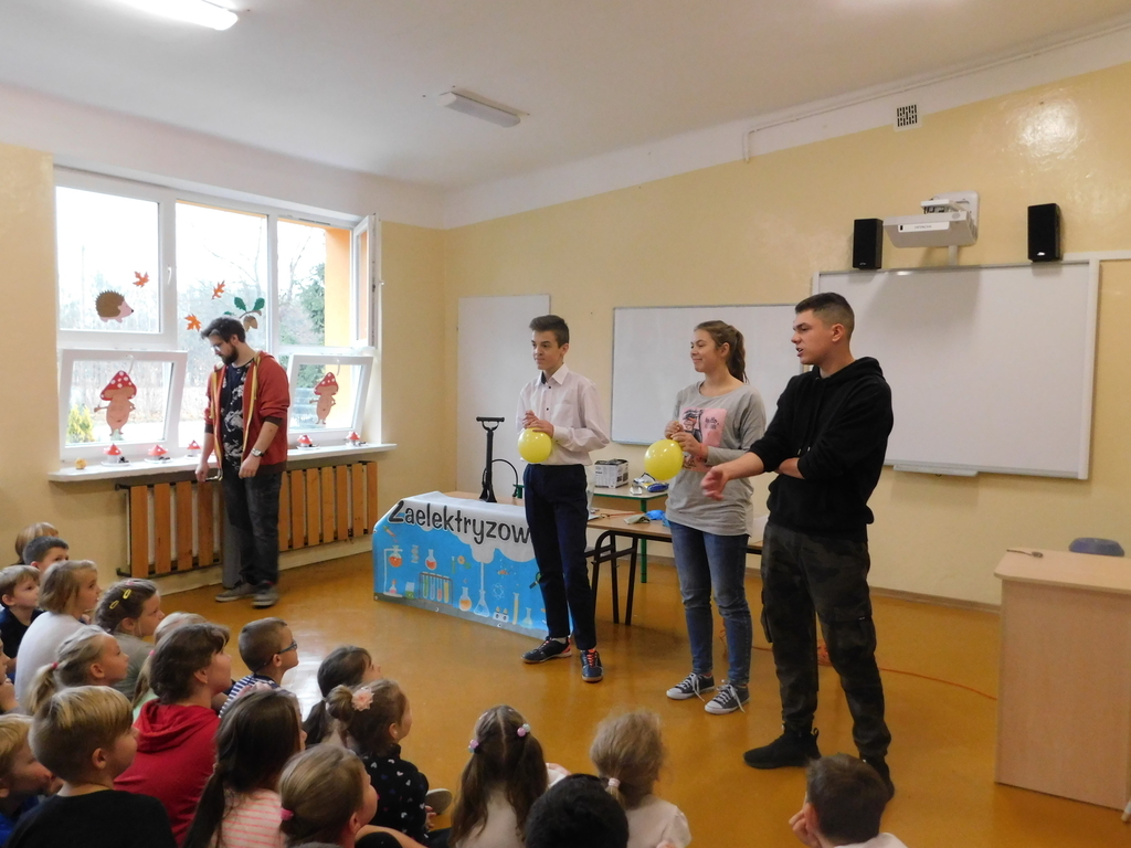 20 listopada 2019 r. do naszej szkoły przyjechali animatorzy z lubelskiej grupy „Zaelektryzowani” . Panowie Bartek i Patryk zaprezentowali interaktywny spektakl pt. „Fizyka wszędzie styka”. Celem pokazu było przybliżenie uczniom tajników fizyki i chemii w prosty, atrakcyjny i zrozumiały dla najmłodszych i najstarszych sposób.