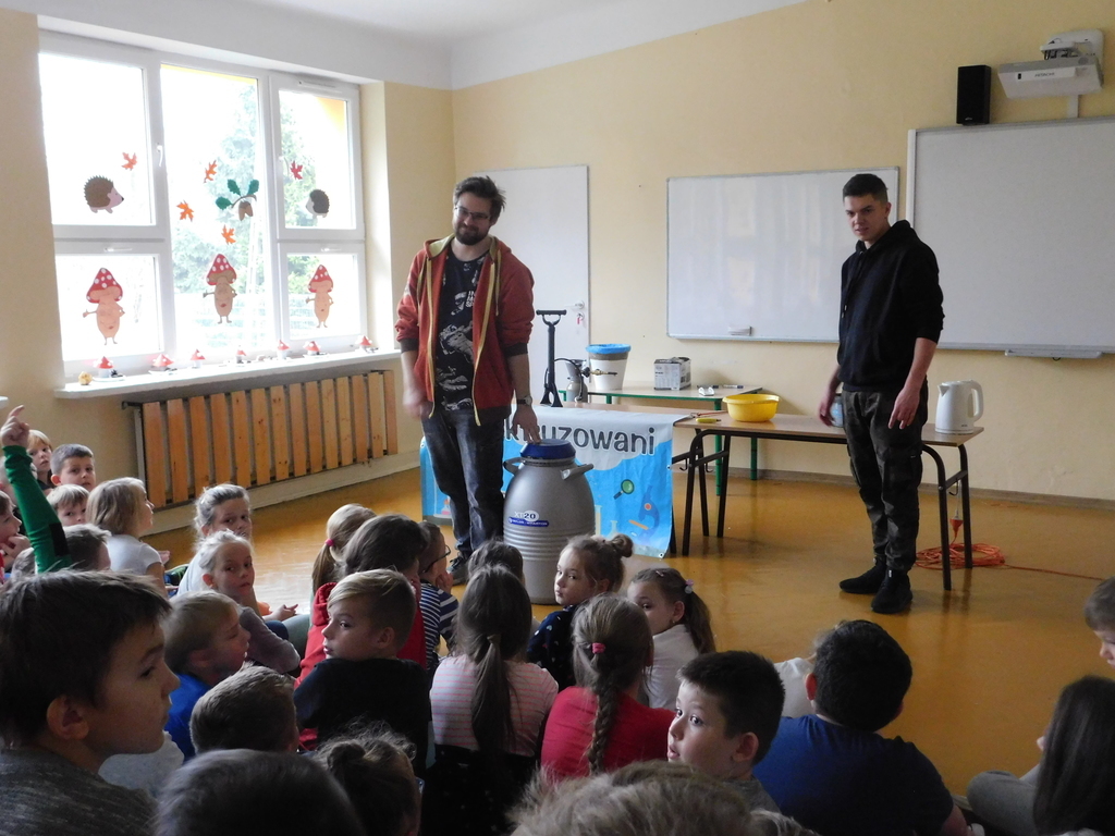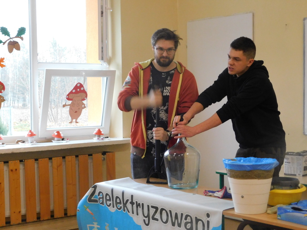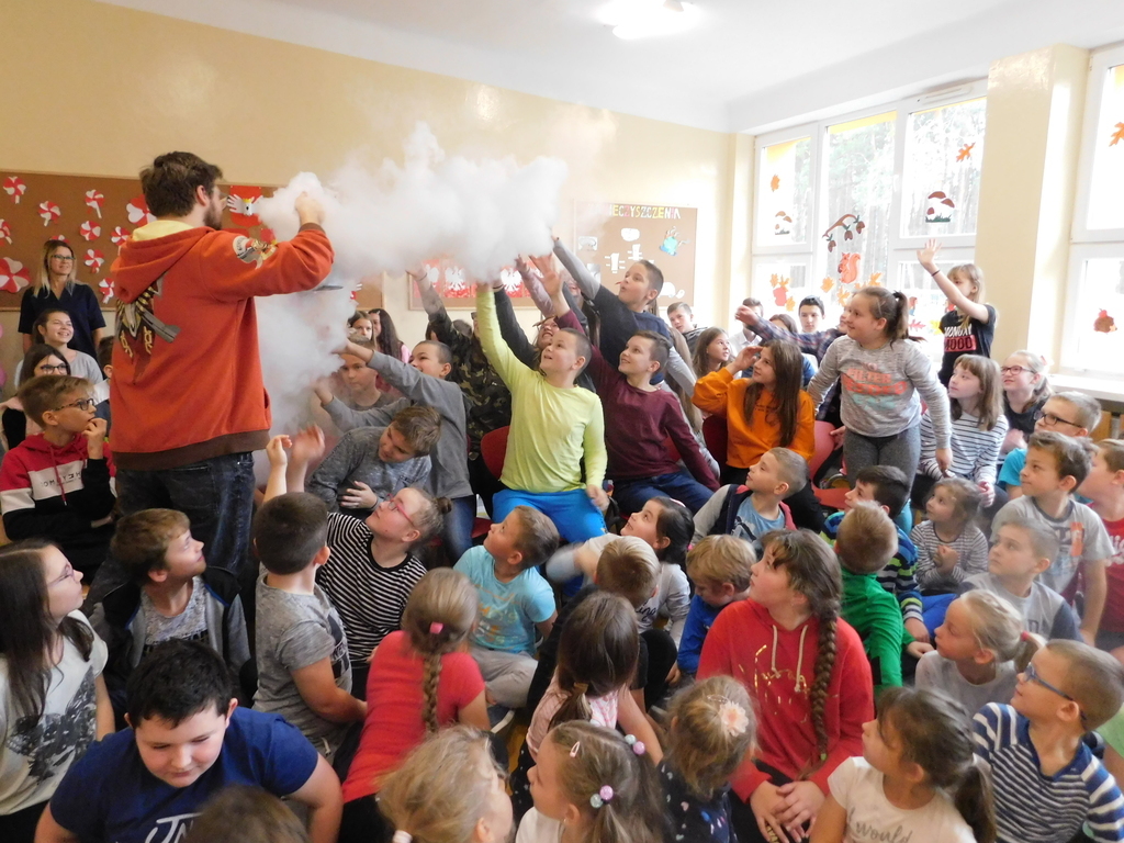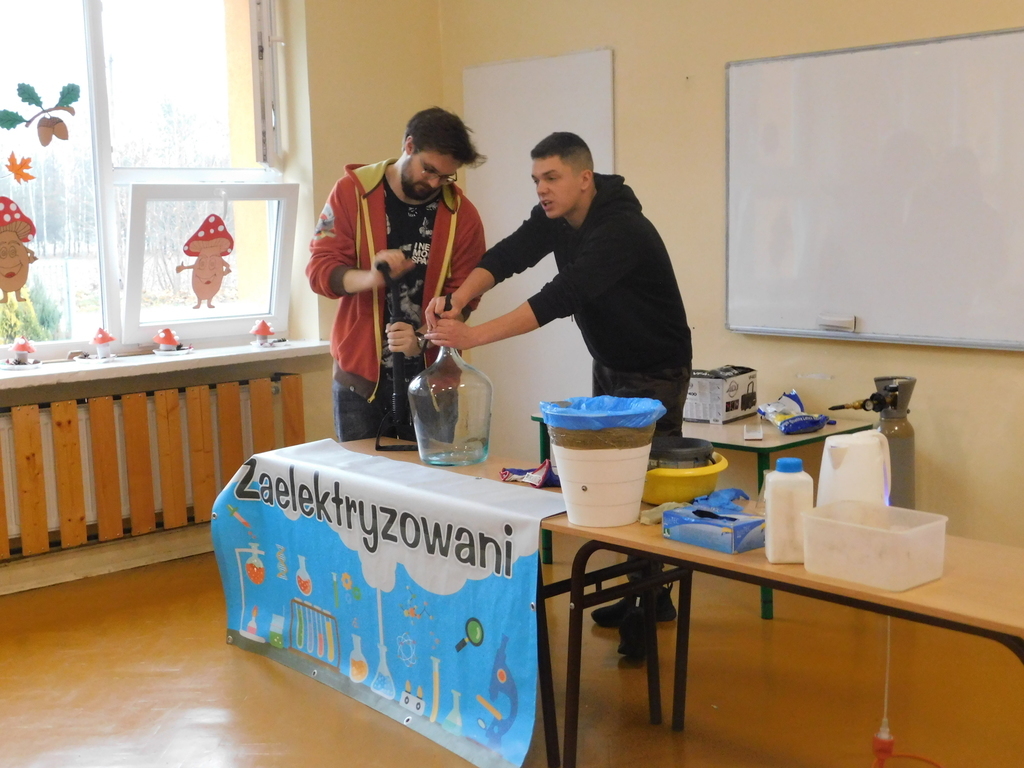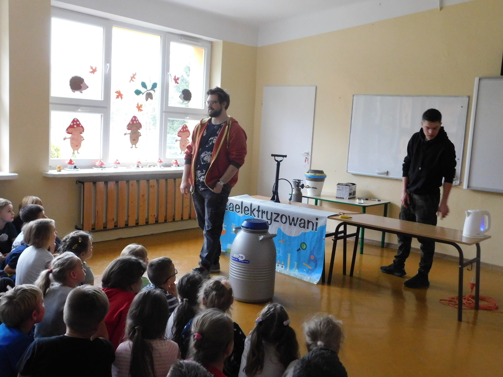 20 listopada 2019 r. do naszej szkoły przyjechali animatorzy z lubelskiej grupy „Zaelektryzowani” . Panowie Bartek i Patryk zaprezentowali interaktywny spektakl pt. „Fizyka wszędzie styka”. Celem pokazu było przybliżenie uczniom tajników fizyki i chemii w prosty, atrakcyjny i zrozumiały dla najmłodszych i najstarszych sposób.