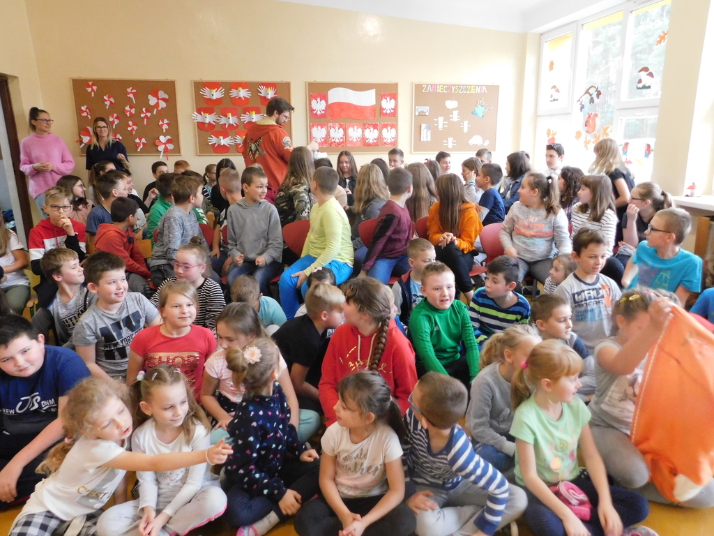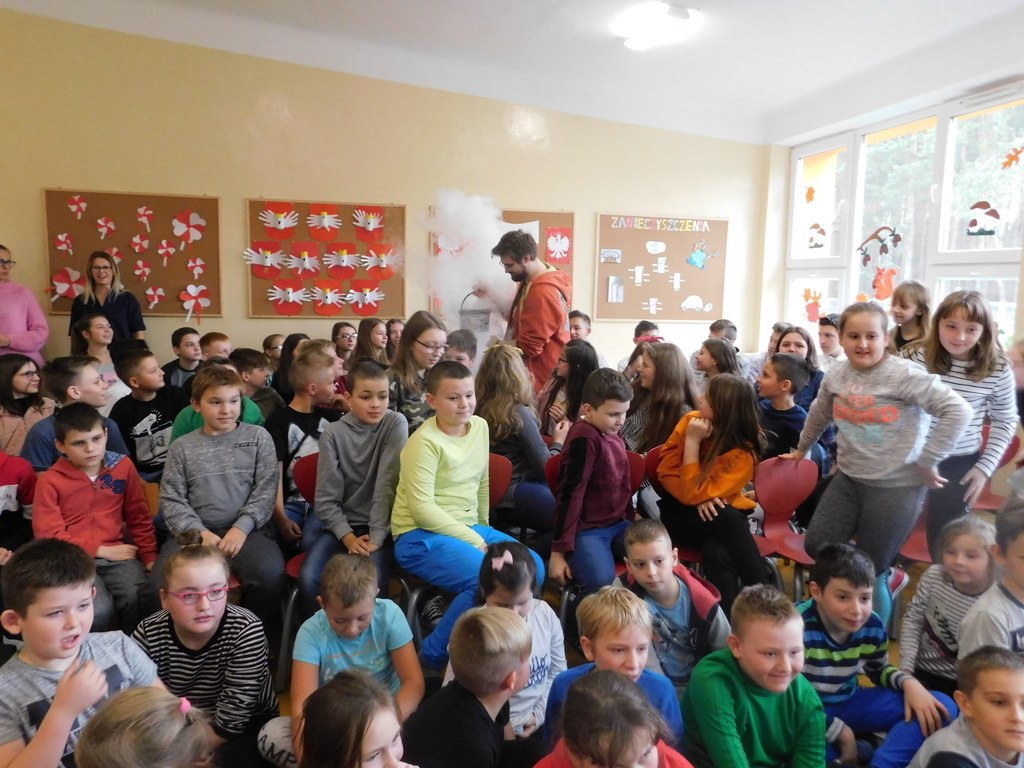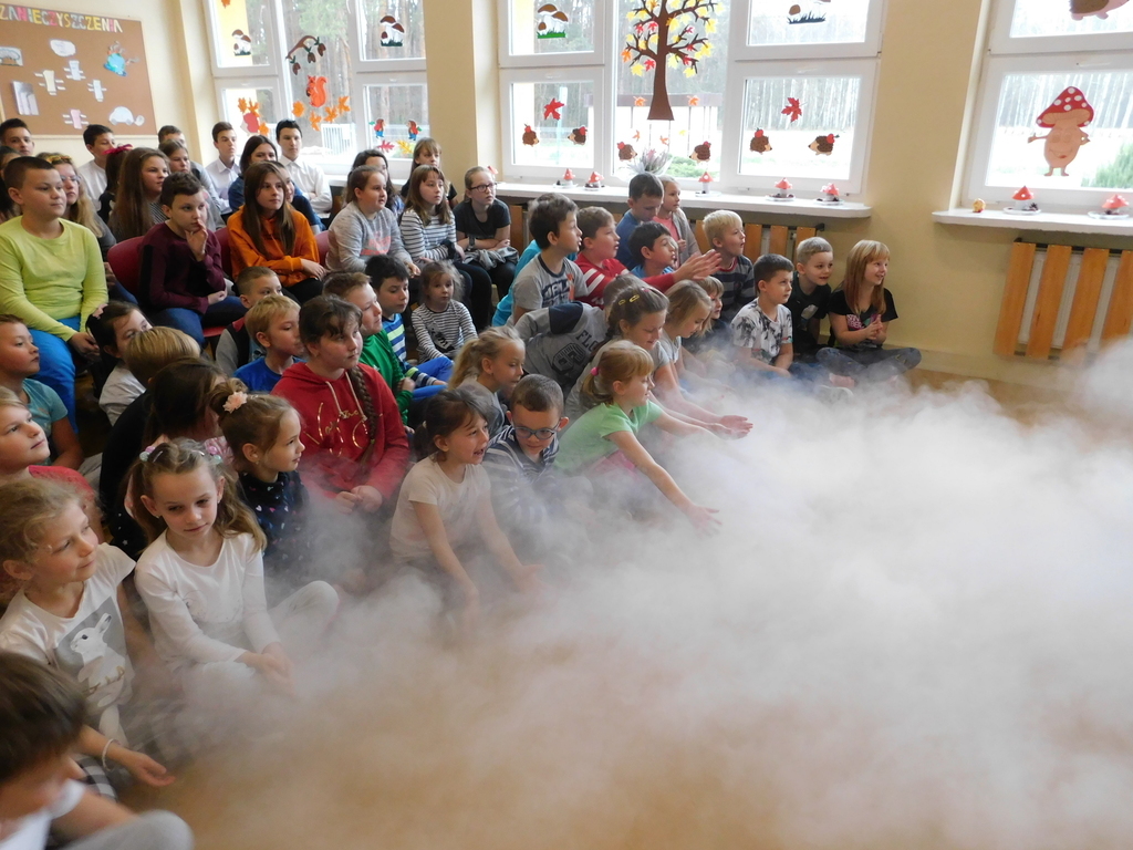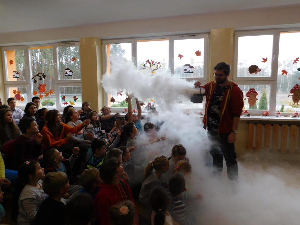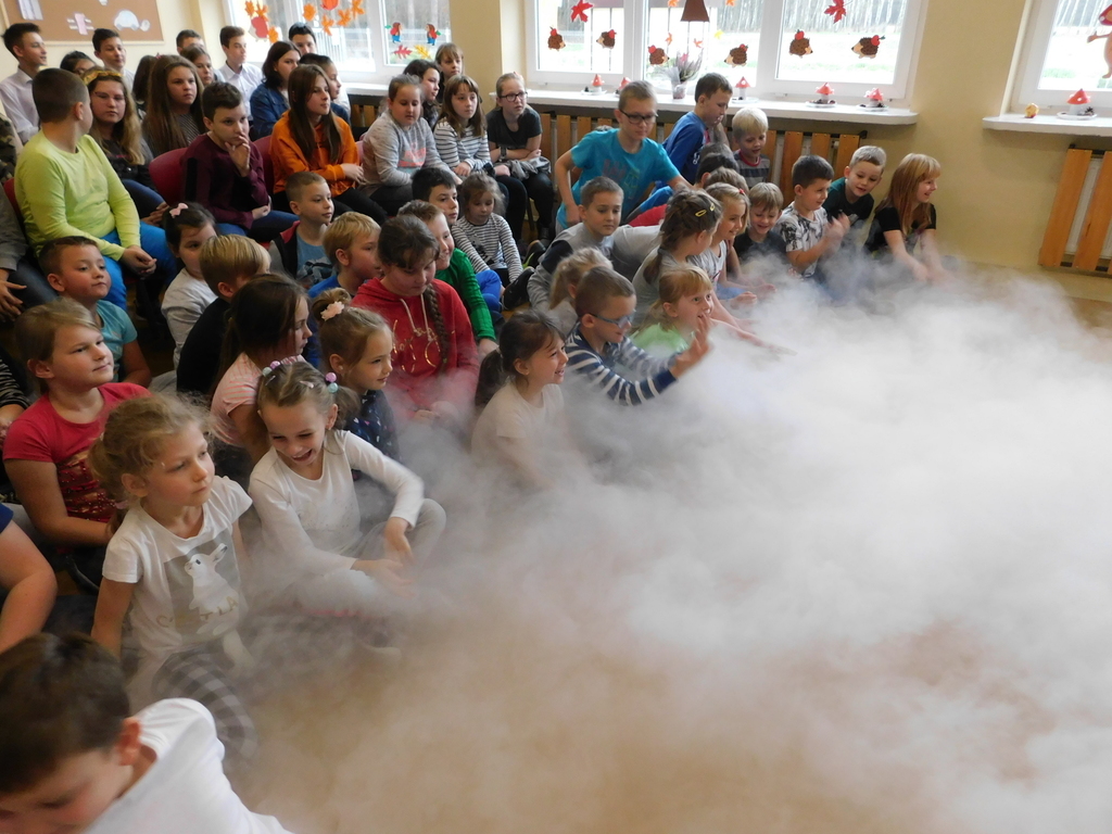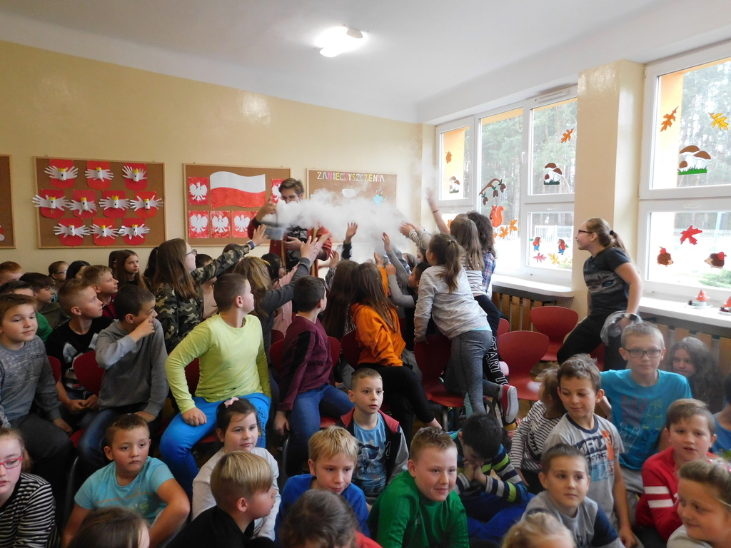 Dużą atrakcją dla naszych uczniów była możliwość aktywnego uczestnictwa w pokazie. Animatorzy zadbali o to, aby nikt na widowni się nie nudził. Wielokrotnie zwracali uwagę na kwestie bezpieczeństwa przy samodzielnej próbie wykonywania doświadczeń.