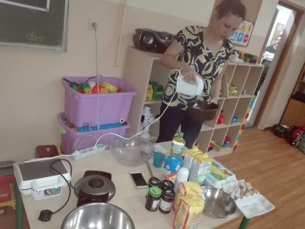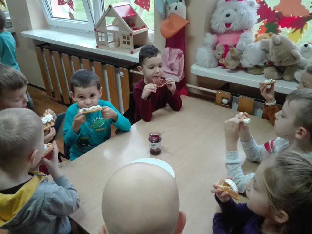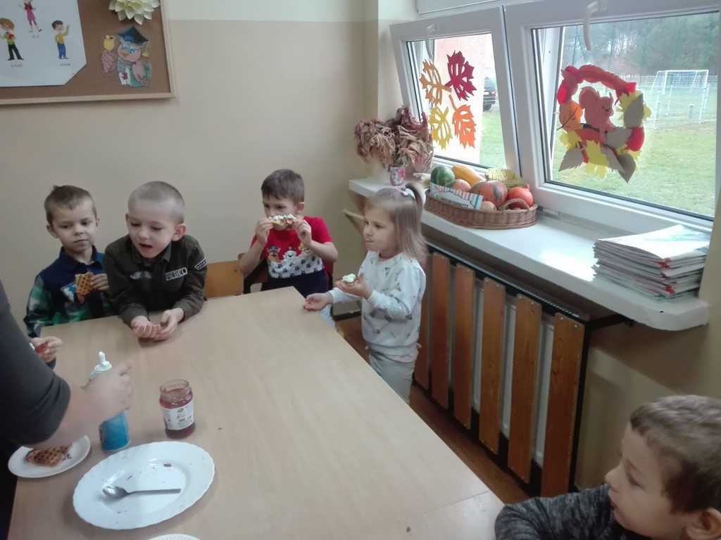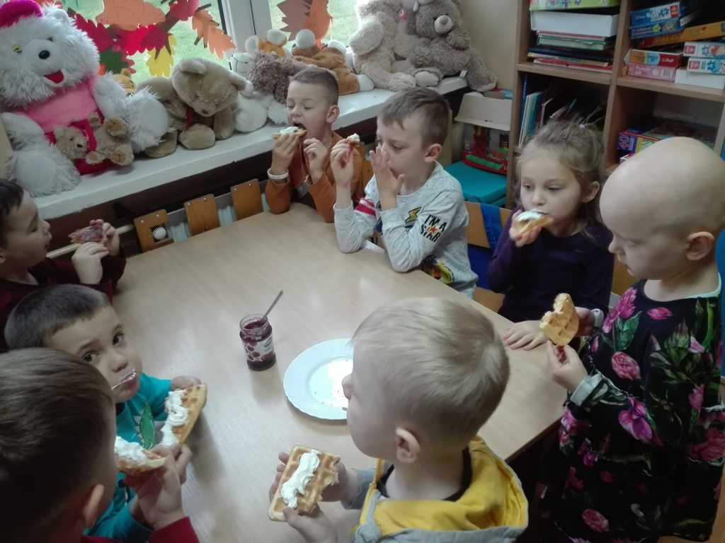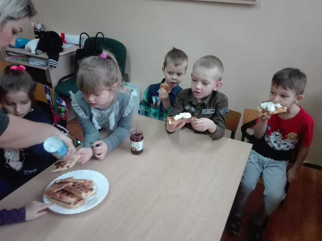 21 listopada dzieci z oddziałów przedszkolnych „Miś” i „Wesołe Żuczki” uczestniczyły w zajęciach, na których były pieczone gofry. Poznały składniki i sposób wykonywania tego smakołyku. Razem z paniami wyrabiały ciasto, następnie obserwowały wypiek gofrów. Po upieczeniu nastąpił długo oczekiwany moment – wspólny poczęstunek. Każdy mógł sam zdecydować z czym będzie je jadł. Gofry były tak pyszne, że prawie każdy prosił o dokładkę, a w całej szkole unosił się piękny zapach wypieków!