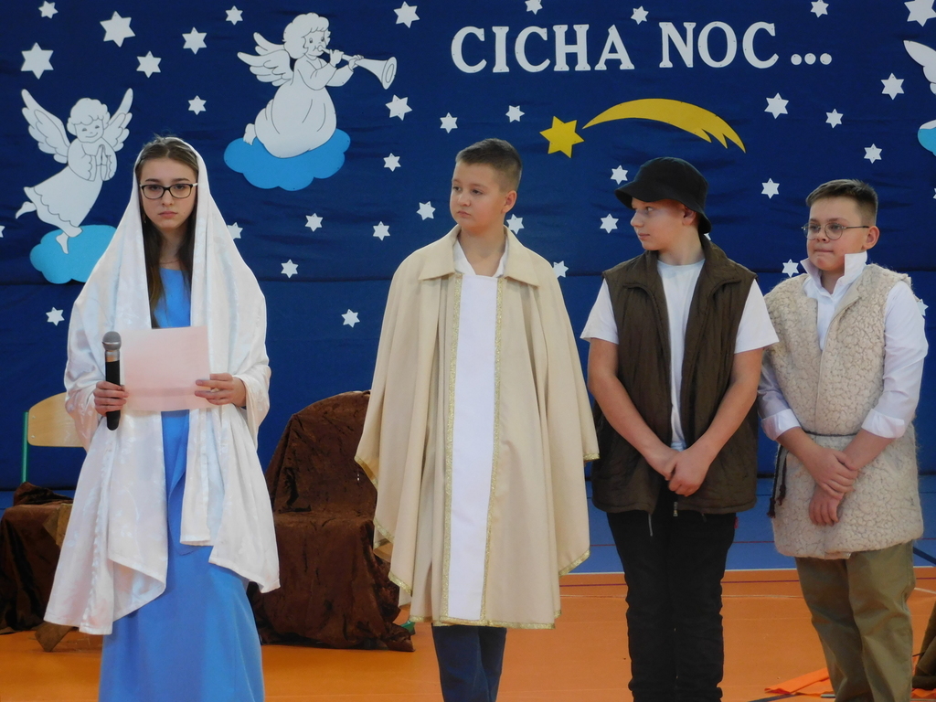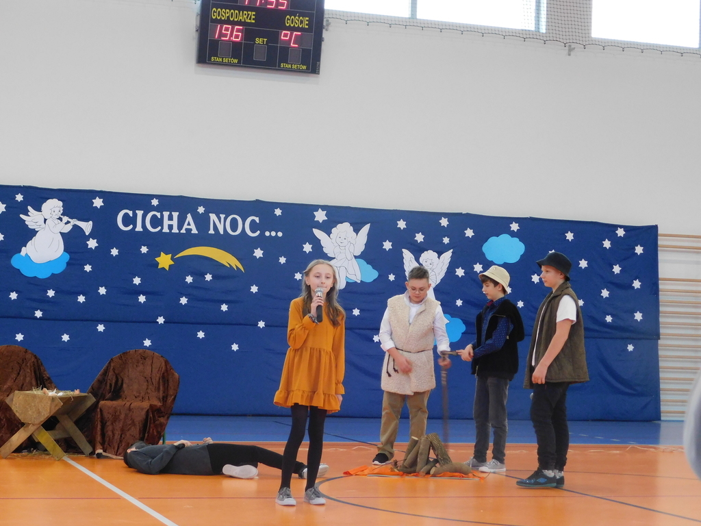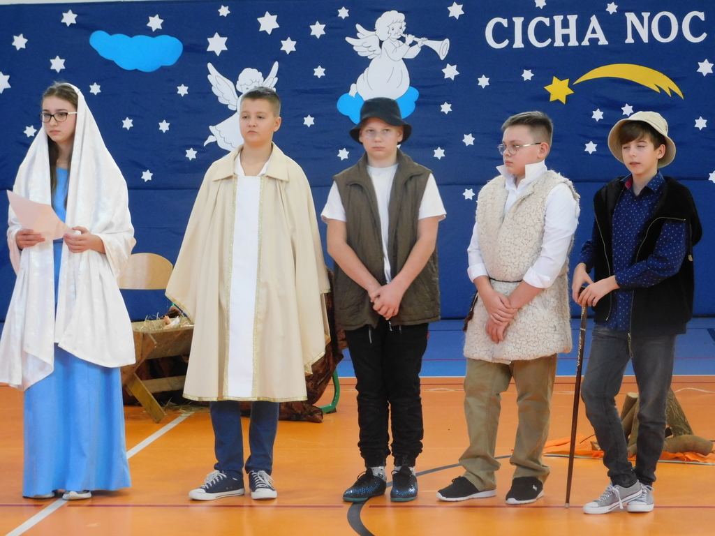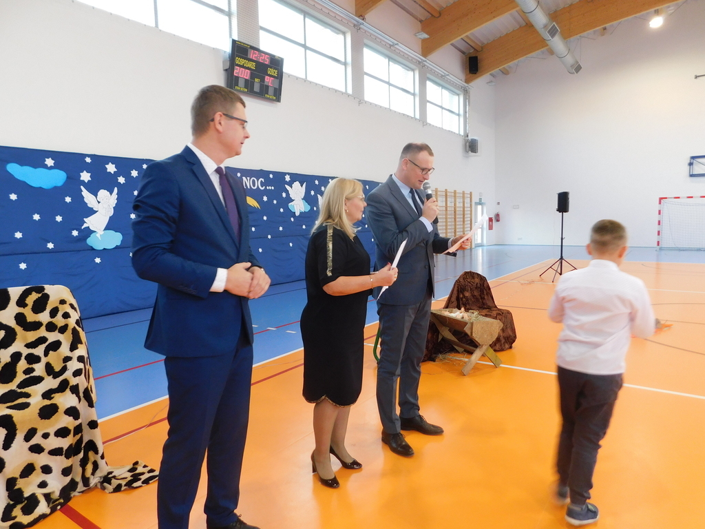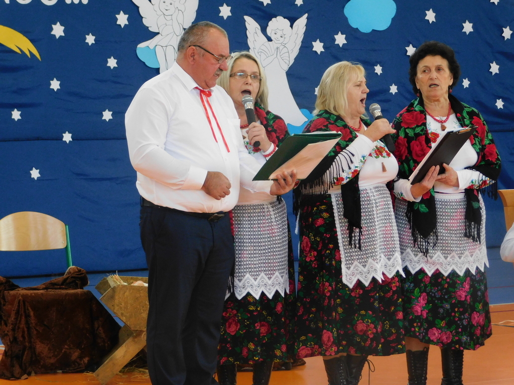 Następnie odbyły się jasełka, które przygotowali uczniowie klas IV, VII i VIII pod kierunkiem pani Beaty Nowak i pana Dariusza Makarewicza. Wzruszającą kolędę „Nie było miejsca dla Ciebie” śpiewała Julia Walczak, która