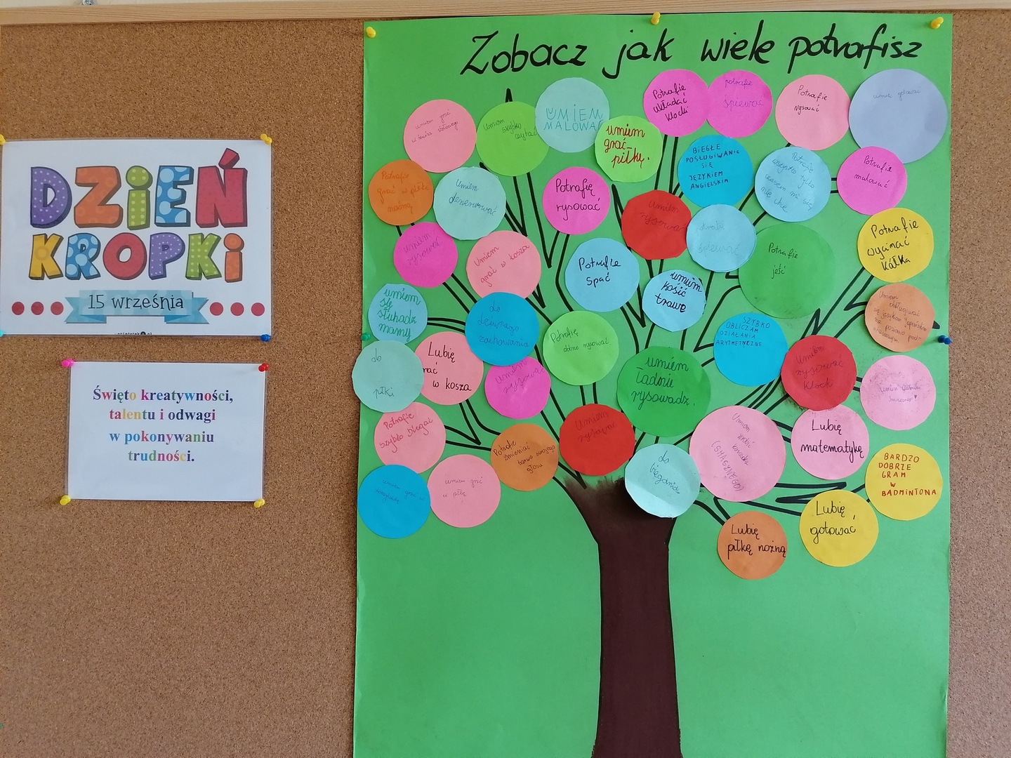 Zrealizowaliśmy wiele tematów dotyczących bezpieczeństwa dzieci na drodze. Uczniowie wykonali sygnalizację świetlną oraz zapoznali się z wieloma znakami drogowymi. Wspólnie wykonaliśmy smaczny i zdrowy sorbet truskawkowy. Jak zwykle podczas zajęć kulinarnych dzieci wykazały się dużym zaangażowaniem. Celebrowaliśmy międzynarodowy dzień kropki. Z tej okazji uczniowie wykonali „Drzewo osiągnięć”- umieszczając na nim swoje umiejętności i talenty.