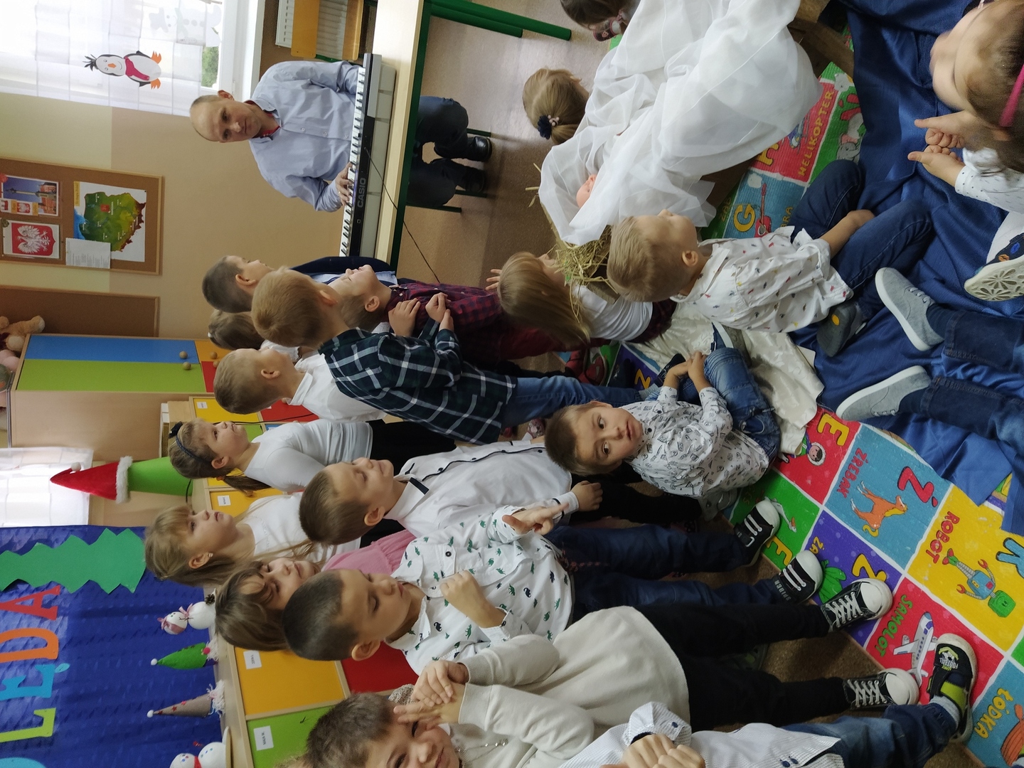 Święta Bożego Narodzenia są najpiękniejszymi świętami, na które czekają nie tylko dzieci, ale i dorośli. Są to święta najbliższe i najdroższe naszym sercom, gdyż towarzyszy im niepowtarzalna atmosfera. Jest to również okazja do wspólnego kolędowania. Taki radosny i świąteczny nastrój zapanował w naszej szkole 22 grudnia. Obie grupy przedszkolne zaprezentowały swoje umiejętności wokalne. Wspólne kolędowanie przyczyniło się do integracji dzieci oraz pielęgnacji polskiej tradycji.