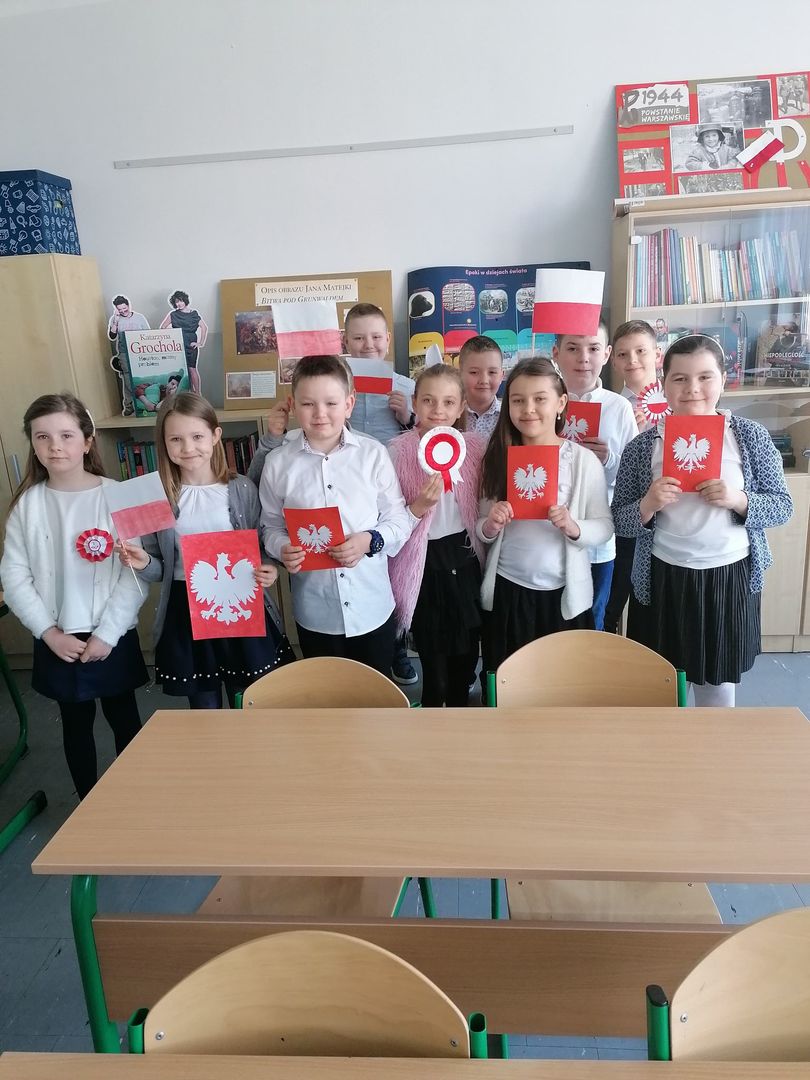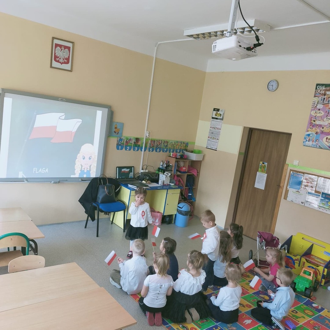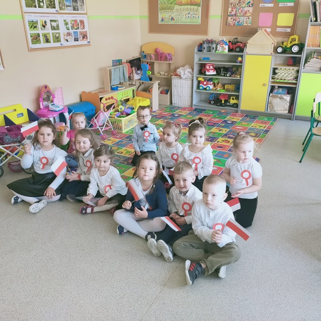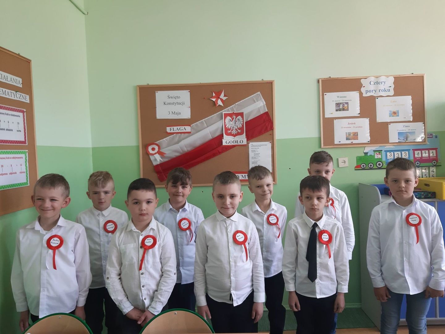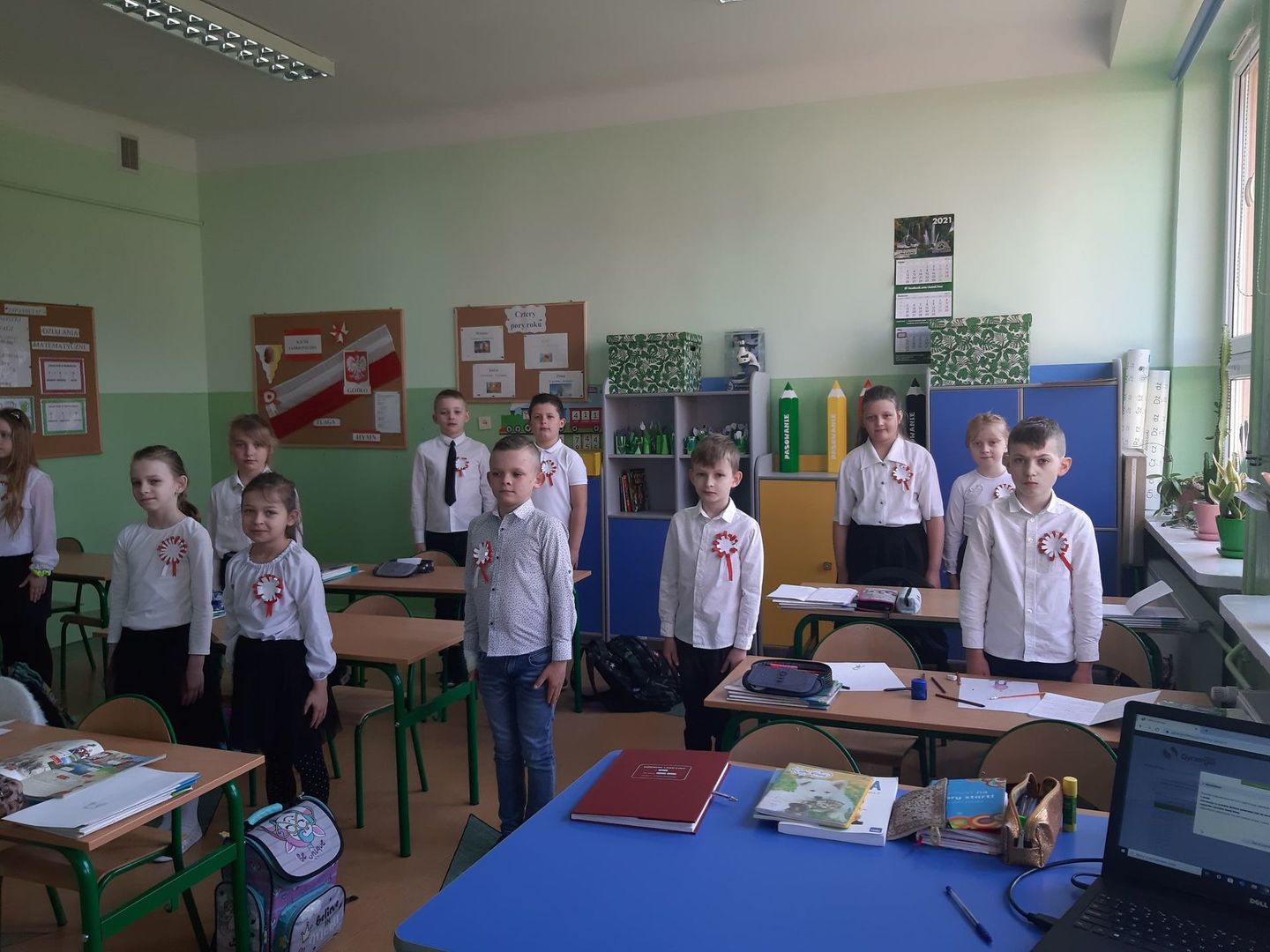 Dzieci z oddziałów przedszkolnych oraz klas I-III odśpiewały hymn państwowy oraz obejrzały prezentację na temat uchwalenia Konstytucji 3 maja.