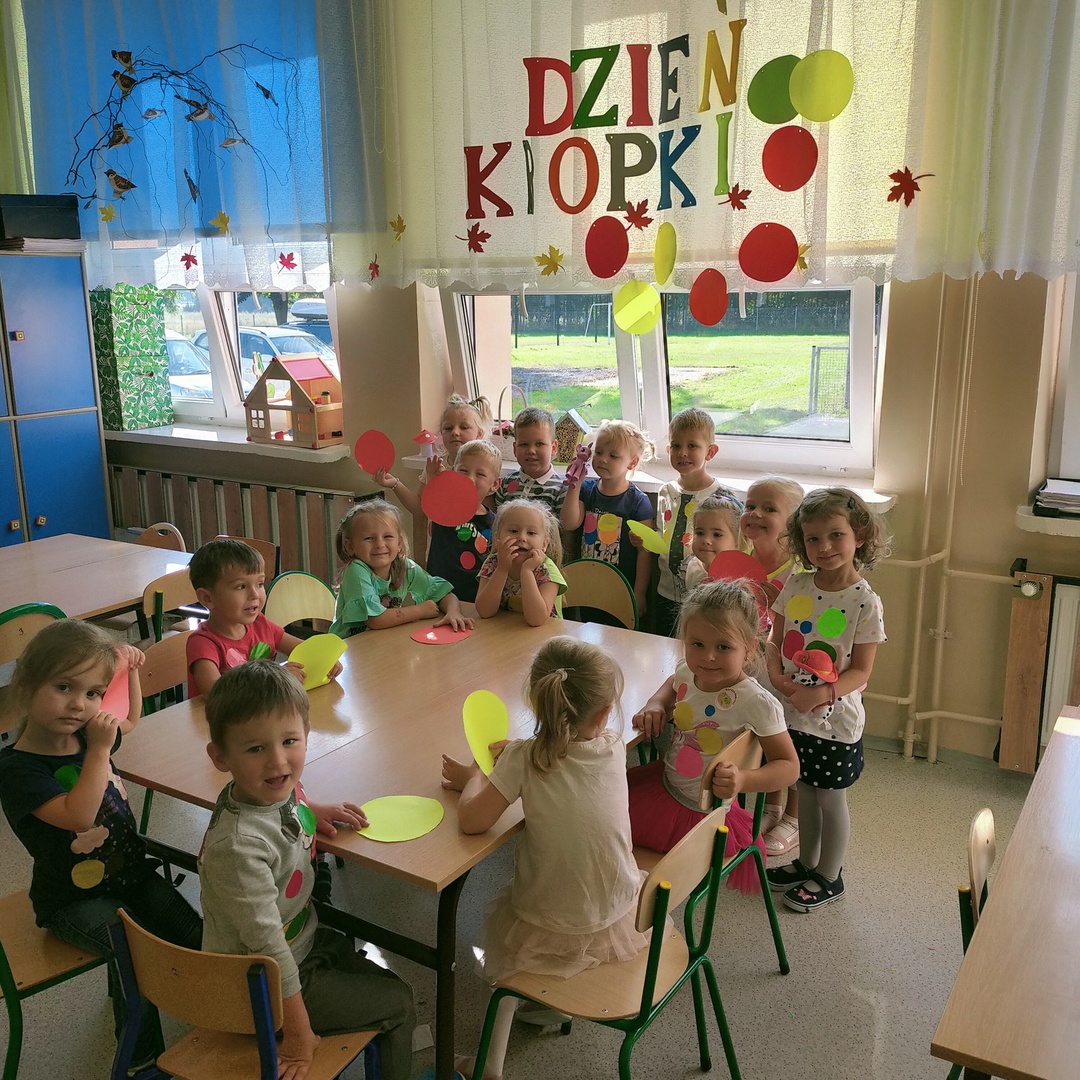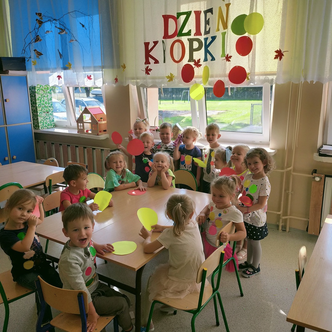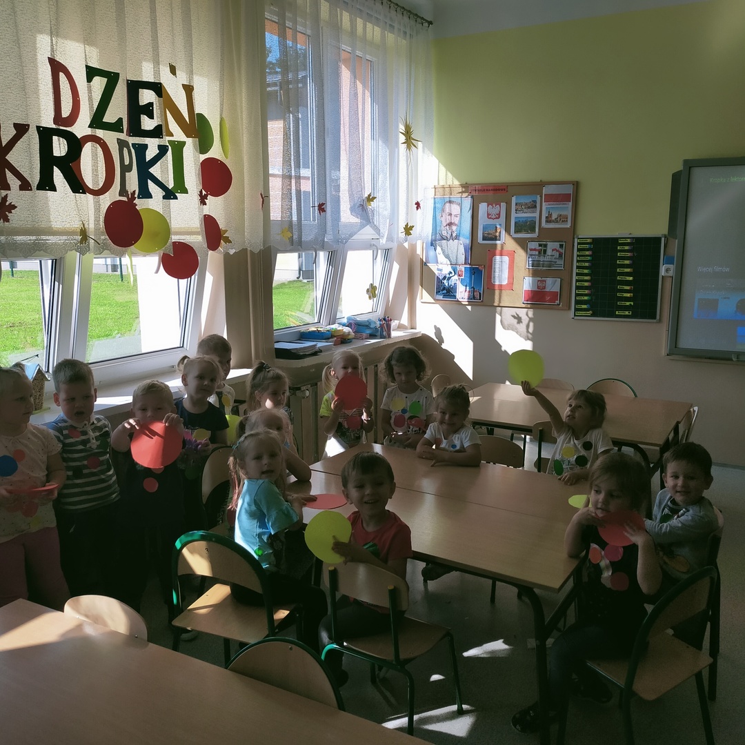 W dniu 15 września 2021 roku w naszych oddziałach przedszkolnych świętowaliśmy Międzynarodowy Dzień Kropki. Jest to święto kreatywności, którego inspiracją stała się książka Petera H. Reynoldsa pt."Kropka". Książka opowiada o małej dziewczynce Vashti, która nie chciała rysować, bo nie wierzyła w swoje umiejętności. Zachęcona przez nauczycielkę namalowała na kartce kropkę, po czym podpisała swój obrazek i pospiesznie opuściła salę. Następnego dnia Vashti ze zdumieniem zauważyła, że jej praca jest oprawiona w piękną ramkę i wisi na honorowym miejscu tuż nad biurkiem nauczycielki. Poczuła się bardzo szczęśliwa , że jej praca się spodobała i wisi w miejscu, w którym wszyscy mogą ją podziwiać. Pomyślała, że potrafi namalować jeszcze piękniejsze kropki i z ochotą zabrała się do pracy.