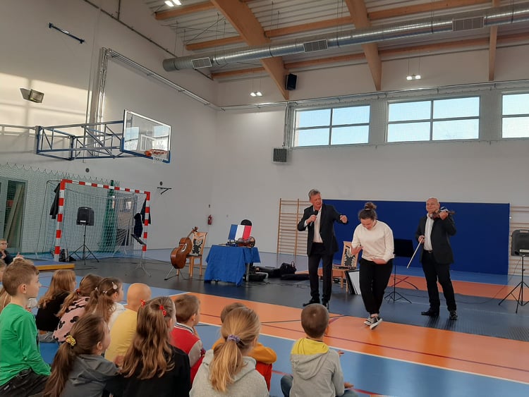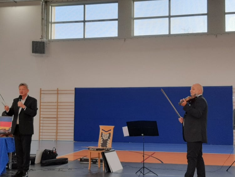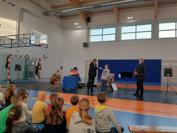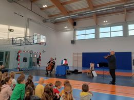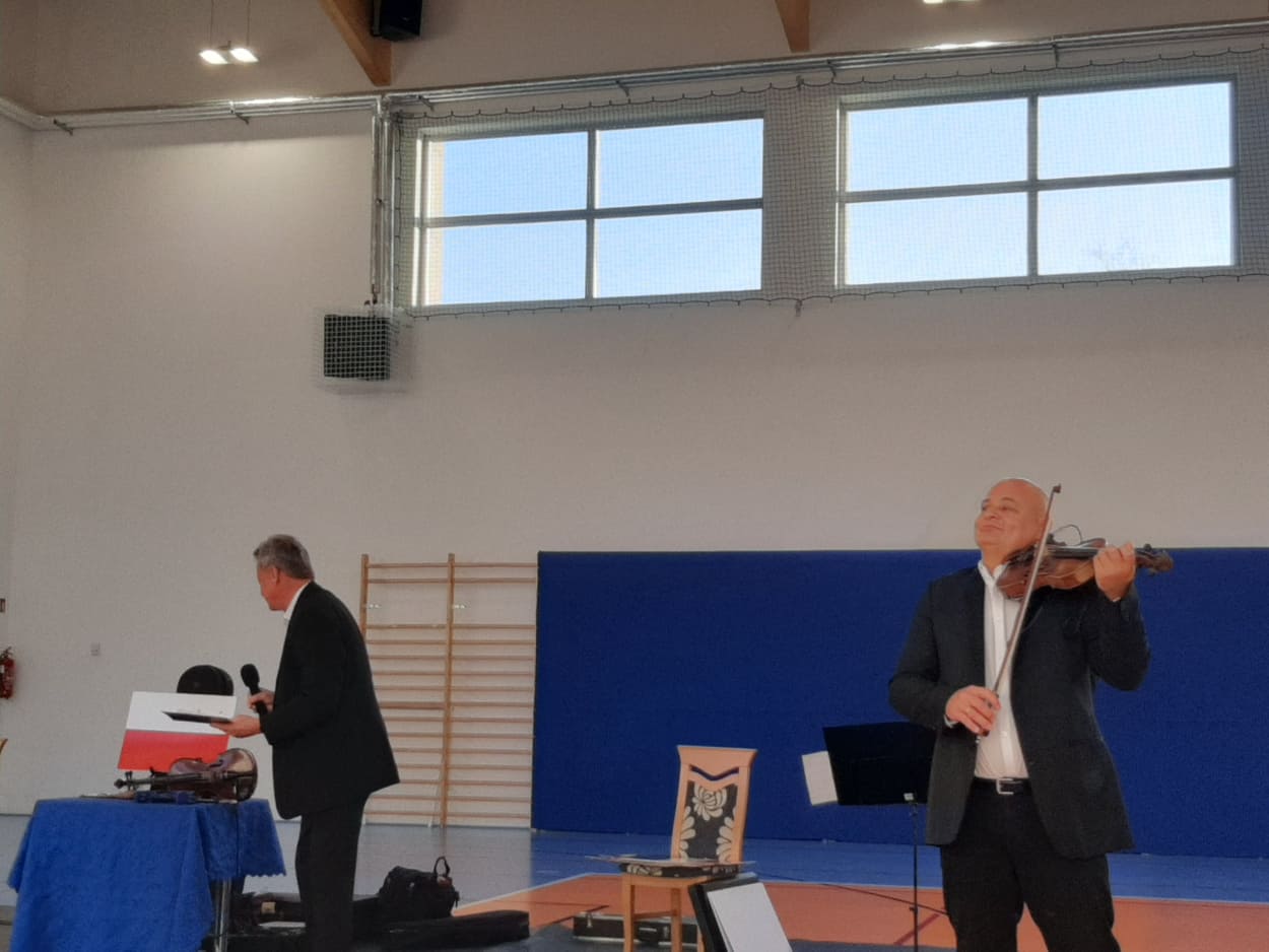 W niezwykłą muzyczną podróż zabrał dzisiaj uczniów naszej szkoły duet smyczkowy „Smyczkowanie na śniadanie”. Panowie K. Orzechowski (wiolonczela, śpiew) oraz W. Marcinowski (skrzypce, altówka) zaprezentowali szereg znanych utworów muzyki klasycznej z różnych państw Unii Europejskiej. Publiczność wysłuchała fragmentów „Poloneza g-moll” Fryderyka Chopina, utworu „Dla Elizy” Ludwiga van Beethovena, „Czardasza” Vittorio Montiego, który pamiętamy , m.in. z brawurowego wykonania skrzypka Dawida Garreta na koncercie w Mediolanie oraz melodii irlandzkich inspirowanych muzyką celtycką. Na zakończenie koncertu usłyszeliśmy utwory bliskie sercu naszego Patrona - „Barkę” i „Święty uśmiechnięty”.