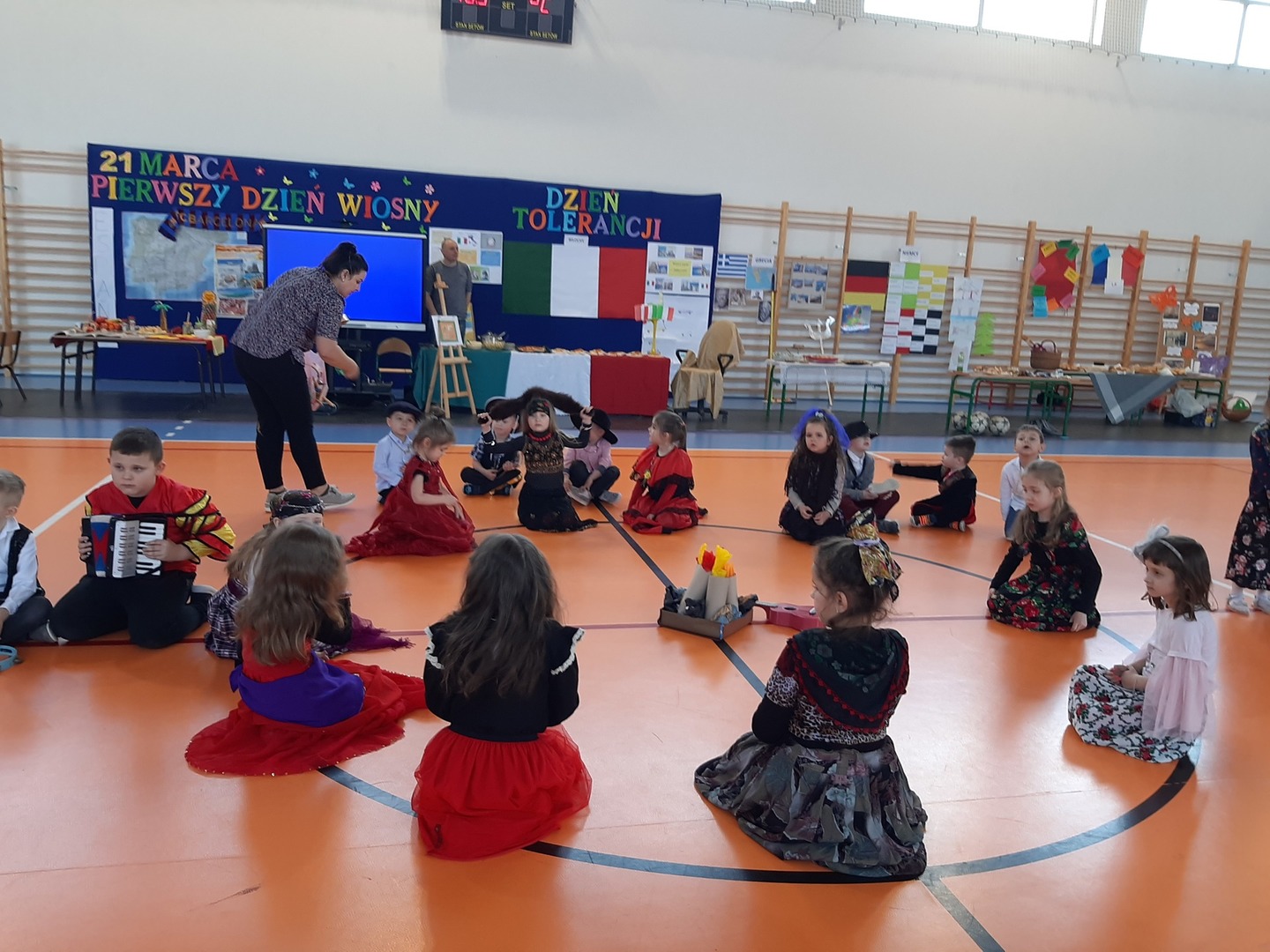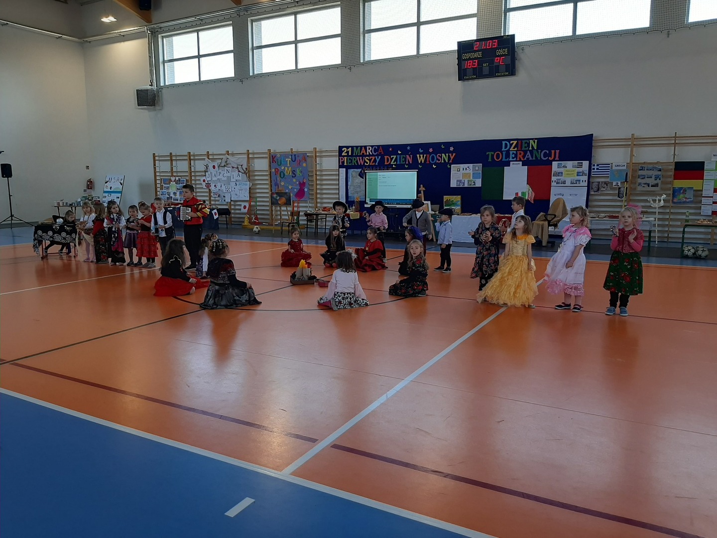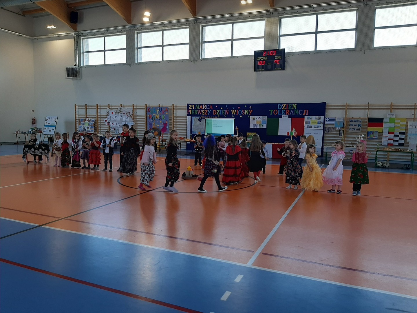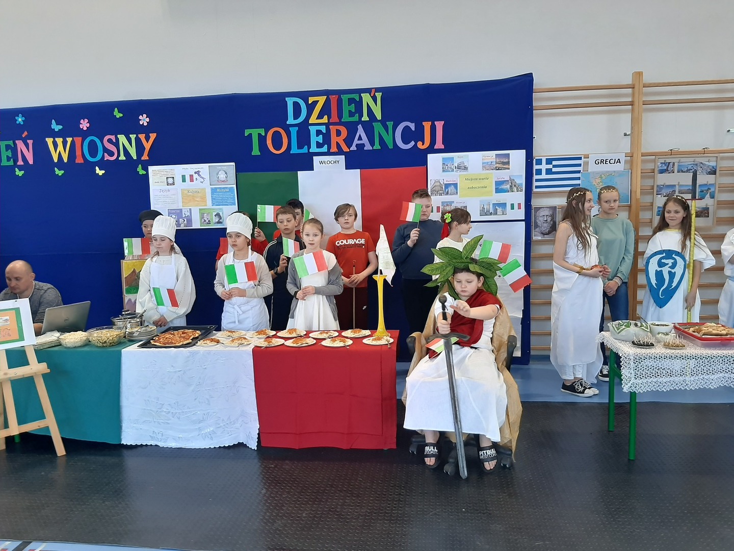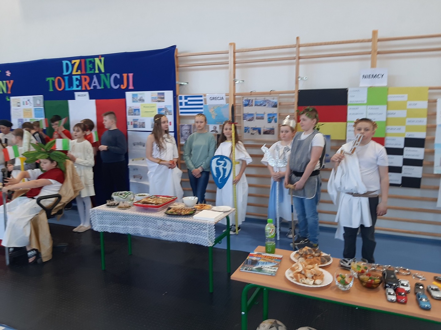 W ramach obchodów Dnia Tolerancji każda klasa, a nawet oddziały przedszkolne, przedstawiły informacje o wybranym kraju lub mniejszości etnicznej. Uczniowie przygotowali przepiękne ekspozycje, prezentacje multimedialne, stroje i regionalne potrawy. Dzisiaj podróżowaliśmy bez ograniczeń! Odwiedziliśmy daleką Japonię, obejrzeliśmy romskie tańce, zachwyciły nas lawendowe pola Prowansji i flamenco w słonecznej Hiszpanii. Jedni poznawali greckich bogów i niemieckich kompozytorów, a inni zajadali się włoskim spaghetti, amerykańskim popcornem i... polskimi pierogami.