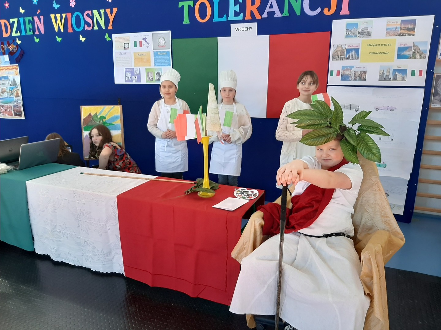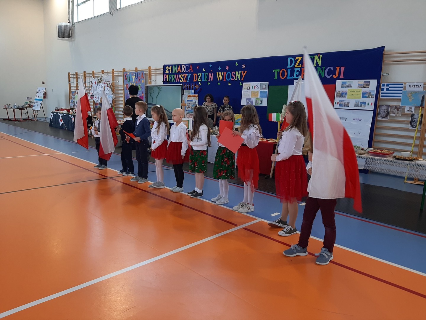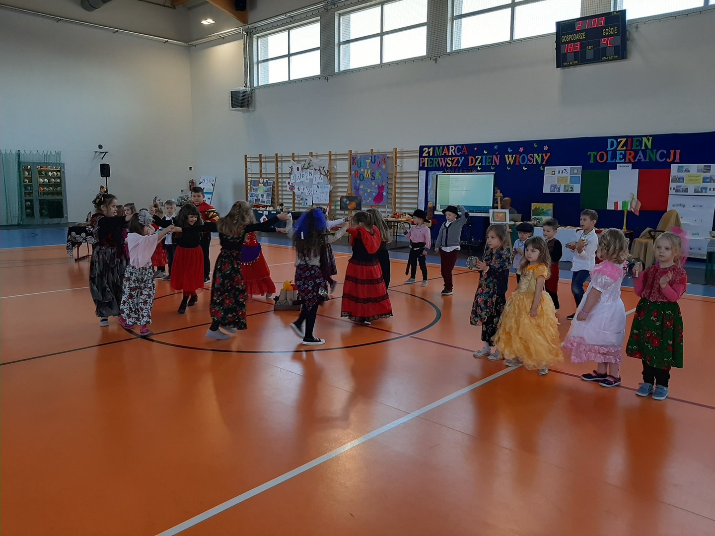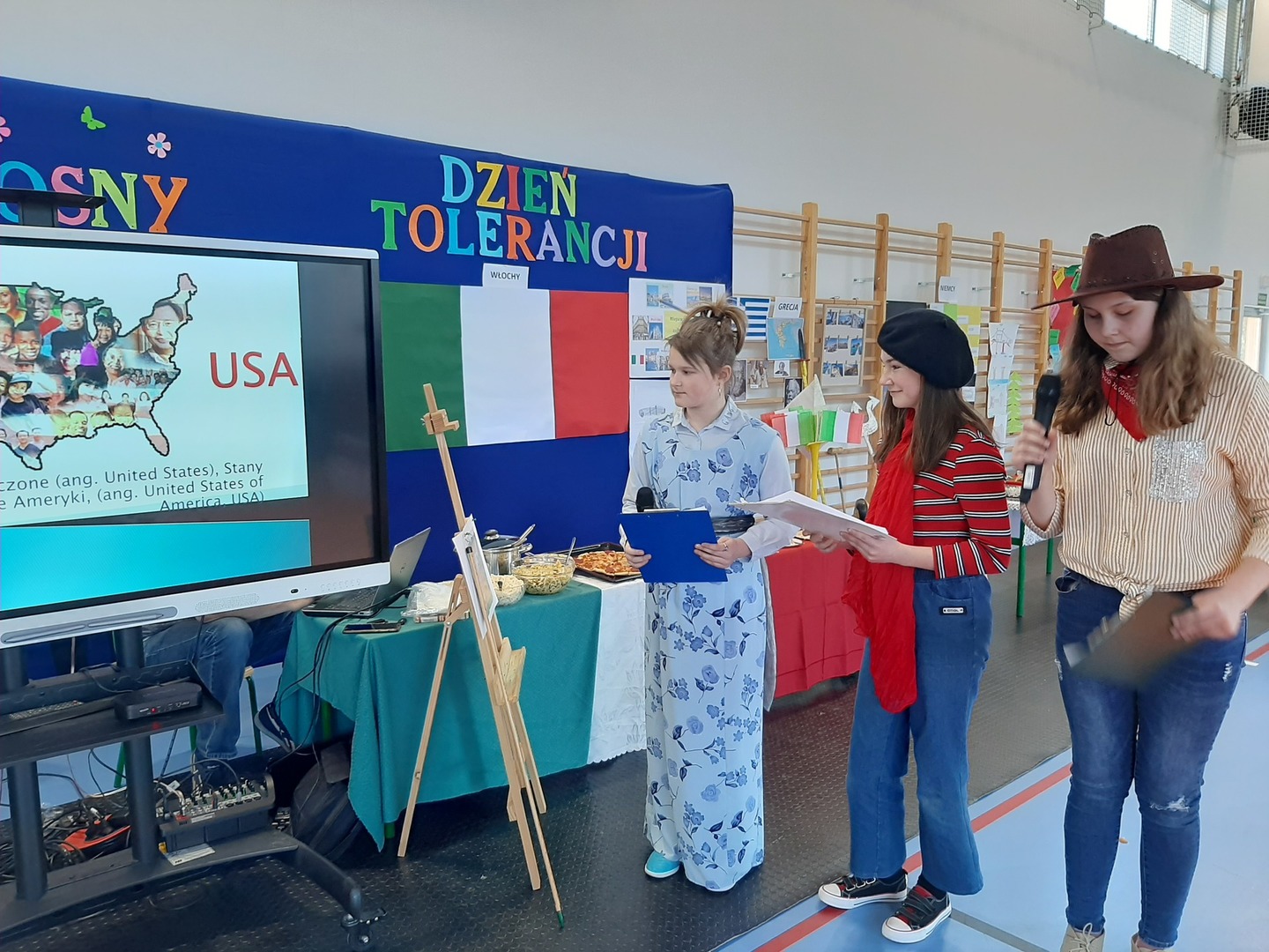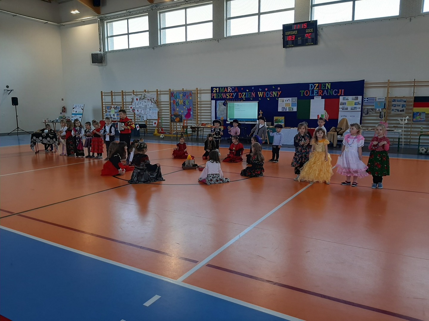 W ramach obchodów Dnia Tolerancji każda klasa, a nawet oddziały przedszkolne, przedstawiły informacje o wybranym kraju lub mniejszości etnicznej. Uczniowie przygotowali przepiękne ekspozycje, prezentacje multimedialne, stroje i regionalne potrawy. Dzisiaj podróżowaliśmy bez ograniczeń! Odwiedziliśmy daleką Japonię, obejrzeliśmy romskie tańce, zachwyciły nas lawendowe pola Prowansji i flamenco w słonecznej Hiszpanii. Jedni poznawali greckich bogów i niemieckich kompozytorów, a inni zajadali się włoskim spaghetti, amerykańskim popcornem i... polskimi pierogami.