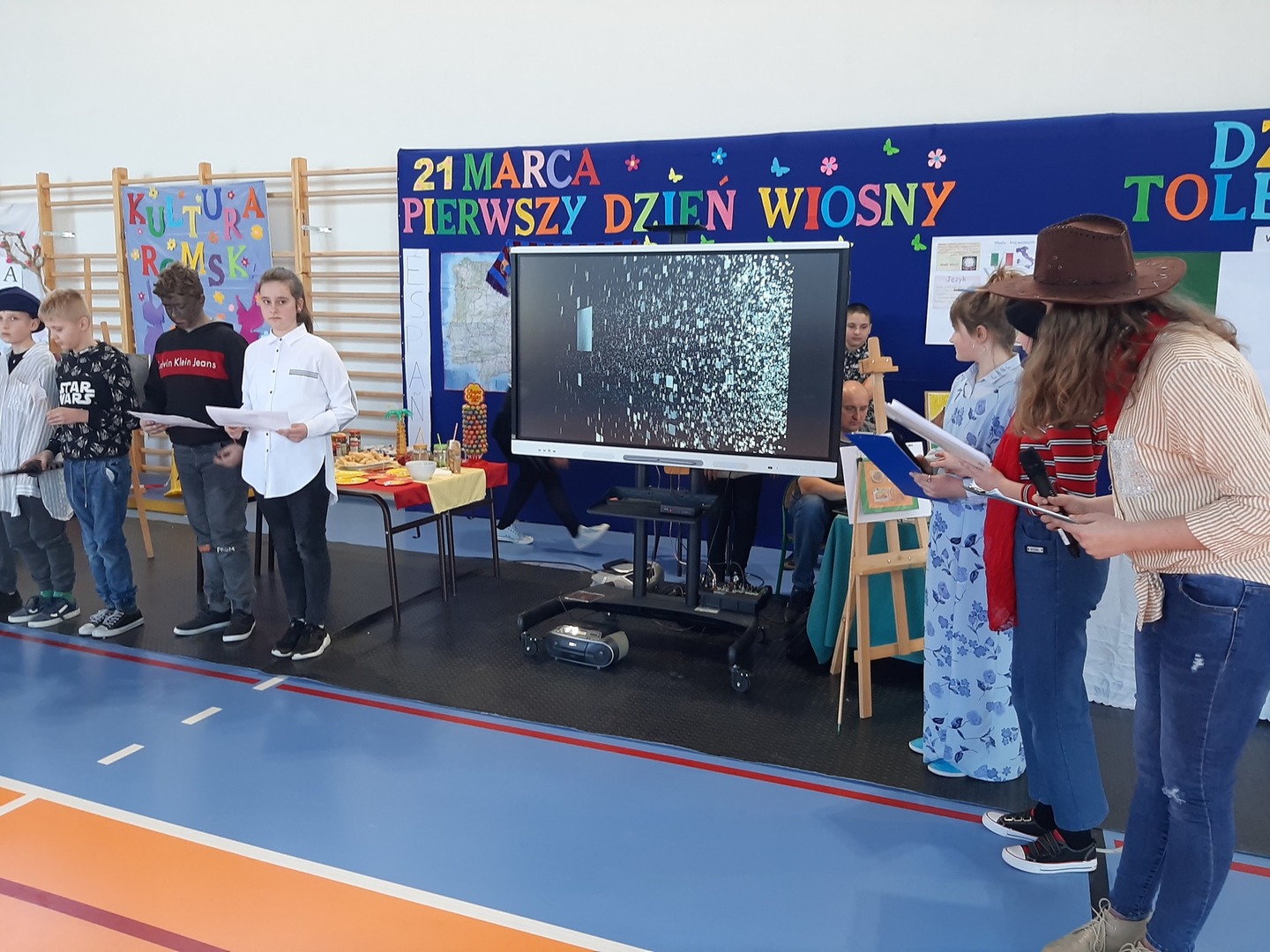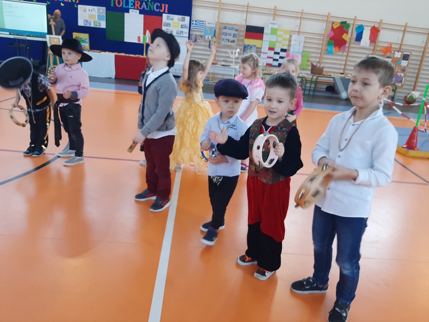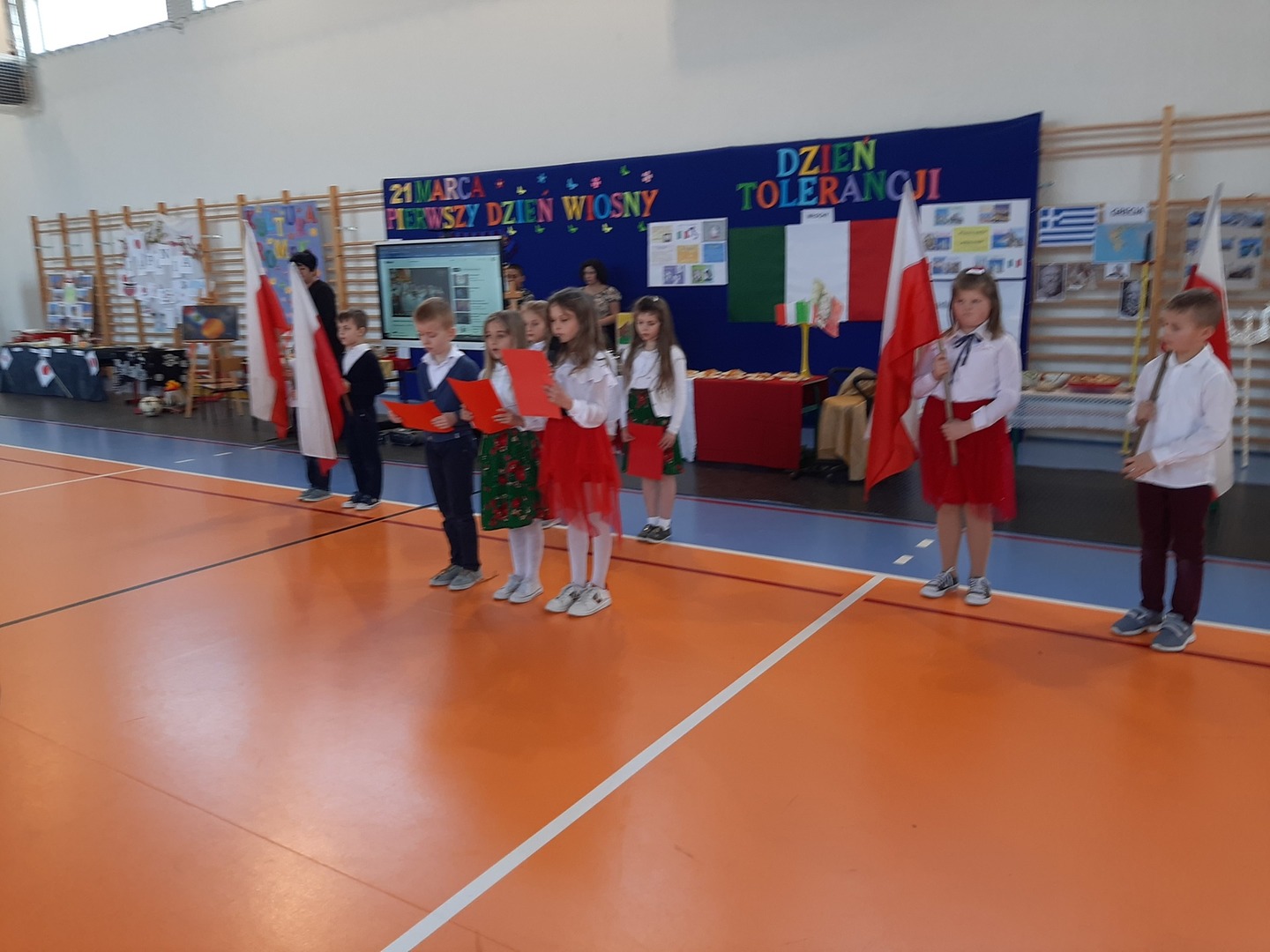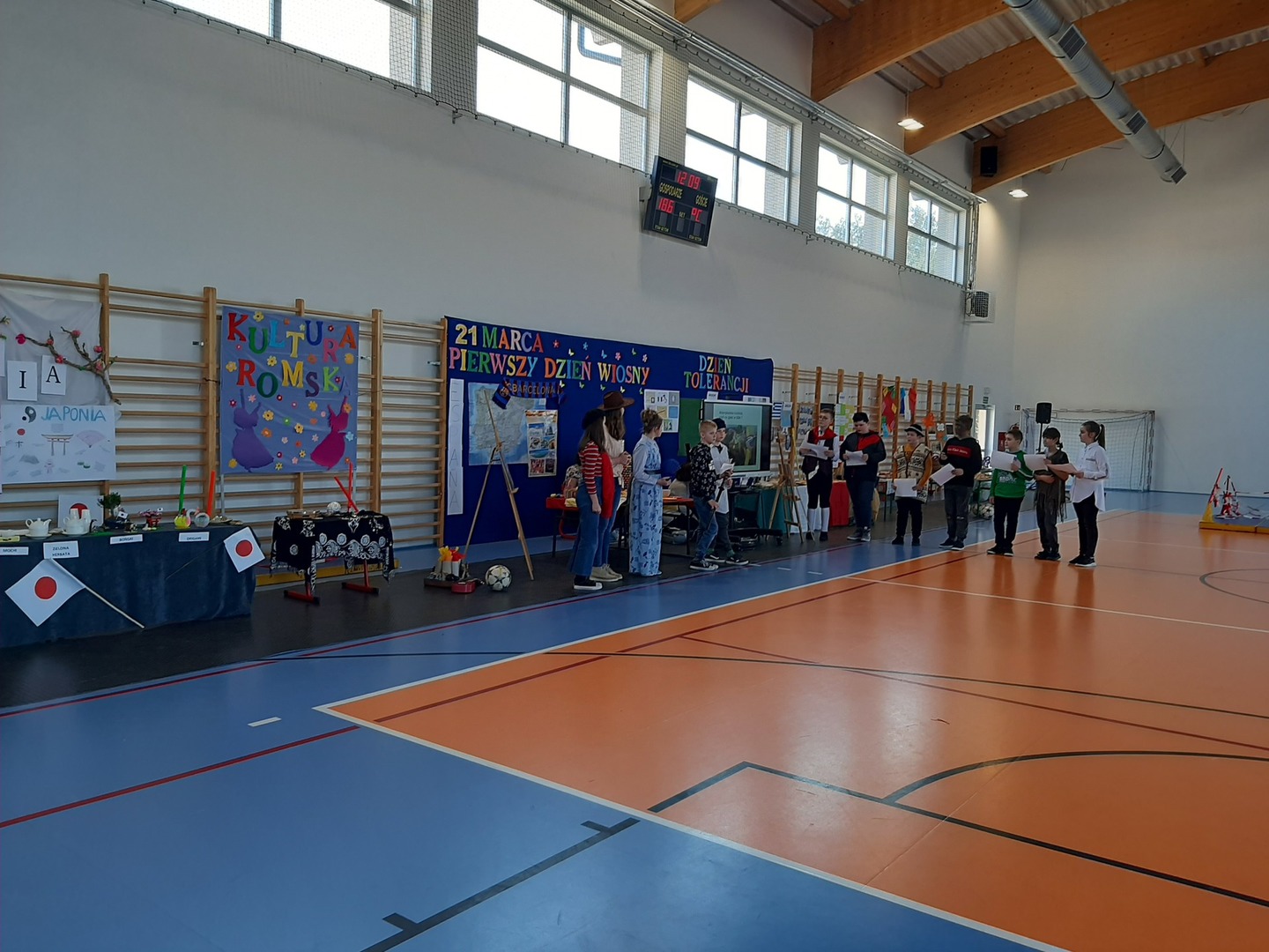 W ramach obchodów Dnia Tolerancji każda klasa, a nawet oddziały przedszkolne, przedstawiły informacje o wybranym kraju lub mniejszości etnicznej. Uczniowie przygotowali przepiękne ekspozycje, prezentacje multimedialne, stroje i regionalne potrawy. Dzisiaj podróżowaliśmy bez ograniczeń! Odwiedziliśmy daleką Japonię, obejrzeliśmy romskie tańce, zachwyciły nas lawendowe pola Prowansji i flamenco w słonecznej Hiszpanii. Jedni poznawali greckich bogów i niemieckich kompozytorów, a inni zajadali się włoskim spaghetti, amerykańskim popcornem i... polskimi pierogami.