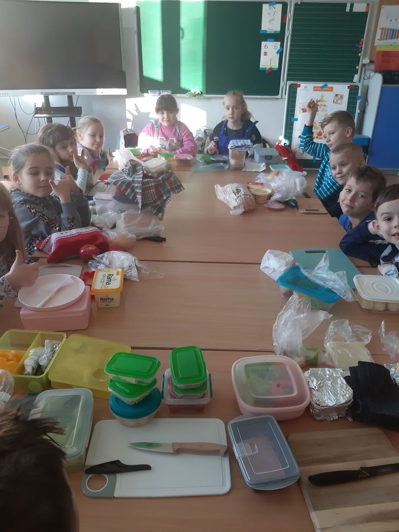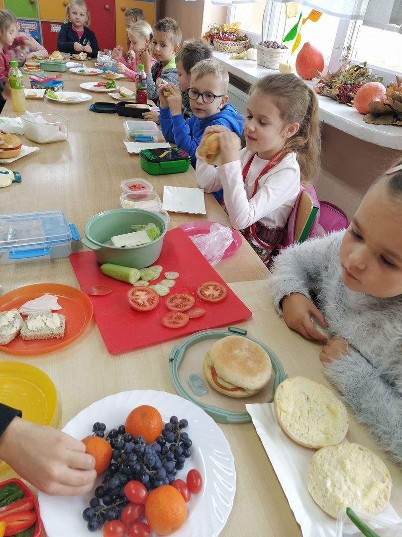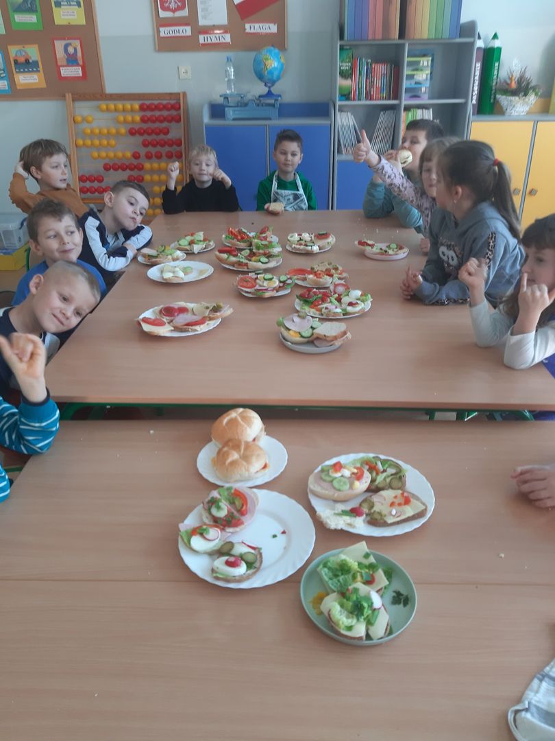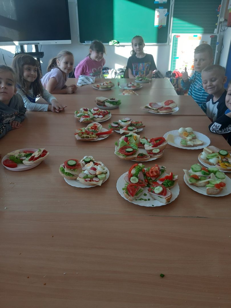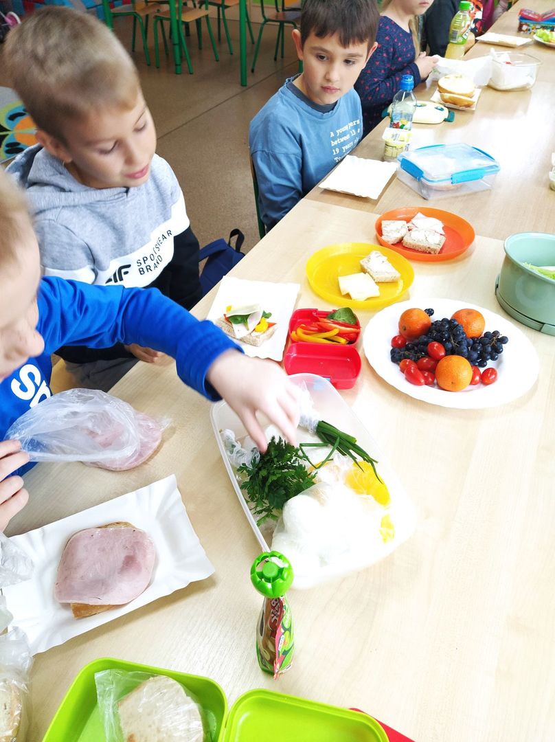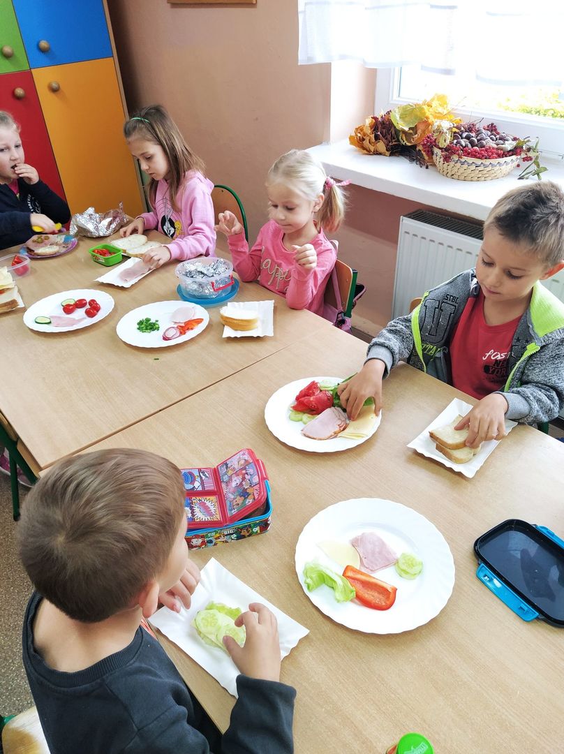 W dniach 8 i 9 listopada dzieci z oddziałów przedszkolnych i klasy 1 wraz z wychowawczyniami wzięły udział w pięknej akcji promującej zdrowe odżywianie podczas wspólnego śniadania, przygotowując smaczne i zdrowe kanapki. Podczas zajęć dzieci dowiedziały się, że śniadanie to najważniejszy posiłek dnia. Dzięki niemu dzieci mają energię do nauki, lepiej koncentrują się podczas lekcji i mają siłę do zabawy. To najlepszy start w nowy dzień! Oprócz tego przeprowadzono pogadanki na temat roli śniadania, jako najważniejszego posiłku w ciągu dnia. Uczniowie dowiedzieli się również, że zdrowe odżywianie to nie tylko zdrowa żywność. Ważne jest też, aby jeść pięć posiłków w ciągu dnia, o stałych porach i bez pośpiechu, systematycznie sięgać po nabiał, ryby i mięsa oraz ciemny chleb zamiast bułek, a także picie soków czy wody zamiast szkodliwych napojów gazowanych. Wspomniano też o niezbędnym ruchu oraz unikaniu słodyczy i chipsów, które są niezdrowe.