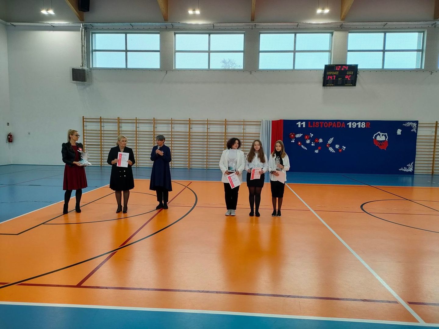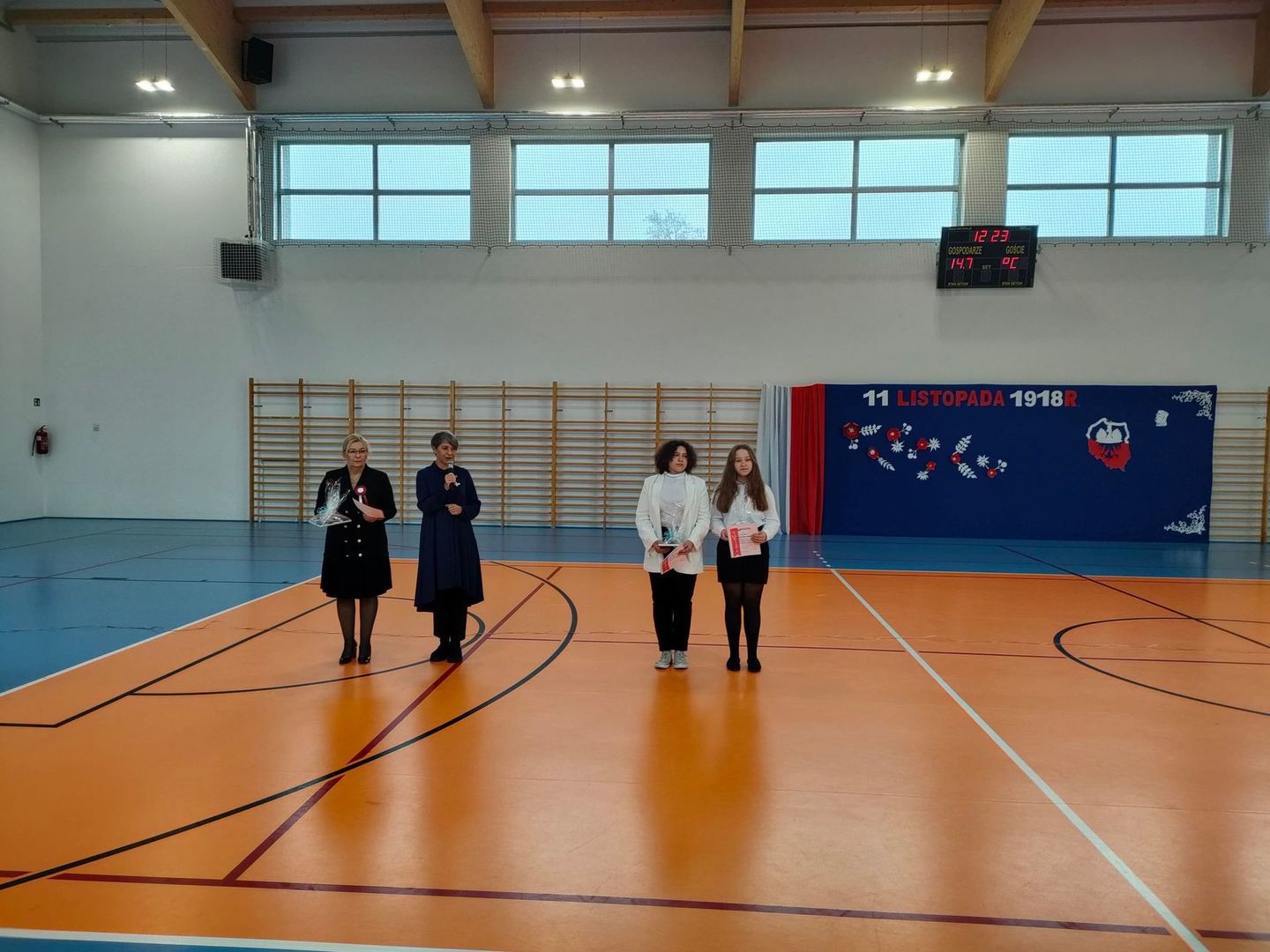 Później przyszedł czas na ogłoszenie wyników Szkolnego Konkursu Historycznego “104. rocznica odzyskania niepodległości”. Najlepiej i najszybciej pytania w internetowym quizie wykonały uczennice klasy VIII: N. Szymańska i A. Tkaczyk, które zajęły ex aequo I miejsce, miejsce II zajęła M. Jakubiak, a III M. Wasil. Laureatki otrzymały pamiątkowe dyplomy oraz nagrody rzeczowe.
