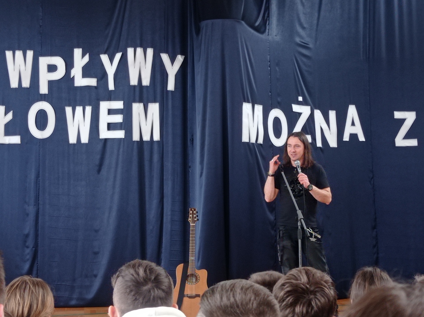 Hasło przewodnie brzmiało: „Złe wpływy. Czy słowem można zabić?”. To był prawdziwy zbiór życiowych drogowskazów wskazujących prawidłowe postawy w życiu młodego człowieka. Co jest ważne w życiu, jaką wybrać drogę, by nie prowadziła ona donikąd. Muzyk poruszał ważne tematy nadużywania alkoholu, narkotyków i dopalaczy. Mówił, jak szybko można się zatracić w świecie internetu, mediów społecznościowych. Wulgaryzmy tak powszechnie obecnie używane – były również przedmiotem spotkania. Pan Grzegorz opowiadał o swoich doświadczeniach, podawał przykłady życiorysów muzyków, których zgubiła sława, którzy popadli w nałóg. Artysta starał się angażować młodzież do dyskusji. Bardzo atrakcyjne były przerywniki w formie utworów wykonywanych na żywo.