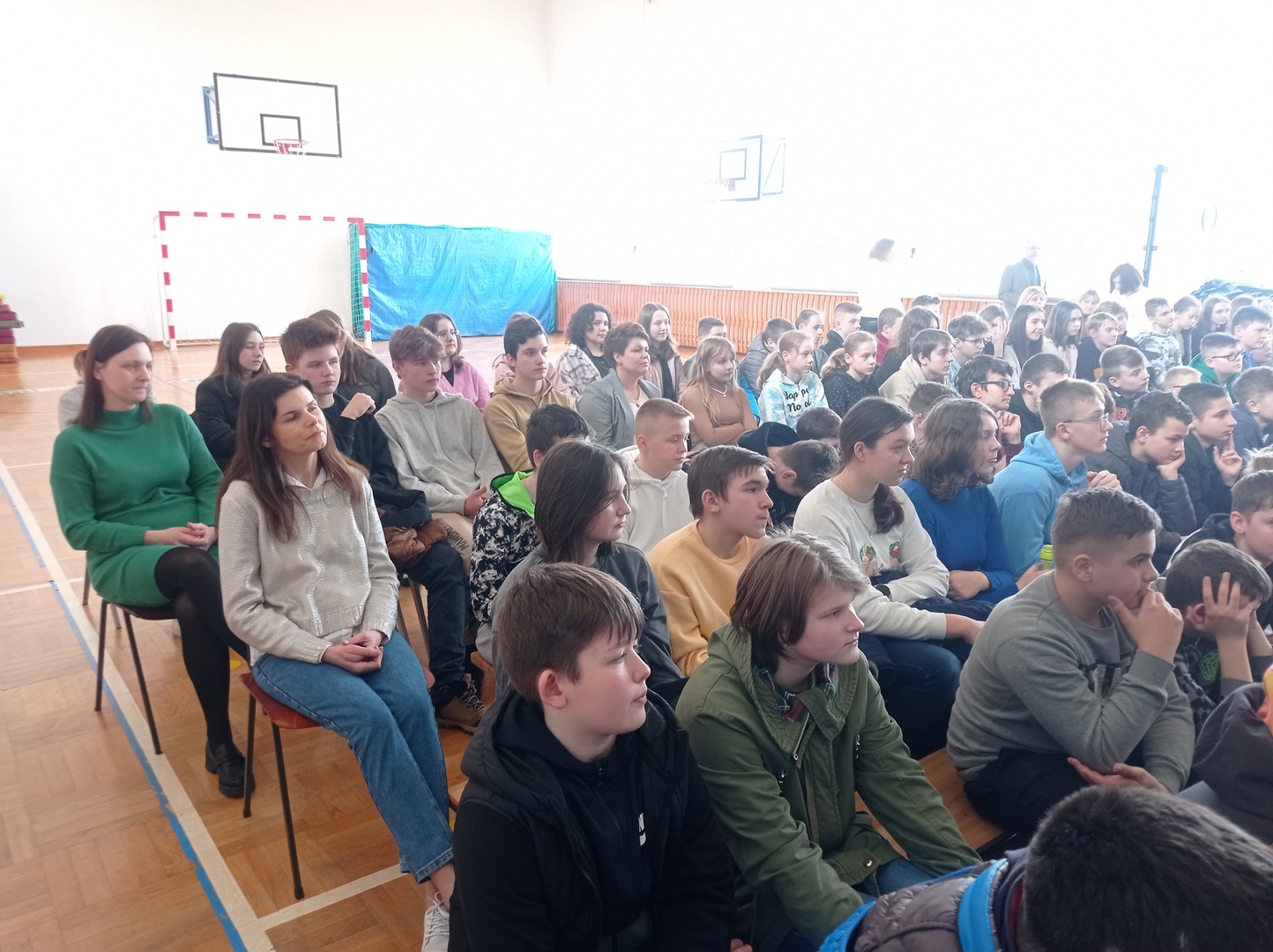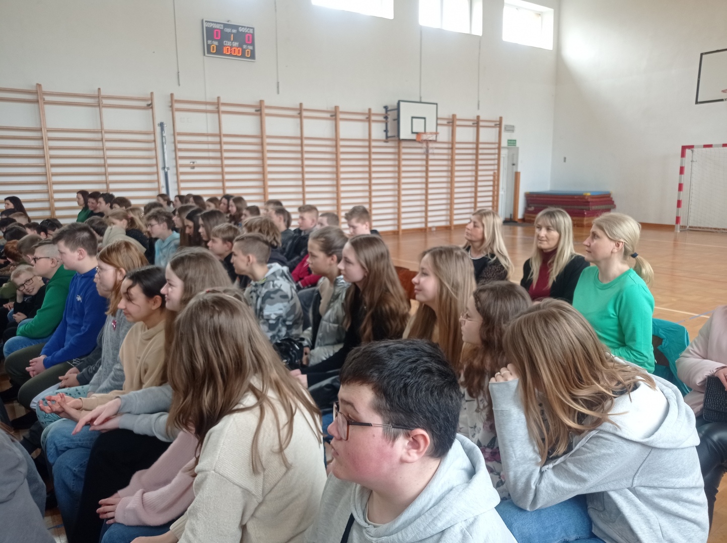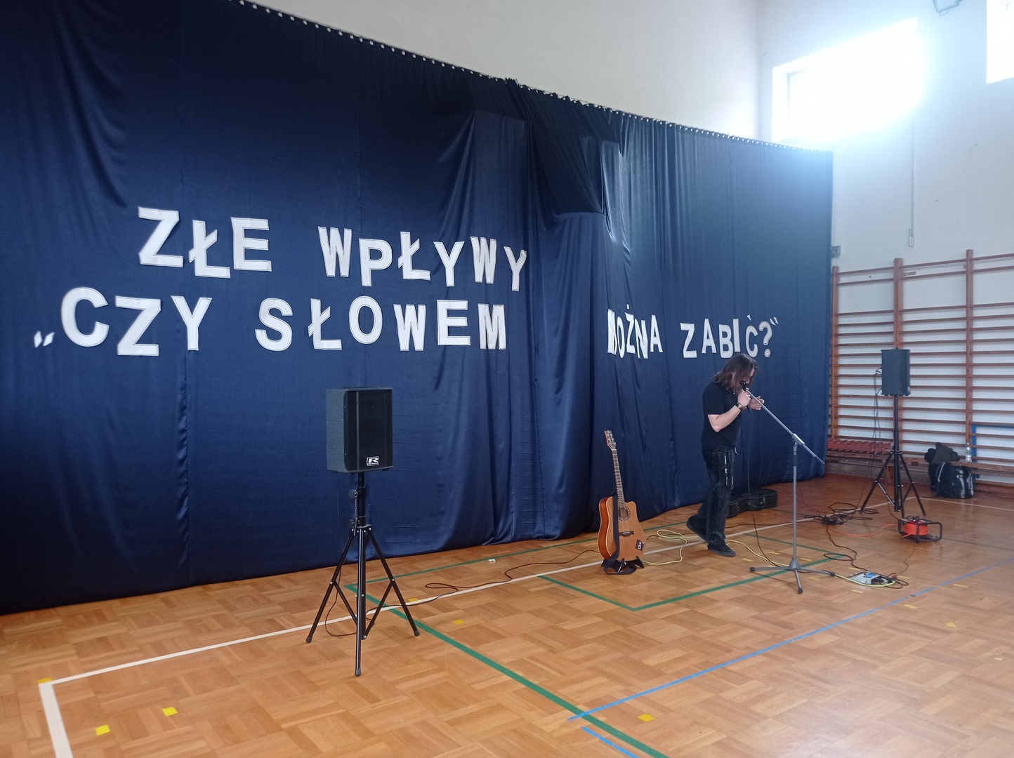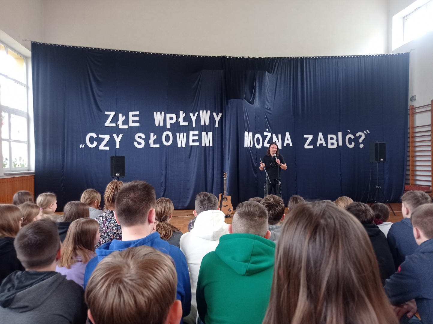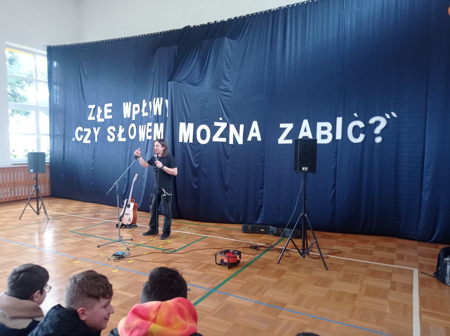 Złe wpływy. Czy słowem można zabić? – spotkanie profilaktyczne z Grzegorzem Stępniem polskim multiinstrumentalistą i gitarzysta basowym w Publicznej Szkole Podstawowej im. Batalionów Chłopskich w Zawadach Starych.