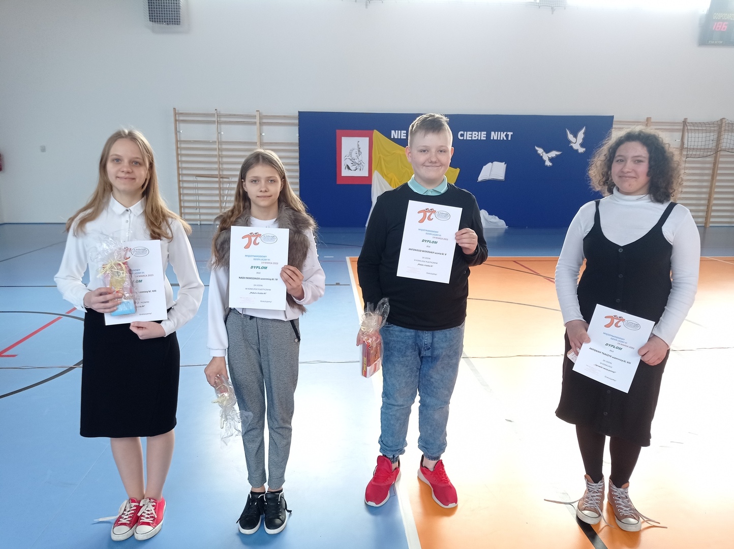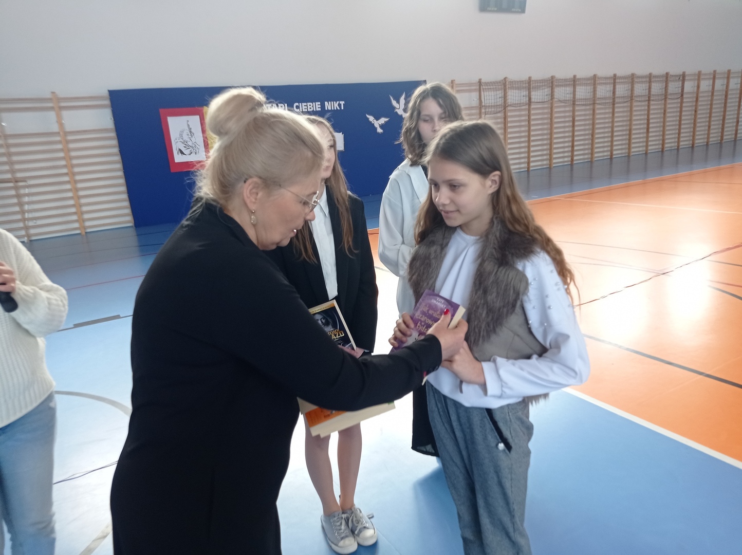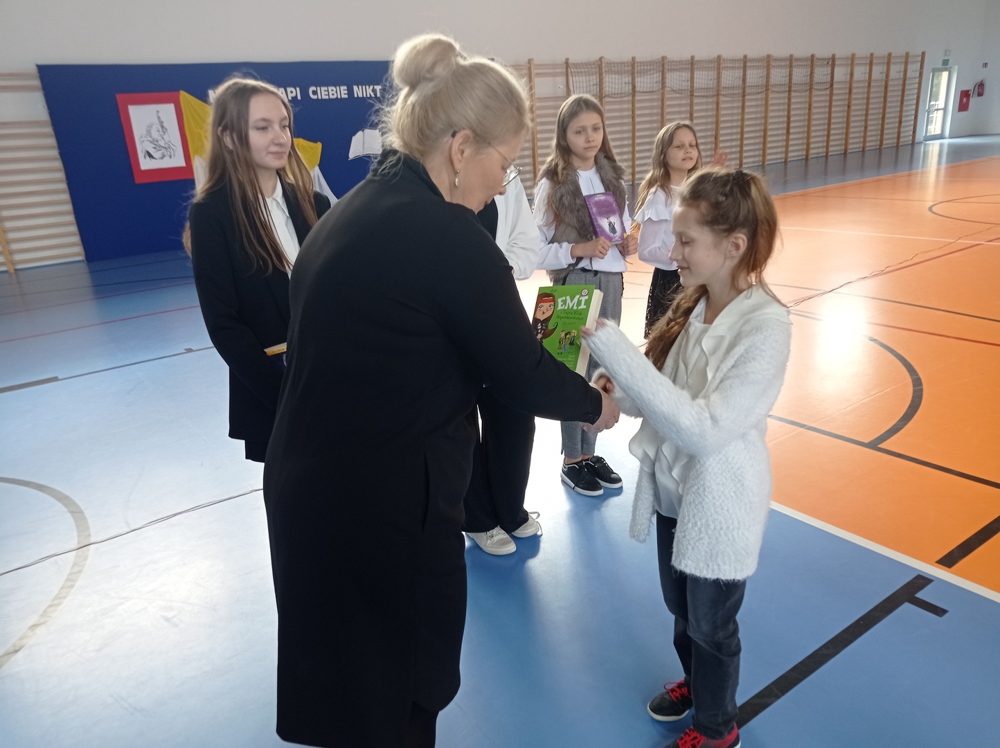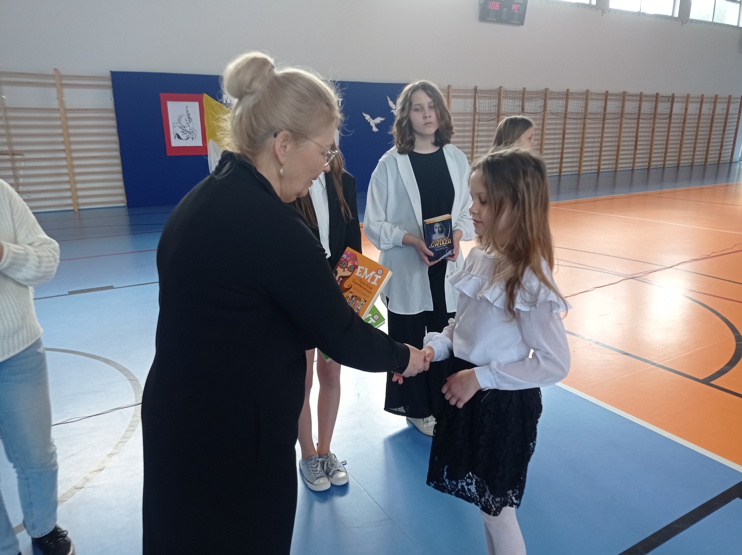Dnia 3 kwietnia 2023 roku odbyło się uroczyste wręczenie nagród książkowych autorom prac wyróżnionych w konkursie „Ferie z książką”, którego celem było szerzenie czytelnictwa wśród uczniów naszej szkoły. Zadaniem było napisanie pracy literackiej w dowolnej formie graficznej (pisane ręcznie, pisane komputerowo, z rysunkami lub bez rysunków) zachęcającej do przeczytania książki wcześniej wypożyczonej z biblioteki szkolnej, gminnej lub domowej.