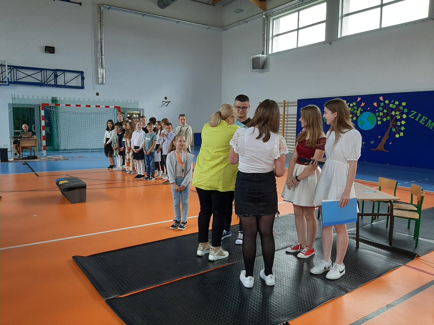 Podczas apelu dnia 26.04. 2023r. społeczność szkolna została poinformowana o wynikach przeprowadzonego głosowania, a zwycięzcy odebrali trofea, które wręczyła pani dyrektor Małgorzata Sobień.