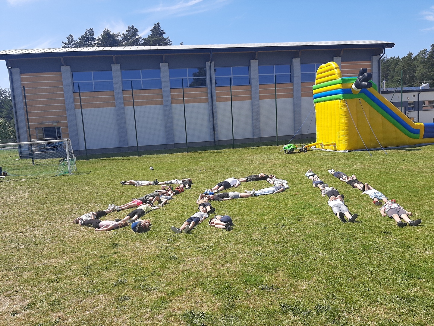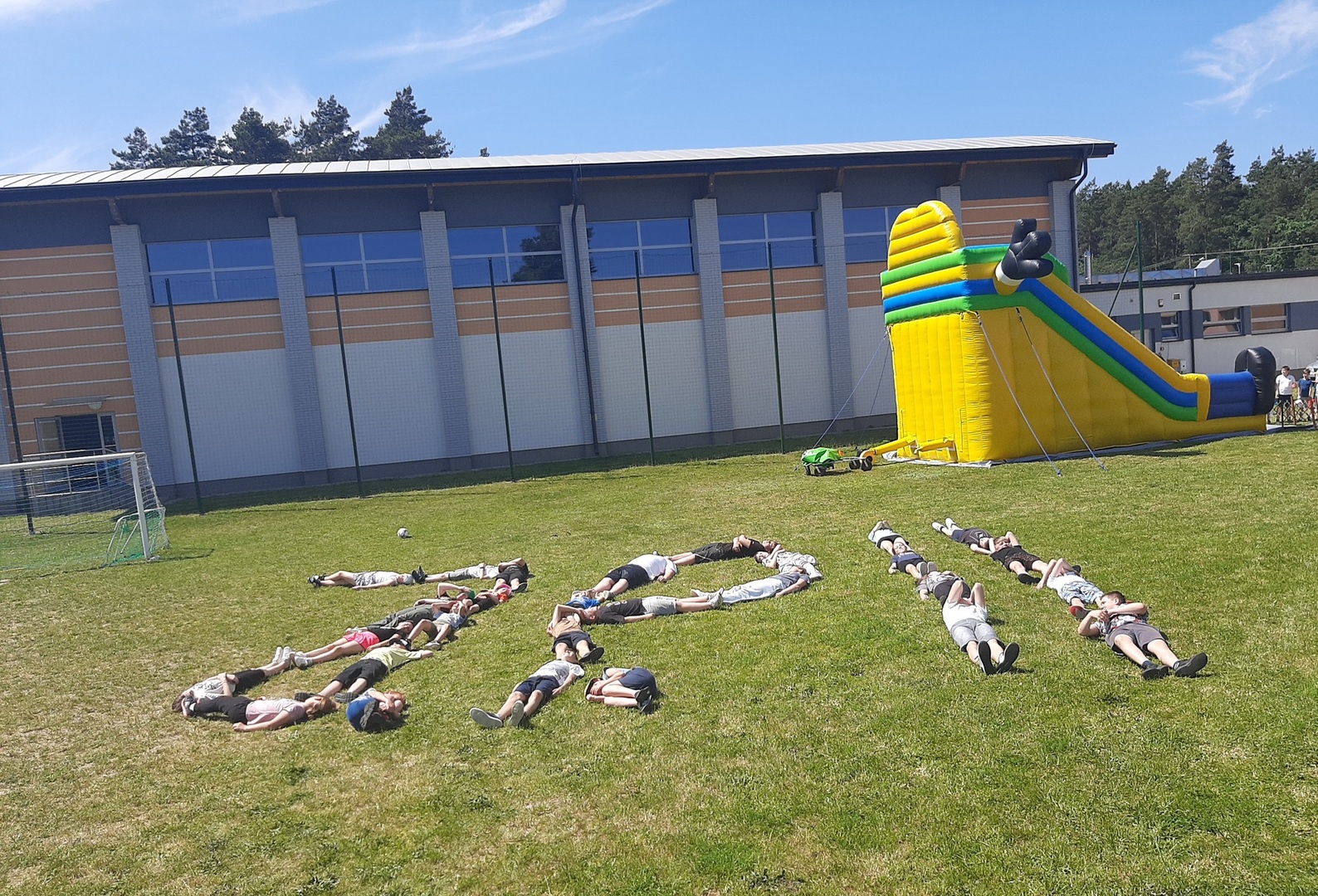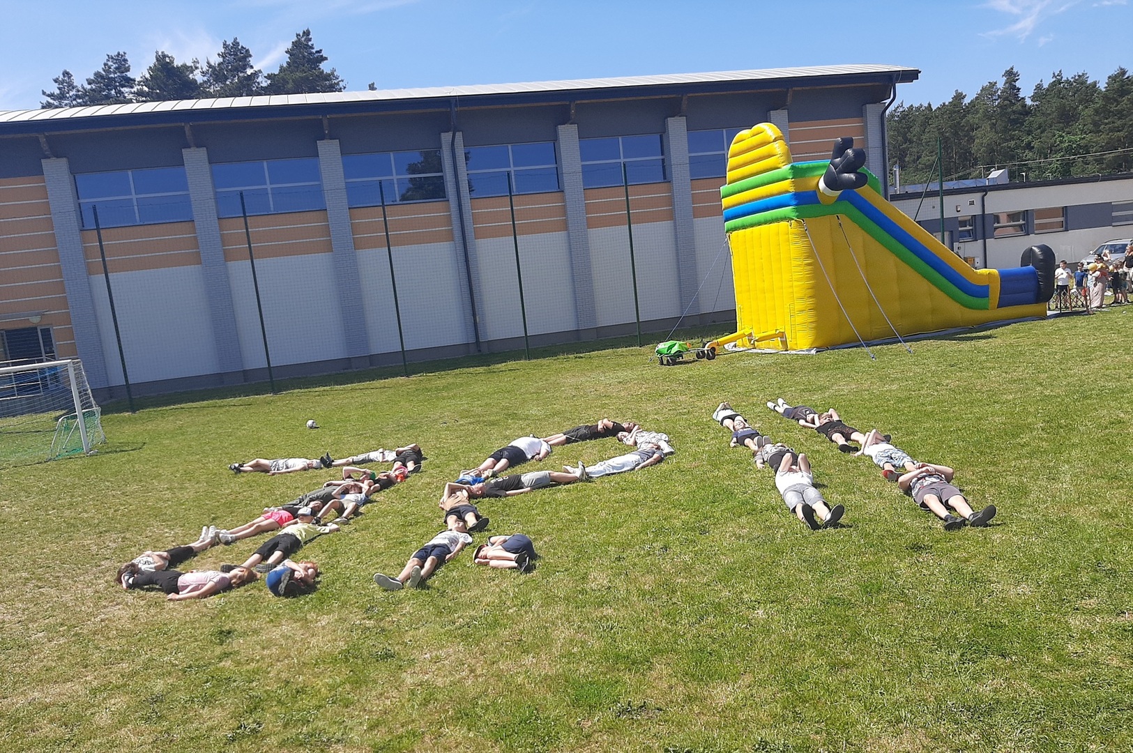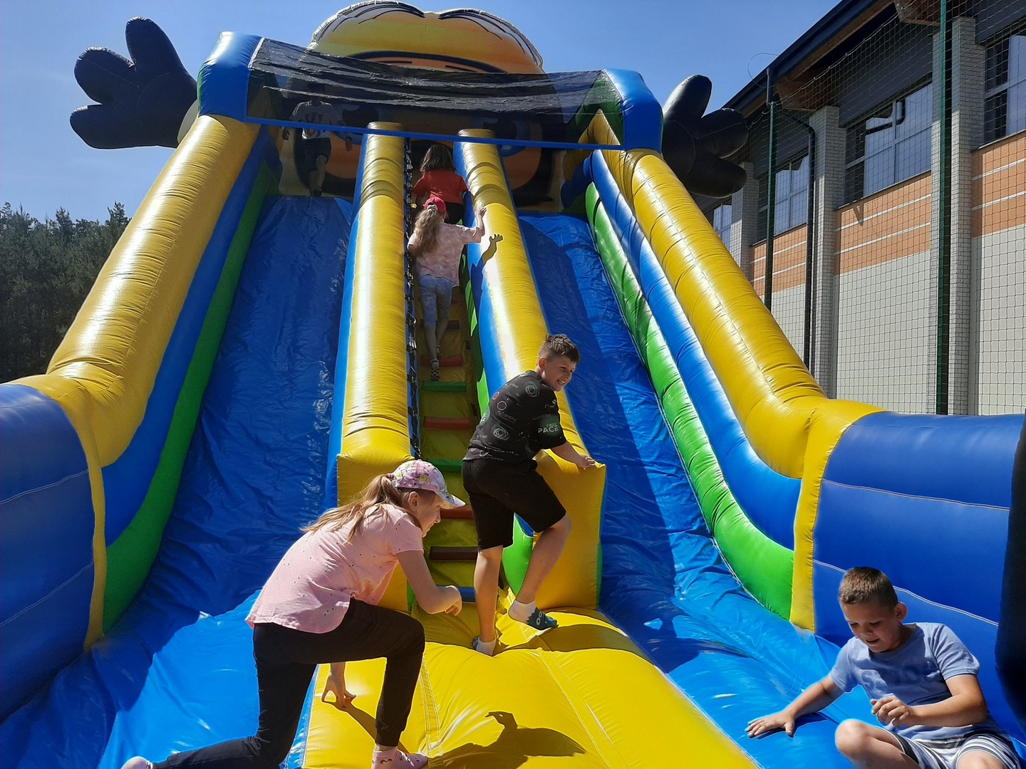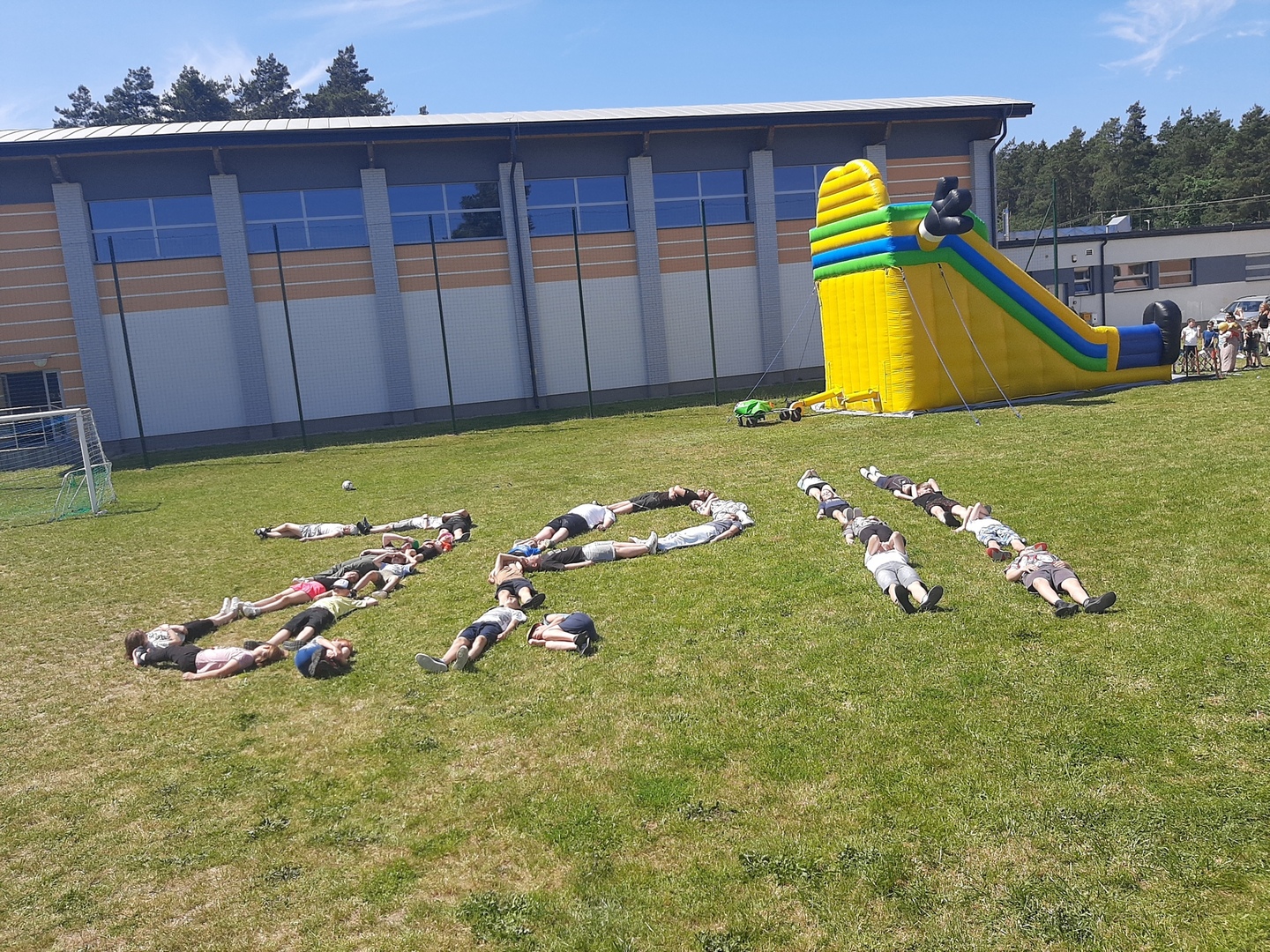 Odpowiedzialni za organizację Dnia Dziecka nauczyciele wf - pani Wioletta Kaleta i pan Paweł Zegarek - przygotowali ciekawy tor przeszkód, uczestnicy mogli również rozegrać mecze piłki siatkowej. Nie zabrakło kreatywnych pomysłów i nauki współpracy - układanie napisów z własnych ciał to świetna zabawa. Docenili ją nasi uczniowie, którzy ułożyli inicjały patrona szkoły. Dodatkową atrakcją była, zamówiona przez Radę Rodziców, dmuchana zjeżdżalnia.