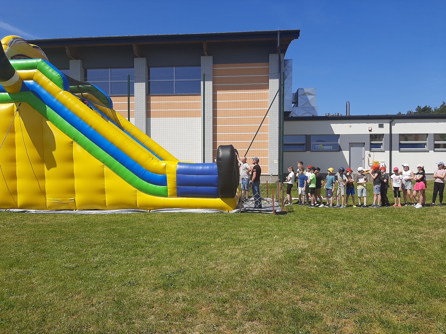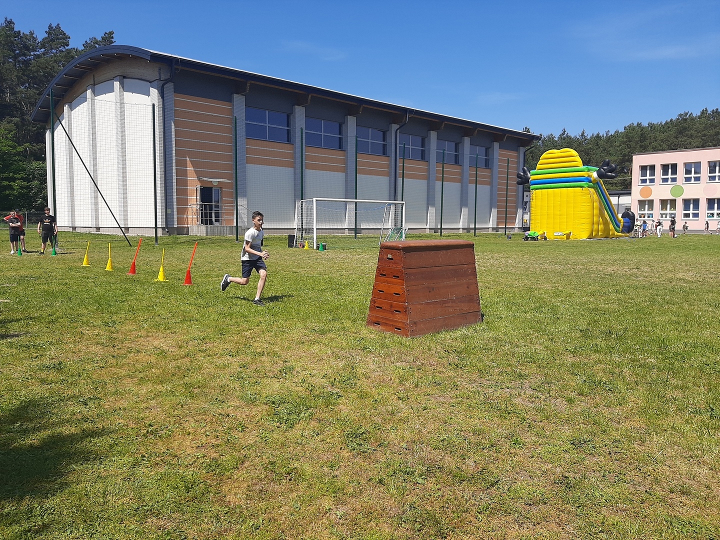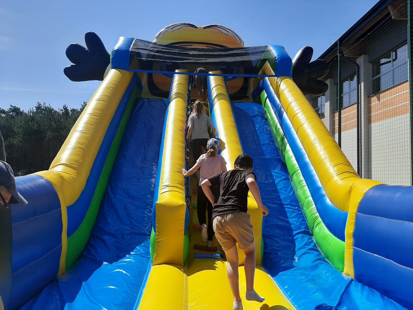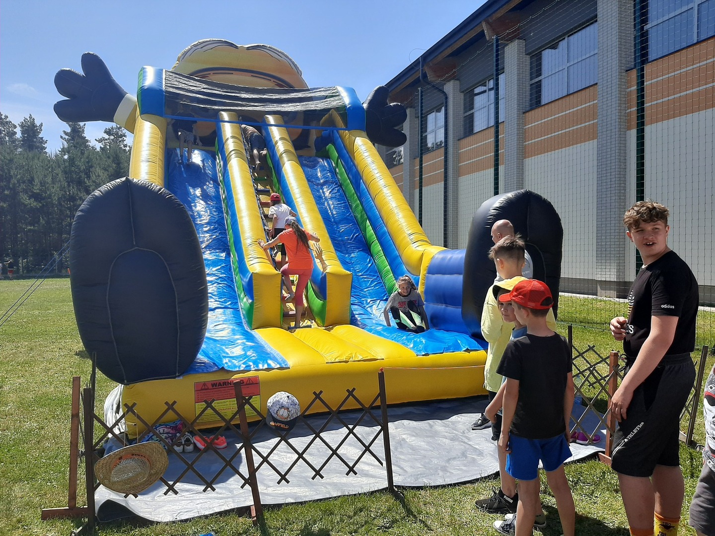 Odpowiedzialni za organizację Dnia Dziecka nauczyciele wf - pani Wioletta Kaleta i pan Paweł Zegarek - przygotowali ciekawy tor przeszkód, uczestnicy mogli również rozegrać mecze piłki siatkowej. Nie zabrakło kreatywnych pomysłów i nauki współpracy - układanie napisów z własnych ciał to świetna zabawa. Docenili ją nasi uczniowie, którzy ułożyli inicjały patrona szkoły. Dodatkową atrakcją była, zamówiona przez Radę Rodziców, dmuchana zjeżdżalnia.