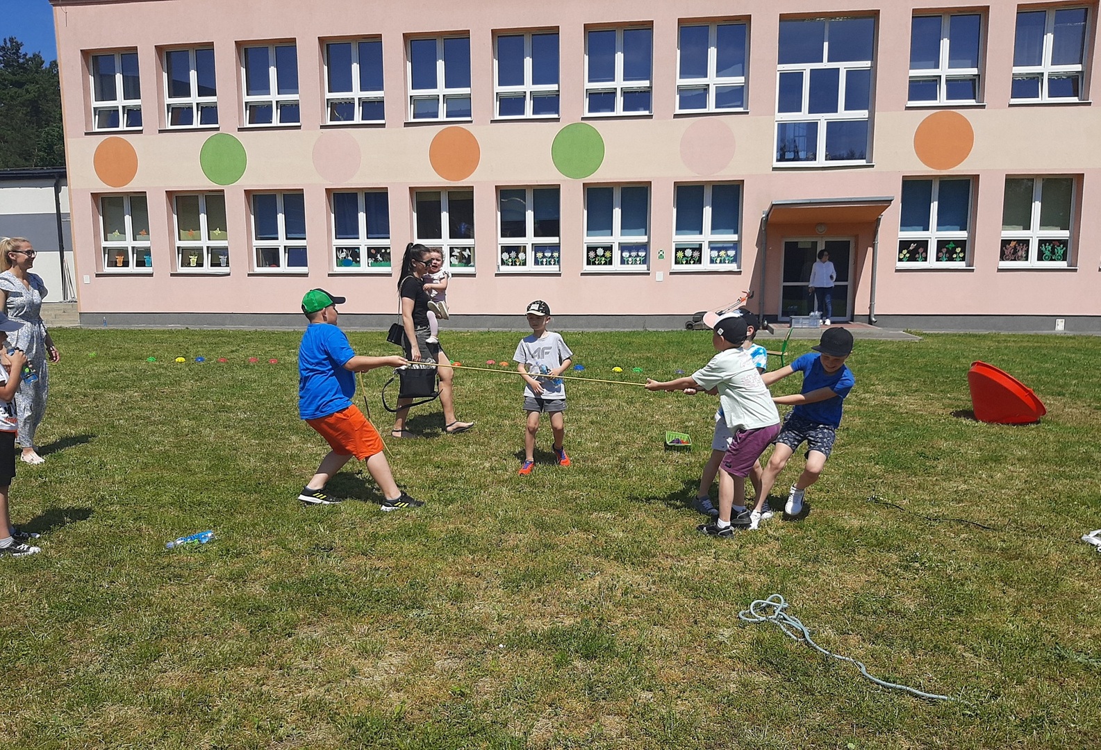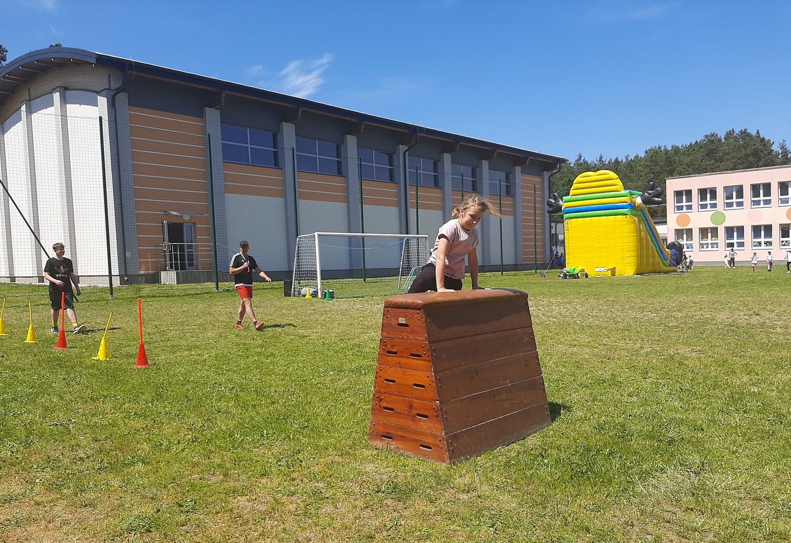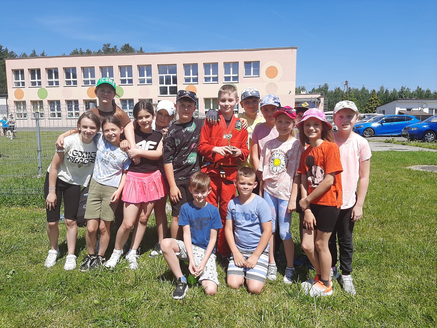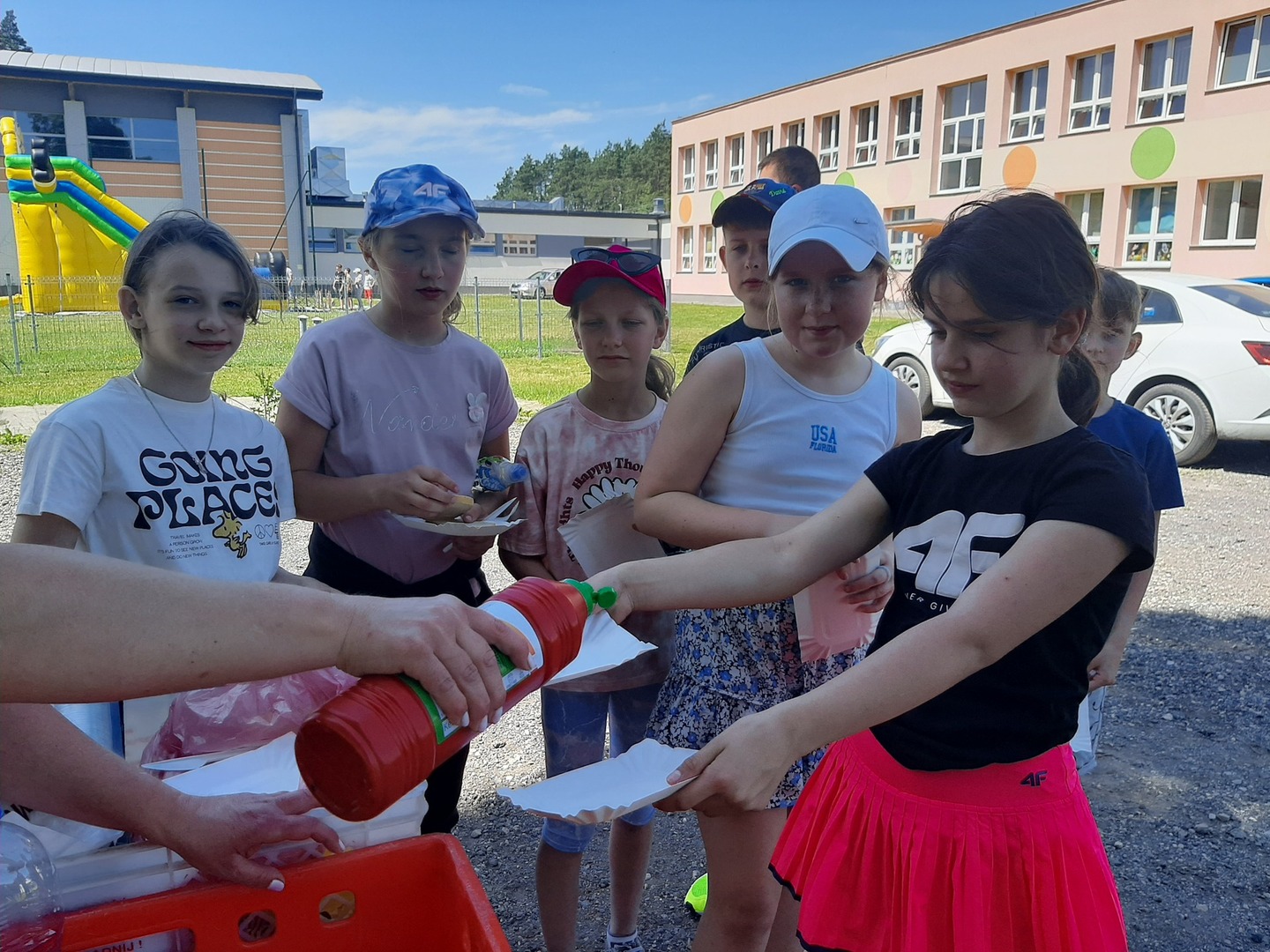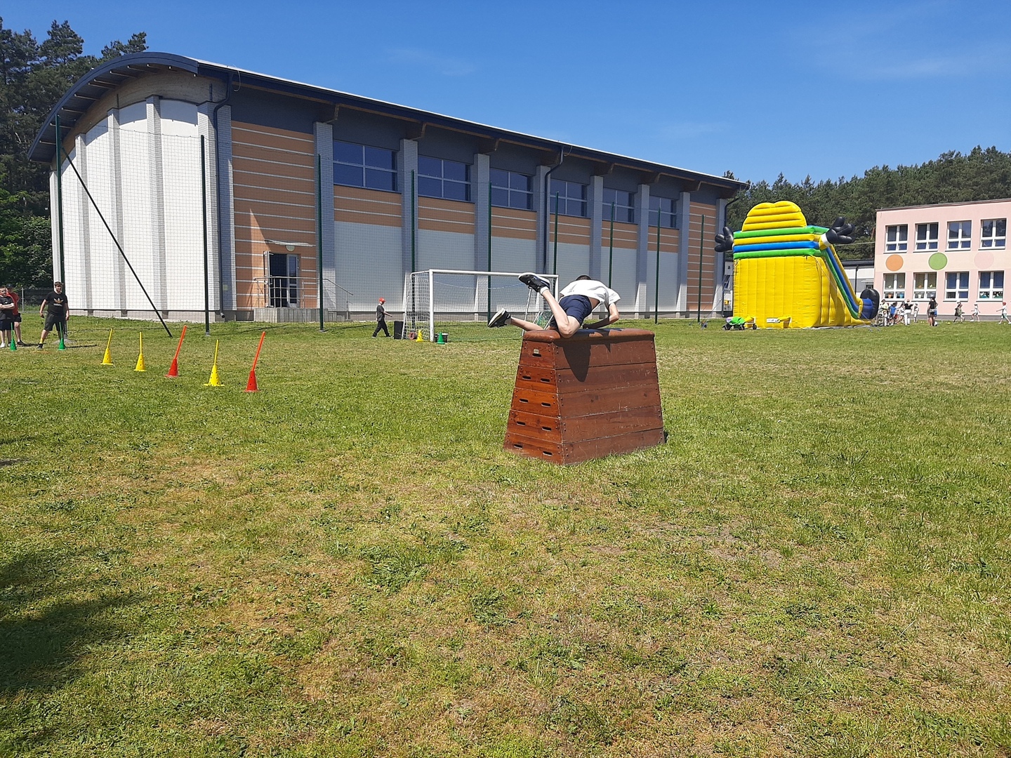 Odpowiedzialni za organizację Dnia Dziecka nauczyciele wf - pani Wioletta Kaleta i pan Paweł Zegarek - przygotowali ciekawy tor przeszkód, uczestnicy mogli również rozegrać mecze piłki siatkowej. Nie zabrakło kreatywnych pomysłów i nauki współpracy - układanie napisów z własnych ciał to świetna zabawa. Docenili ją nasi uczniowie, którzy ułożyli inicjały patrona szkoły. Dodatkową atrakcją była, zamówiona przez Radę Rodziców, dmuchana zjeżdżalnia.