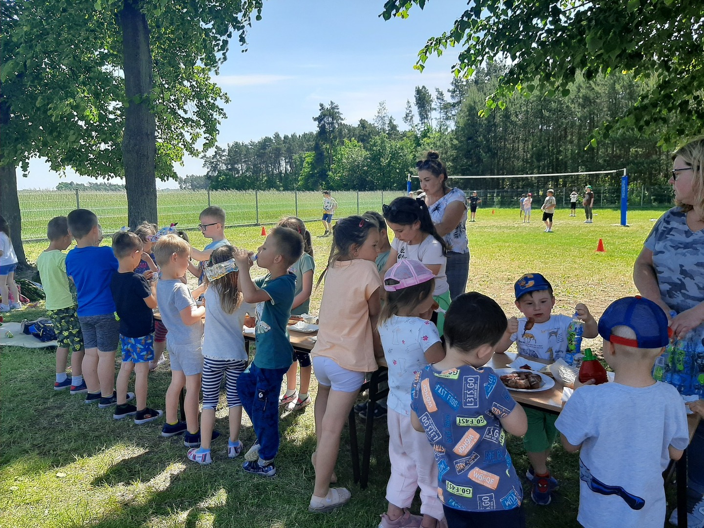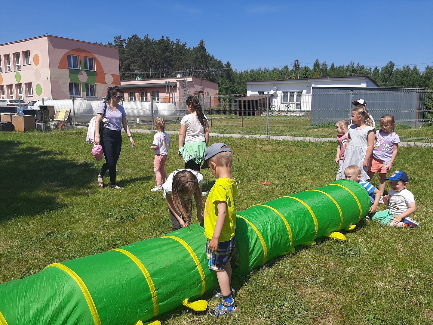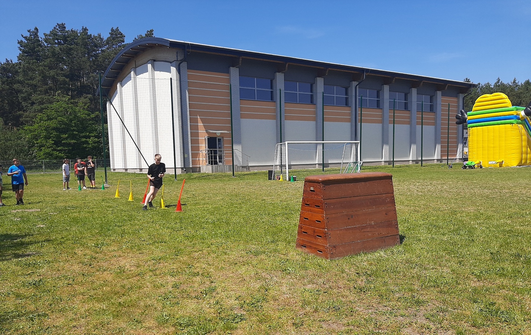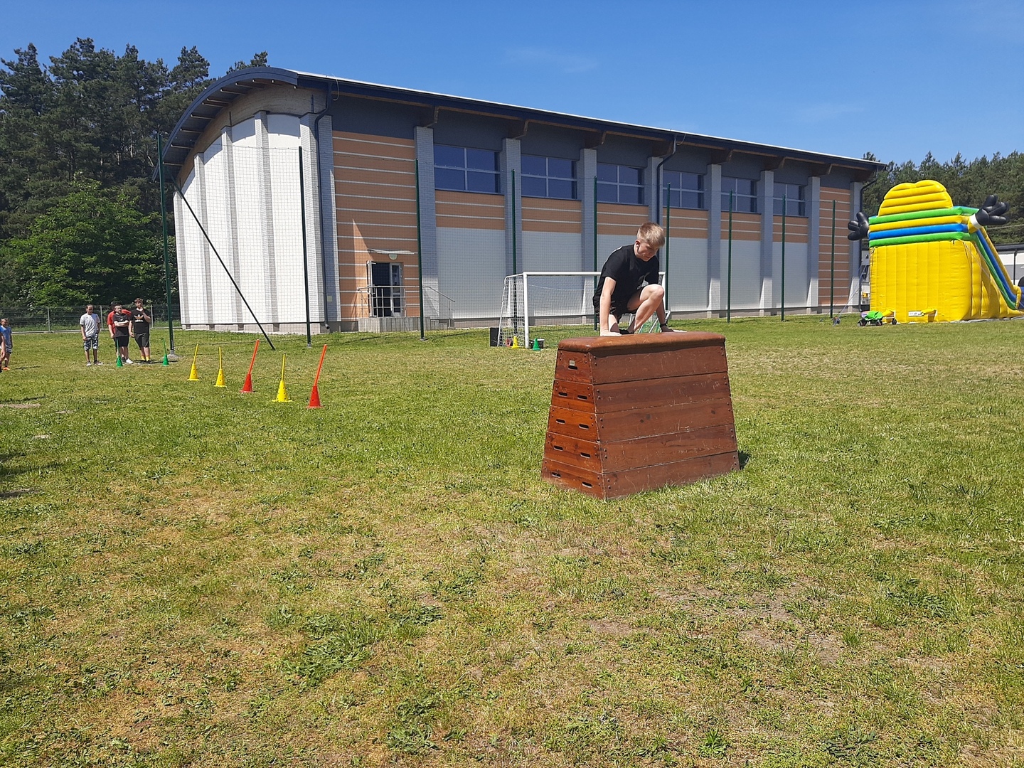 Odpowiedzialni za organizację Dnia Dziecka nauczyciele wf - pani Wioletta Kaleta i pan Paweł Zegarek - przygotowali ciekawy tor przeszkód, uczestnicy mogli również rozegrać mecze piłki siatkowej. Nie zabrakło kreatywnych pomysłów i nauki współpracy - układanie napisów z własnych ciał to świetna zabawa. Docenili ją nasi uczniowie, którzy ułożyli inicjały patrona szkoły. Dodatkową atrakcją była, zamówiona przez Radę Rodziców, dmuchana zjeżdżalnia.