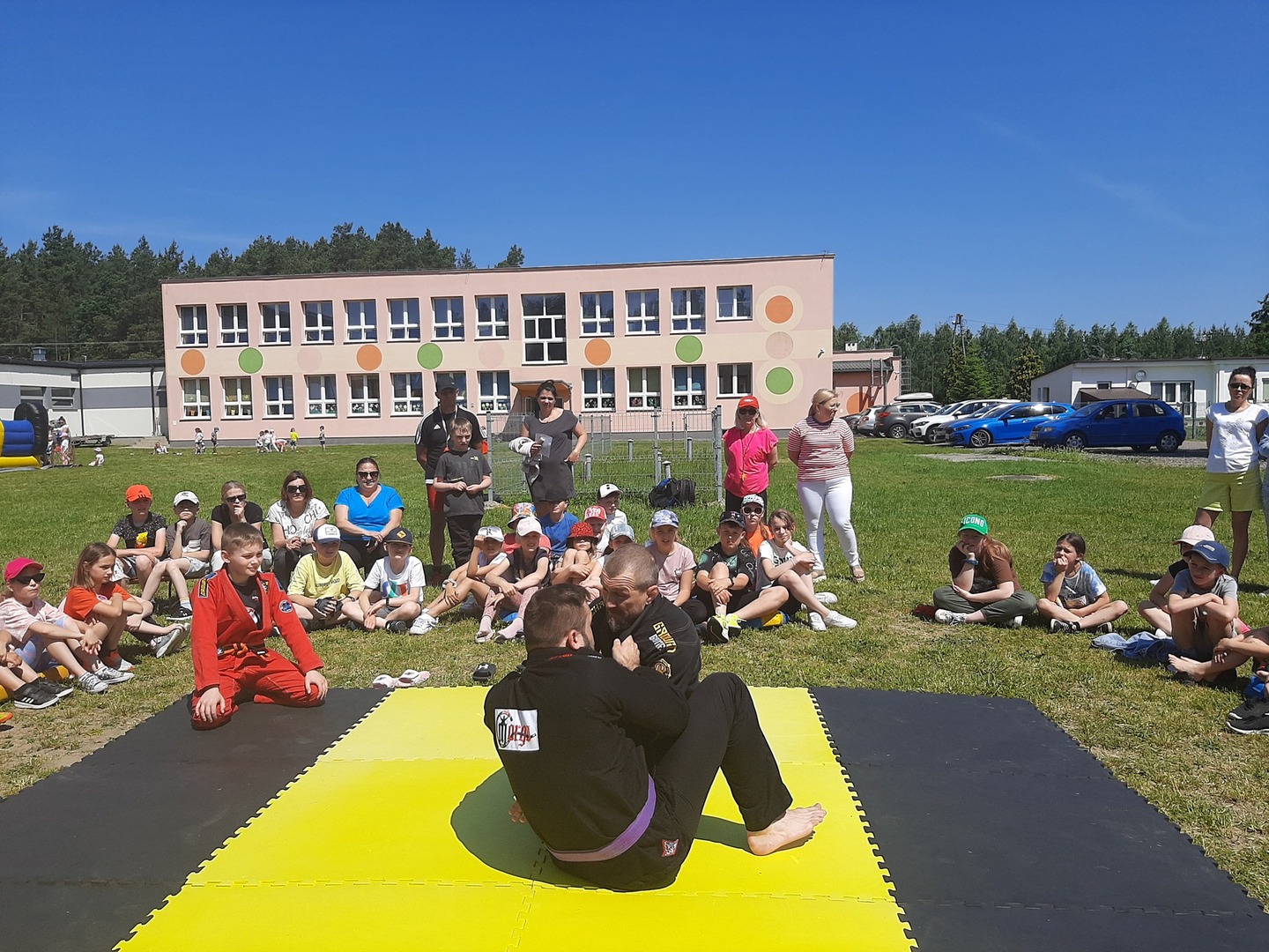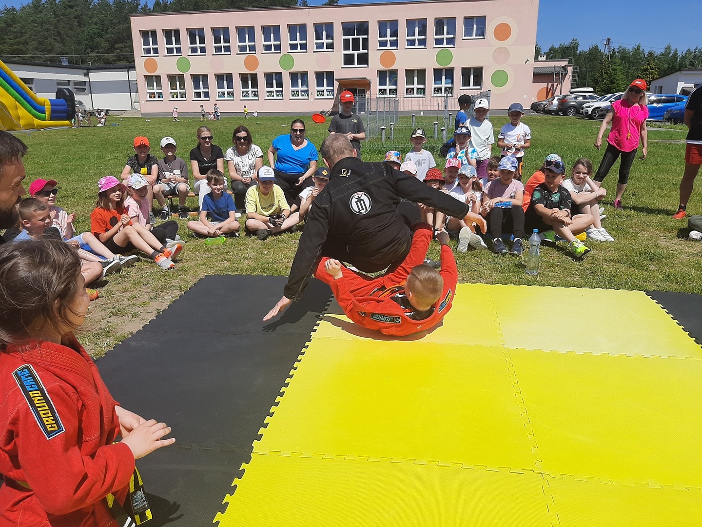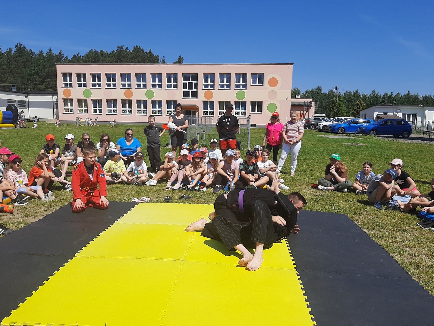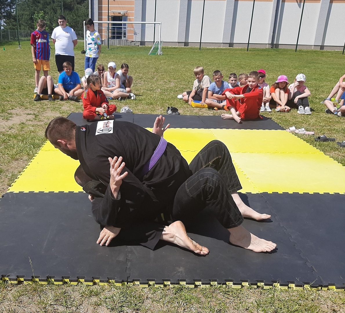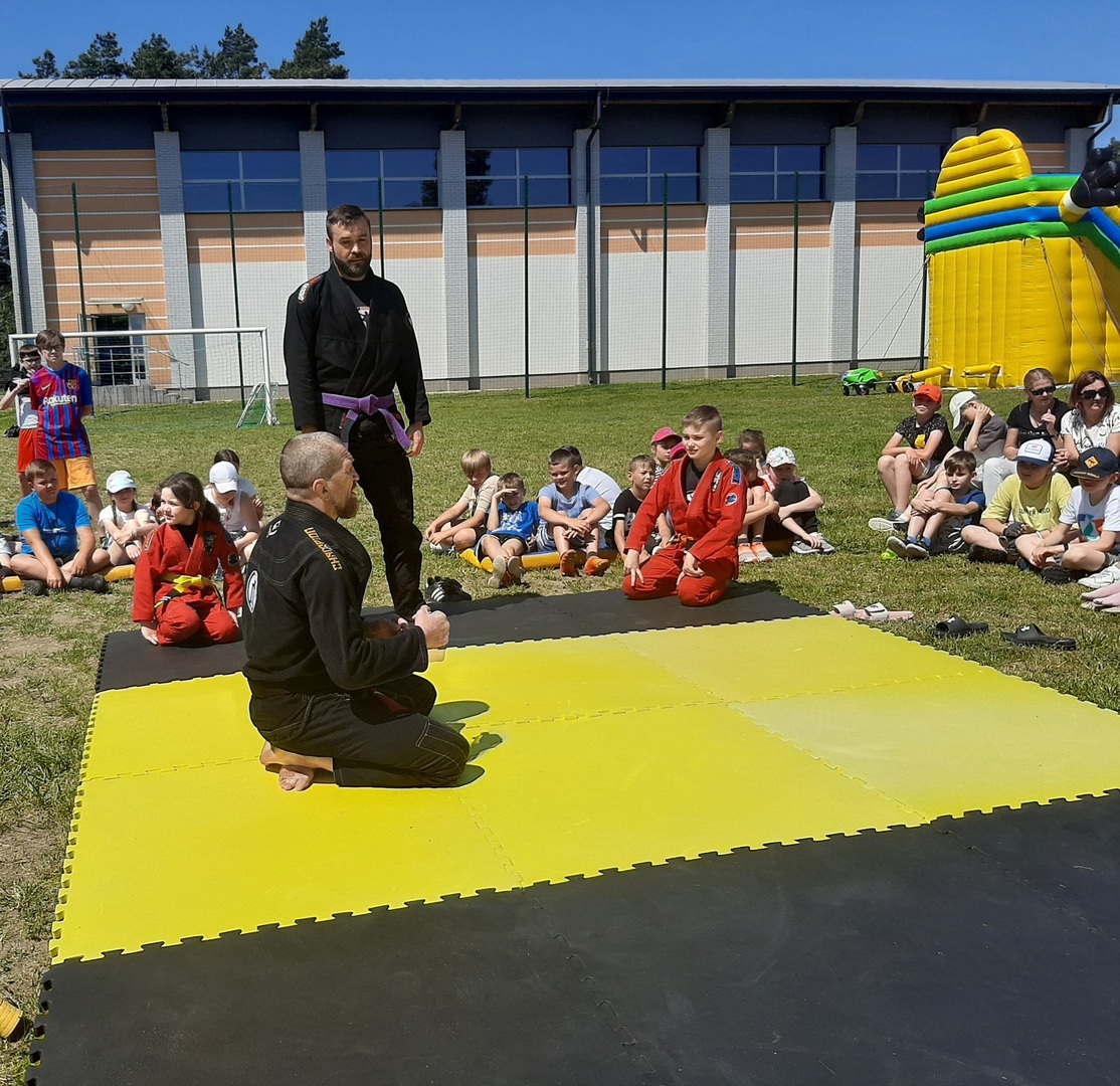 Iga Klamut z klasy I i Wiktor Klamut z klasy IV - trenują brazylijskie jiu - jitsu pod okiem trenerów: Łukasza Bilskiego i Wojciecha Klamuta - taty Igi i Wiktora. Uczniowie naszej szkoły mieli możliwość wzięcia udziału w krótkiej rozgrzewce z trenerami i zawodnikami, obejrzenia pokazu walki, mogli zadawać pytania dotyczące tego niezwykłego sportu.