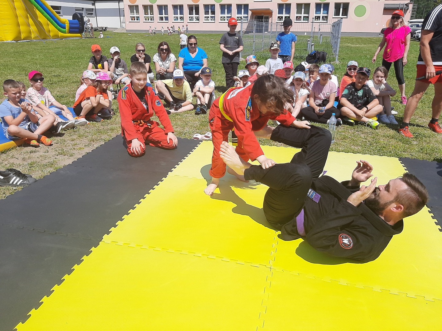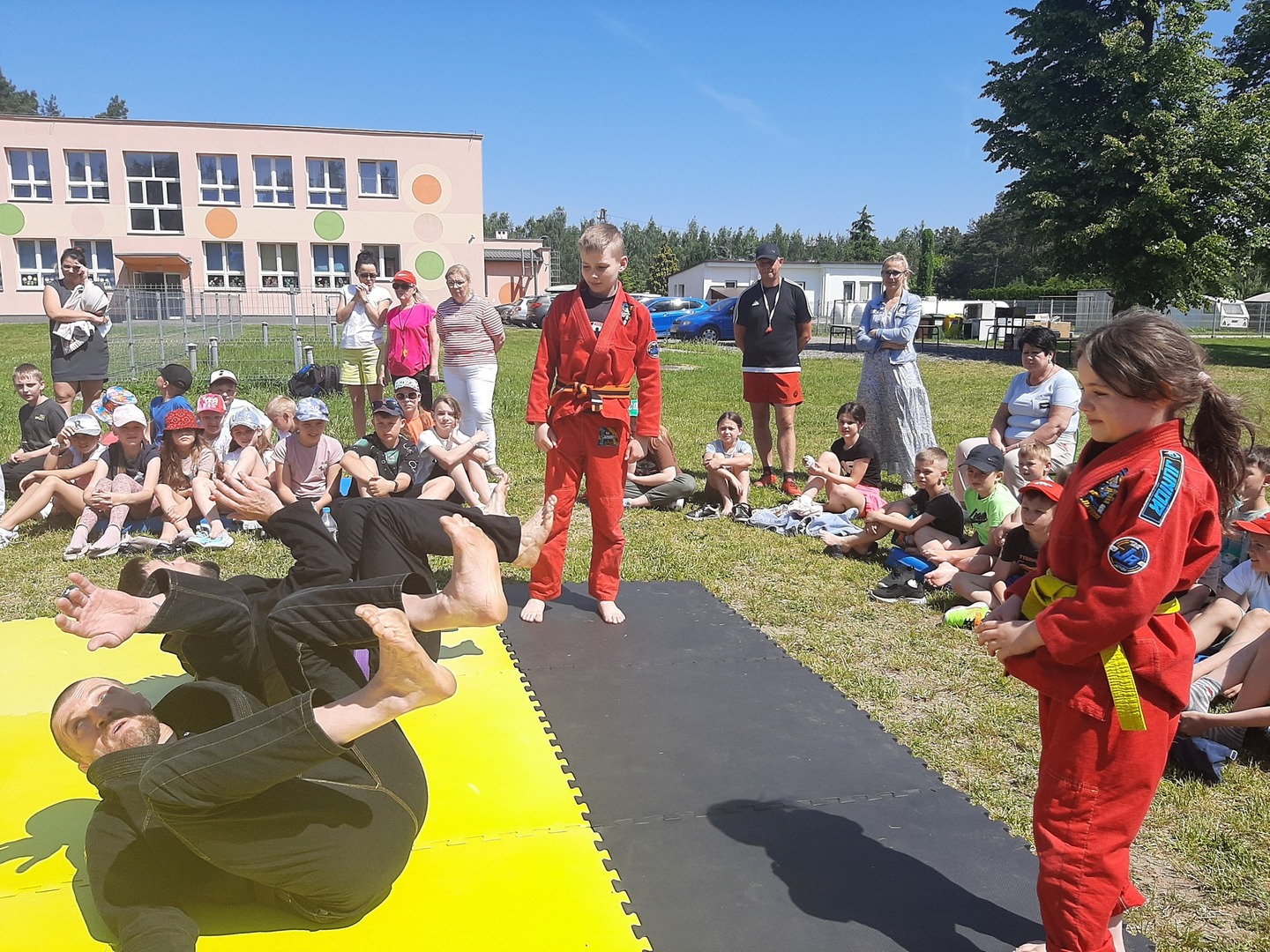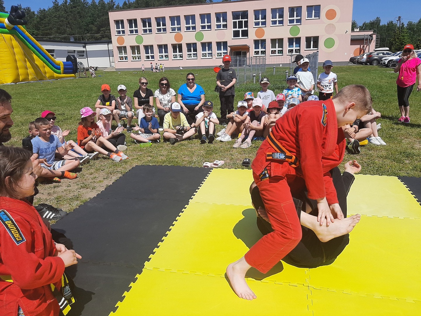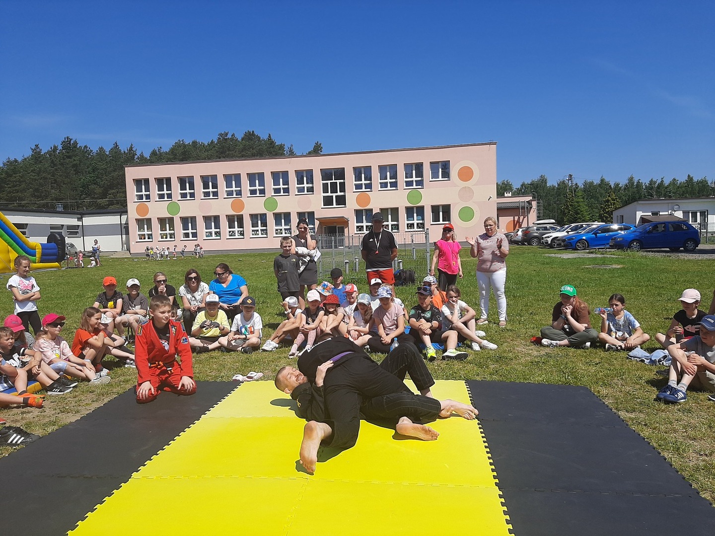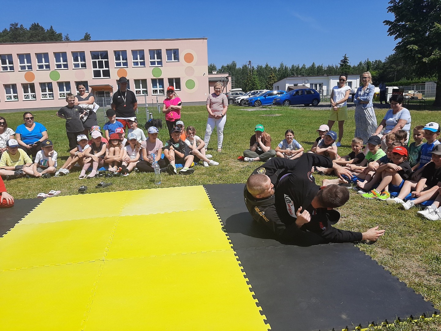 Iga Klamut z klasy I i Wiktor Klamut z klasy IV - trenują brazylijskie jiu - jitsu pod okiem trenerów: Łukasza Bilskiego i Wojciecha Klamuta - taty Igi i Wiktora. Uczniowie naszej szkoły mieli możliwość wzięcia udziału w krótkiej rozgrzewce z trenerami i zawodnikami, obejrzenia pokazu walki, mogli zadawać pytania dotyczące tego niezwykłego sportu.