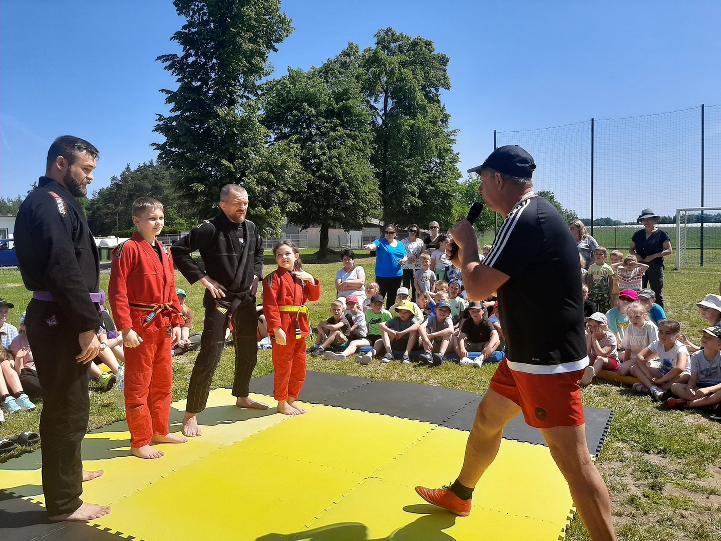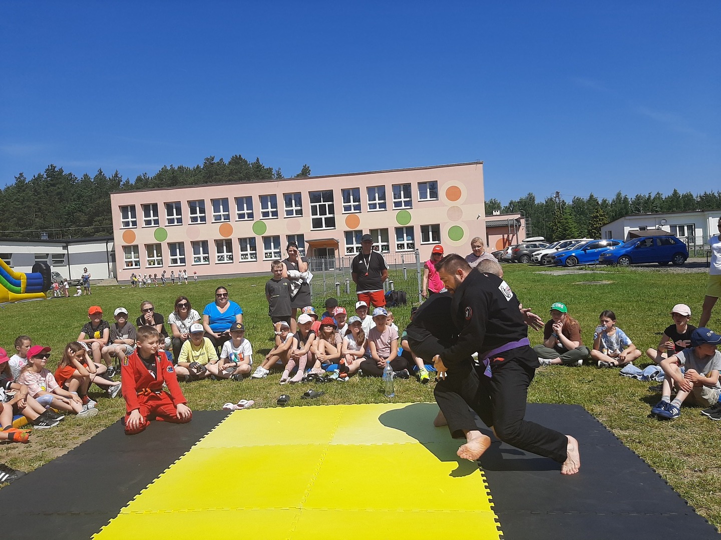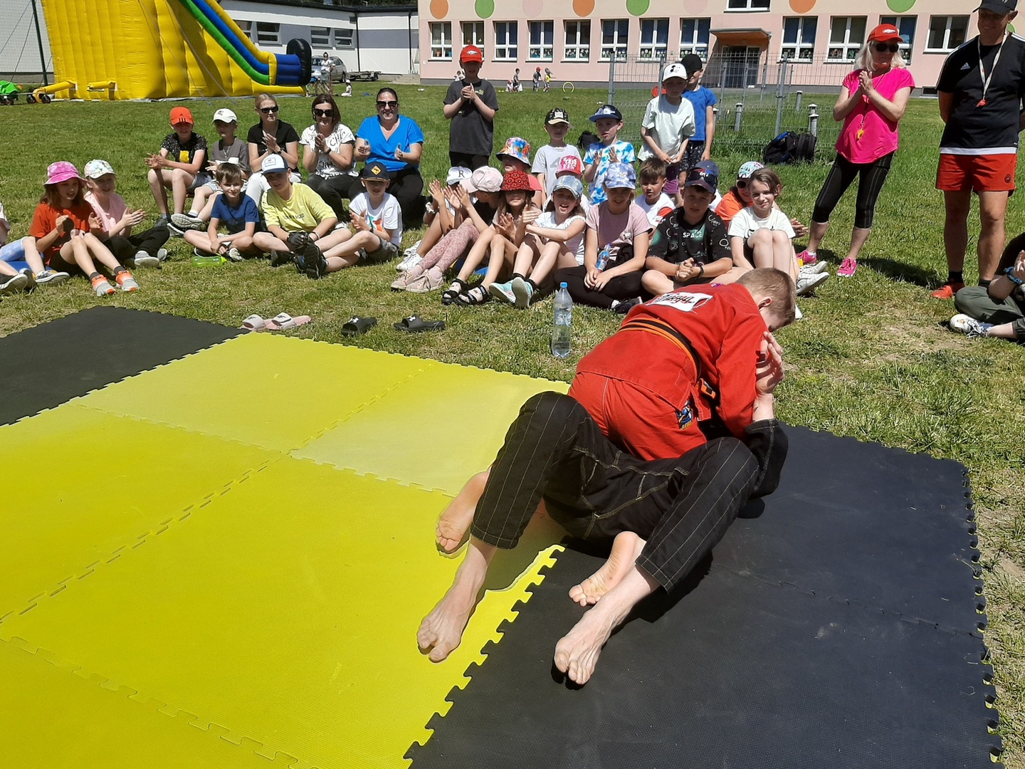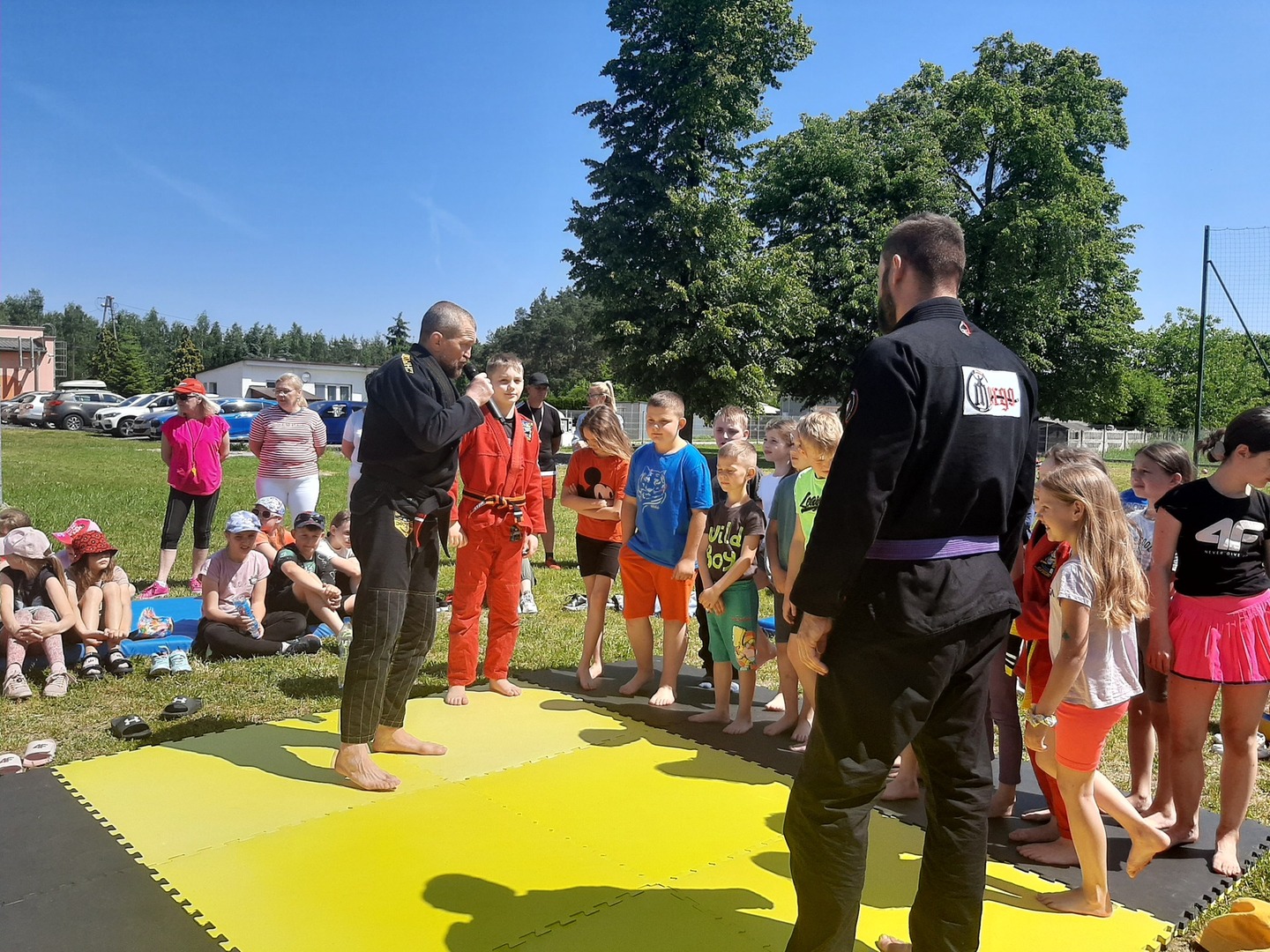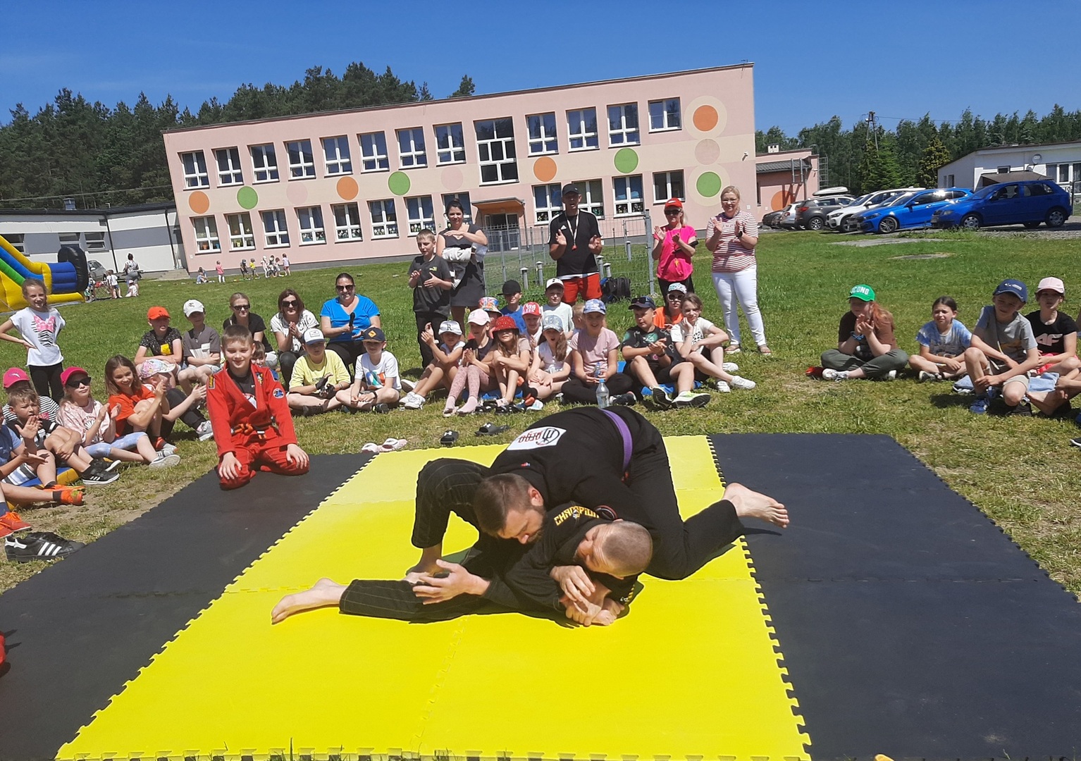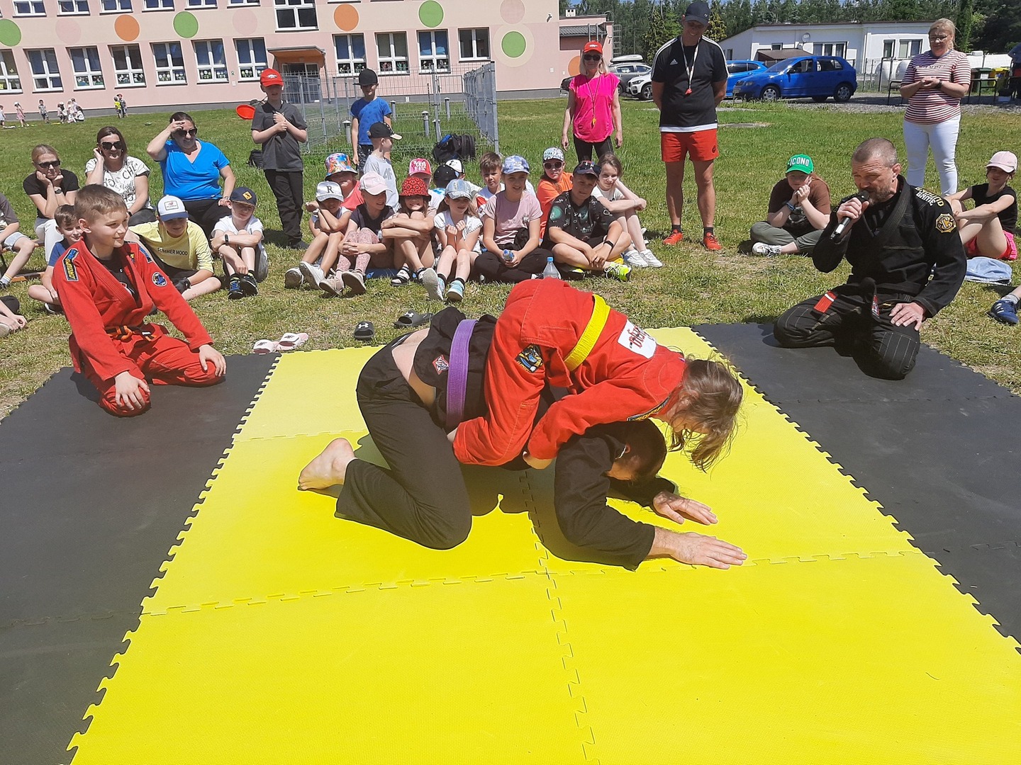 Iga Klamut z klasy I i Wiktor Klamut z klasy IV - trenują brazylijskie jiu - jitsu pod okiem trenerów: Łukasza Bilskiego i Wojciecha Klamuta - taty Igi i Wiktora. Uczniowie naszej szkoły mieli możliwość wzięcia udziału w krótkiej rozgrzewce z trenerami i zawodnikami, obejrzenia pokazu walki, mogli zadawać pytania dotyczące tego niezwykłego sportu.