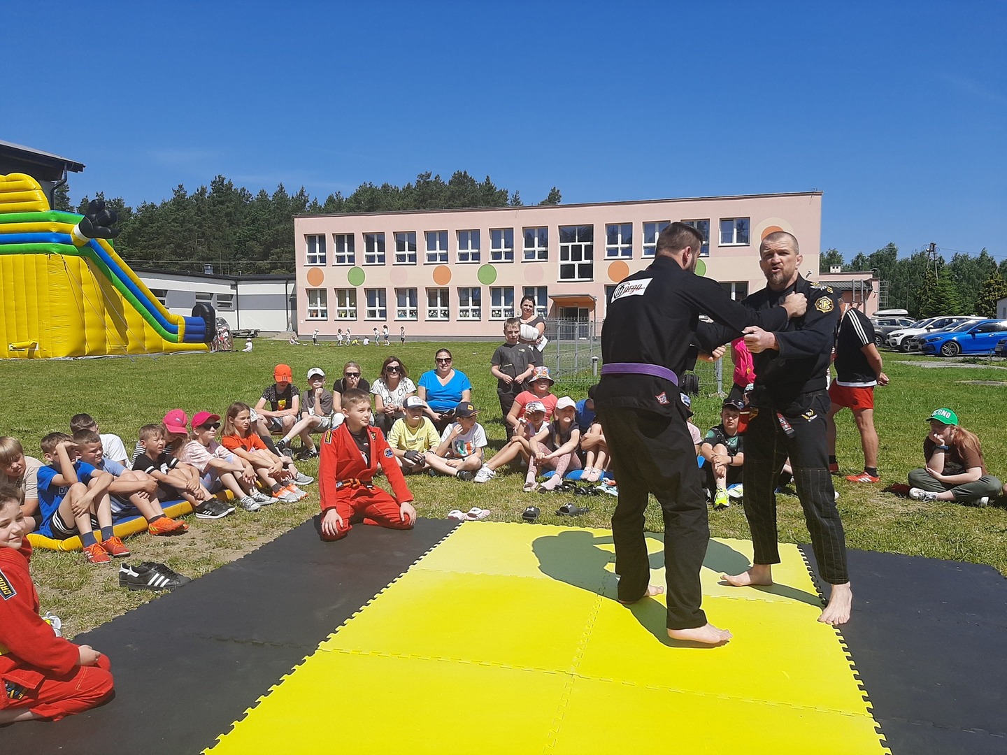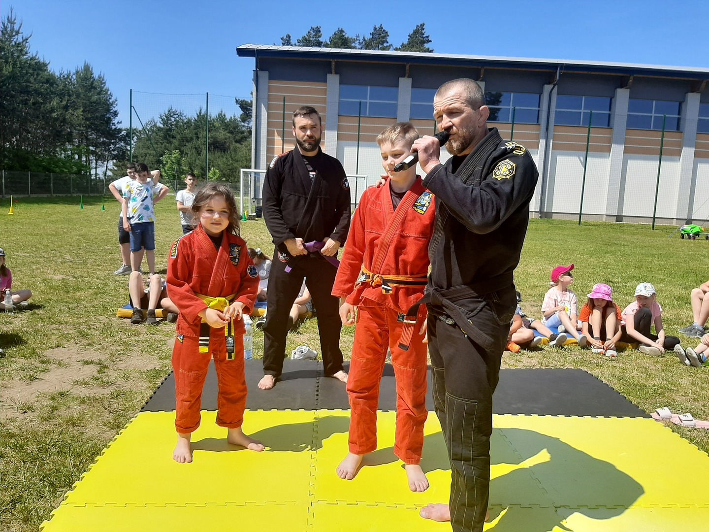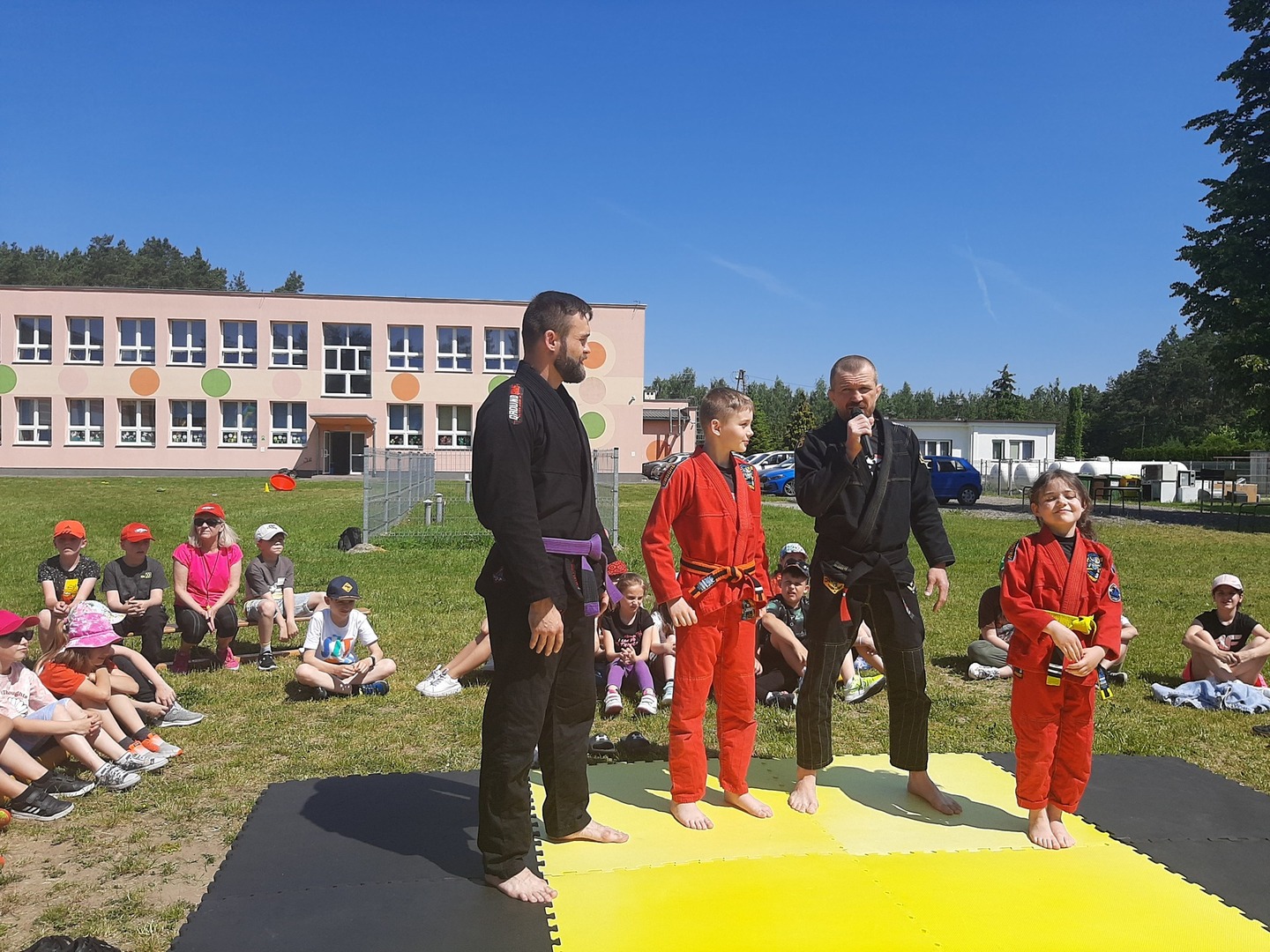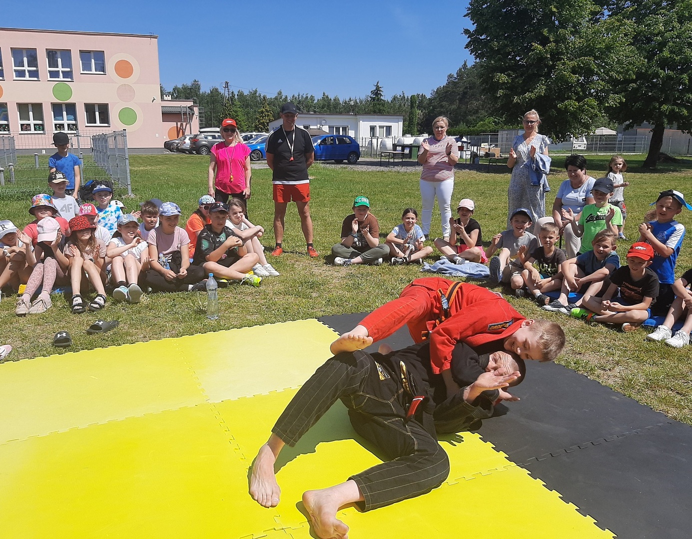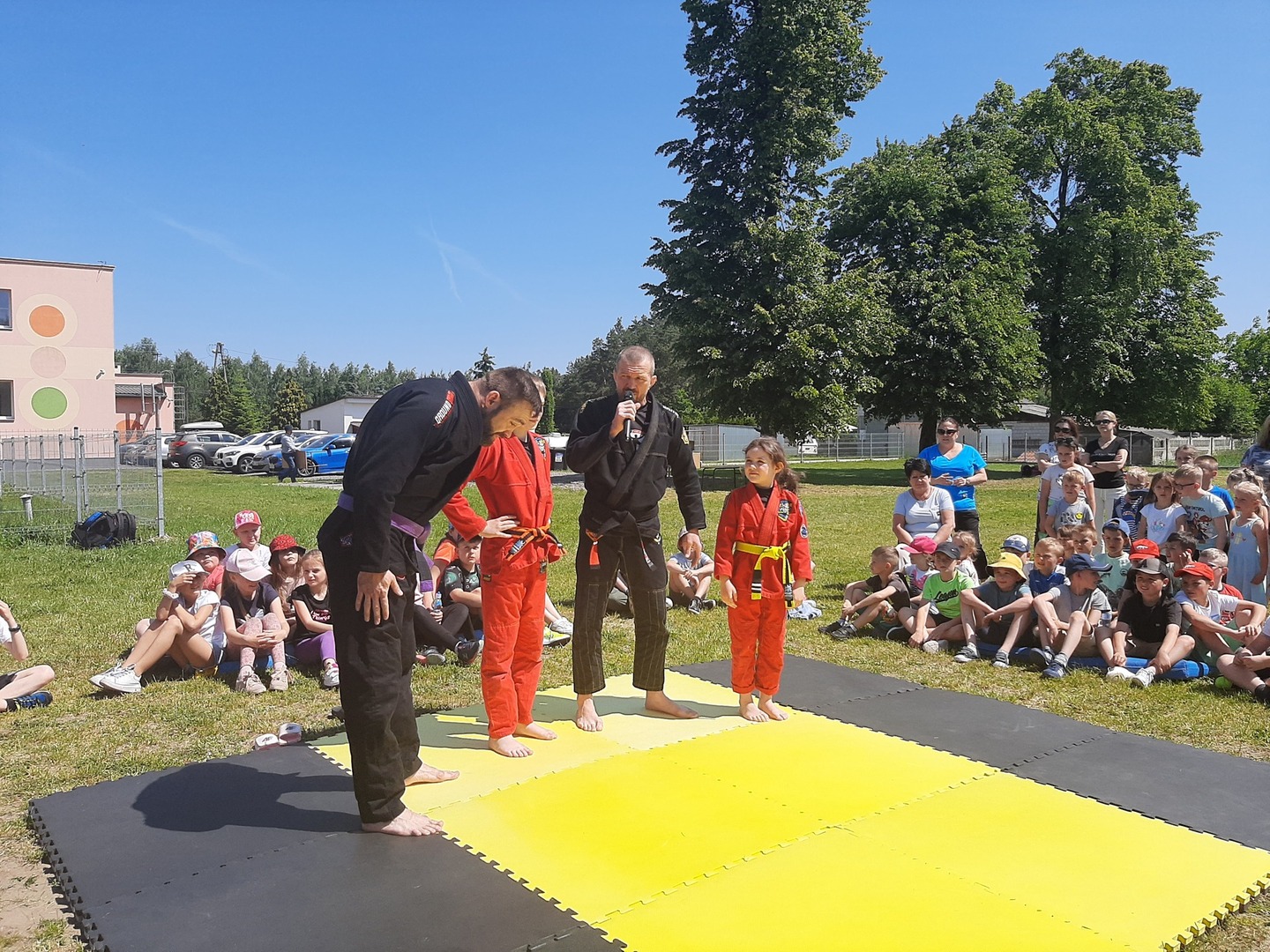 Iga Klamut z klasy I i Wiktor Klamut z klasy IV - trenują brazylijskie jiu - jitsu pod okiem trenerów: Łukasza Bilskiego i Wojciecha Klamuta - taty Igi i Wiktora. Uczniowie naszej szkoły mieli możliwość wzięcia udziału w krótkiej rozgrzewce z trenerami i zawodnikami, obejrzenia pokazu walki, mogli zadawać pytania dotyczące tego niezwykłego sportu.