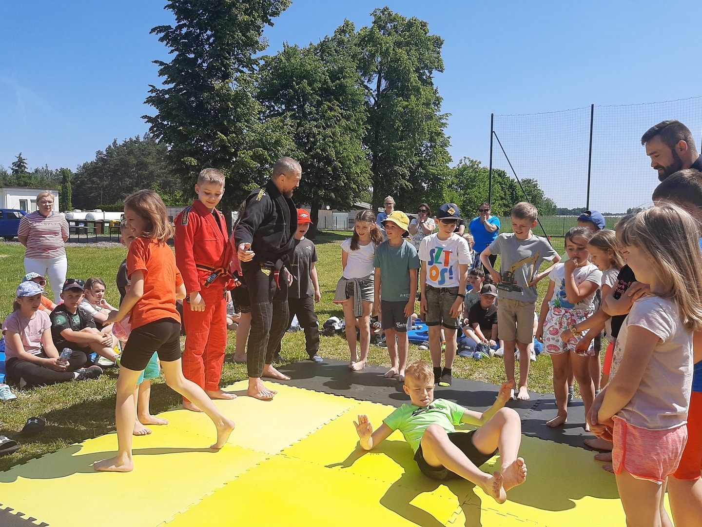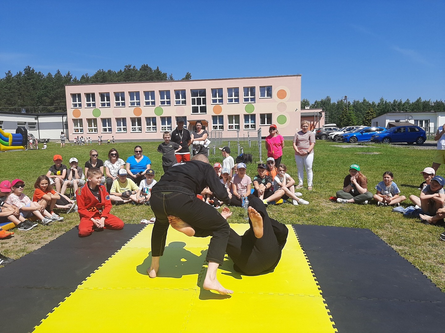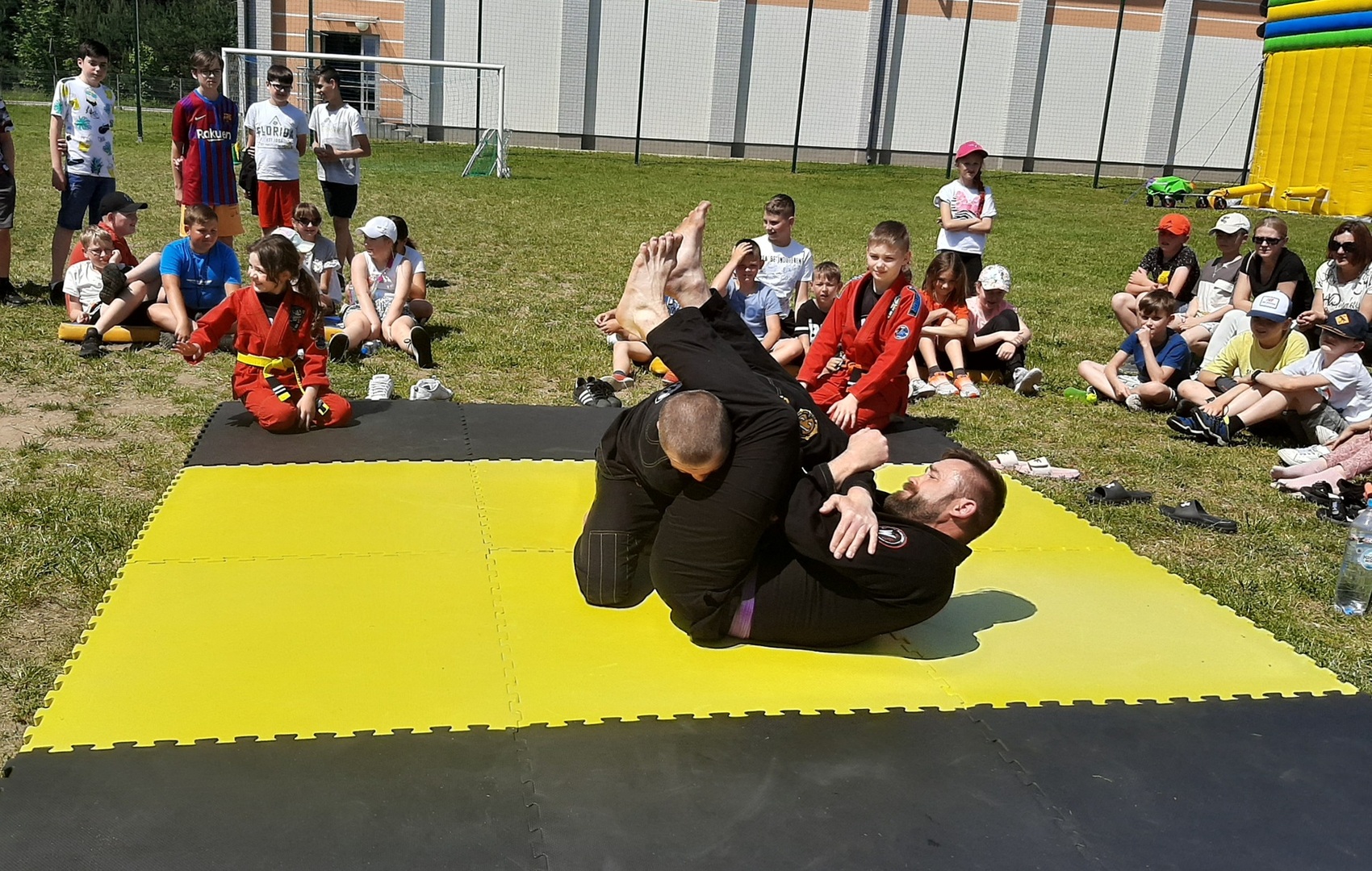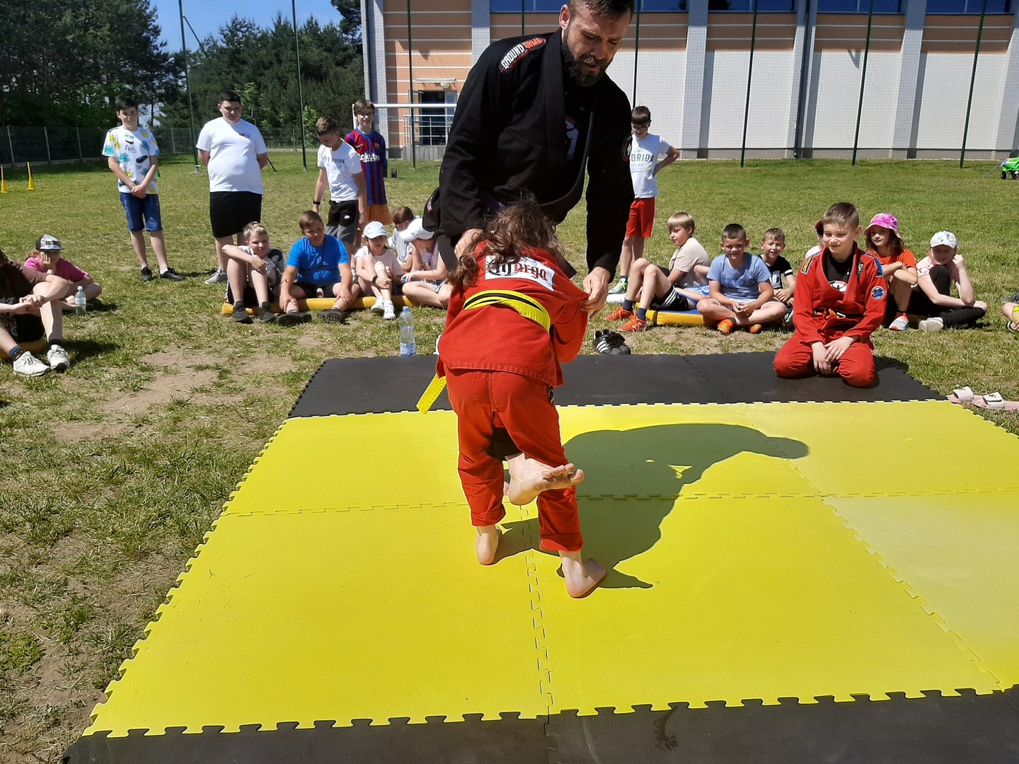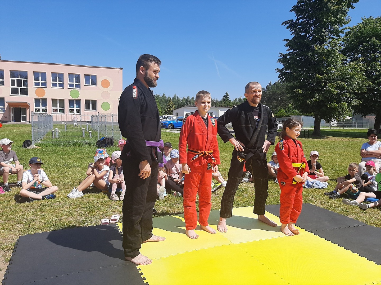 Iga Klamut z klasy I i Wiktor Klamut z klasy IV - trenują brazylijskie jiu - jitsu pod okiem trenerów: Łukasza Bilskiego i Wojciecha Klamuta - taty Igi i Wiktora. Uczniowie naszej szkoły mieli możliwość wzięcia udziału w krótkiej rozgrzewce z trenerami i zawodnikami, obejrzenia pokazu walki, mogli zadawać pytania dotyczące tego niezwykłego sportu.