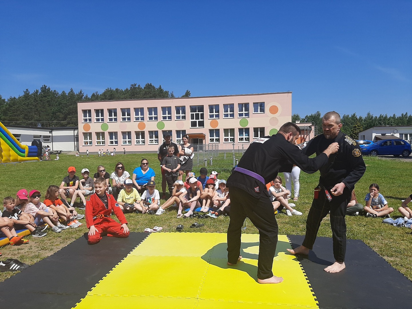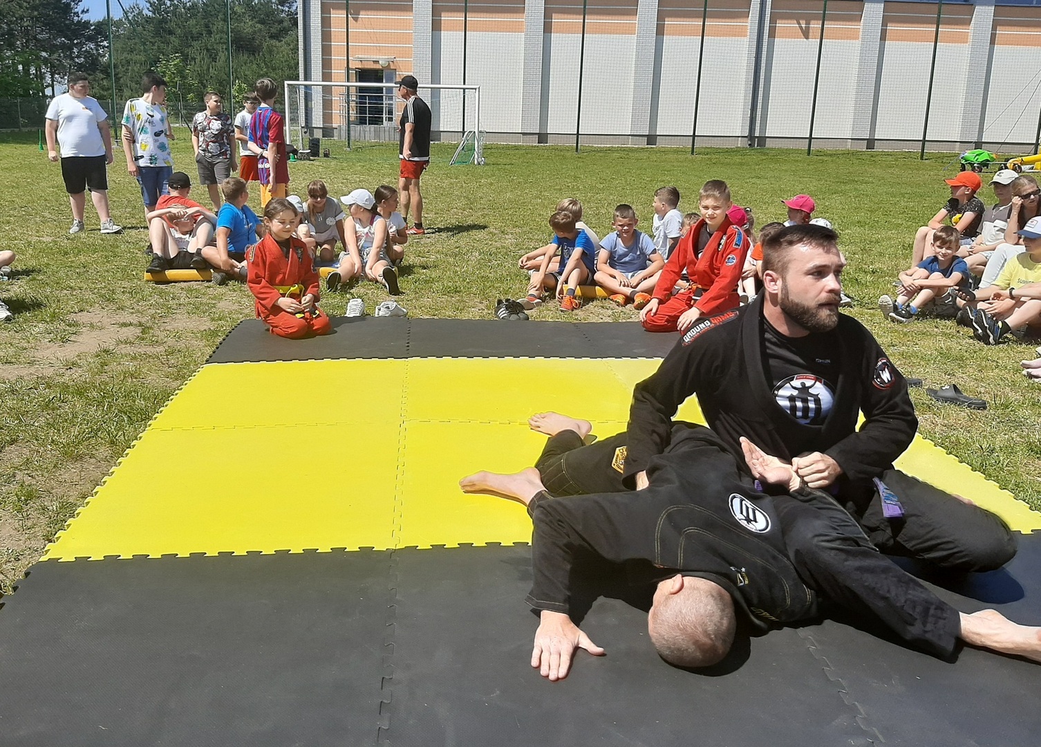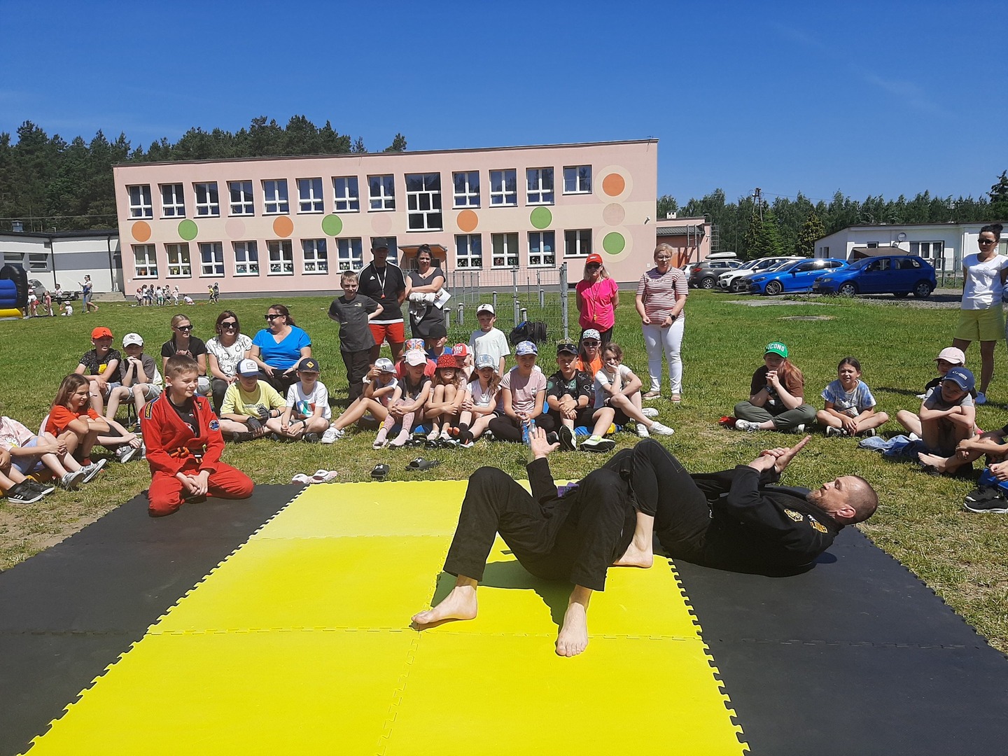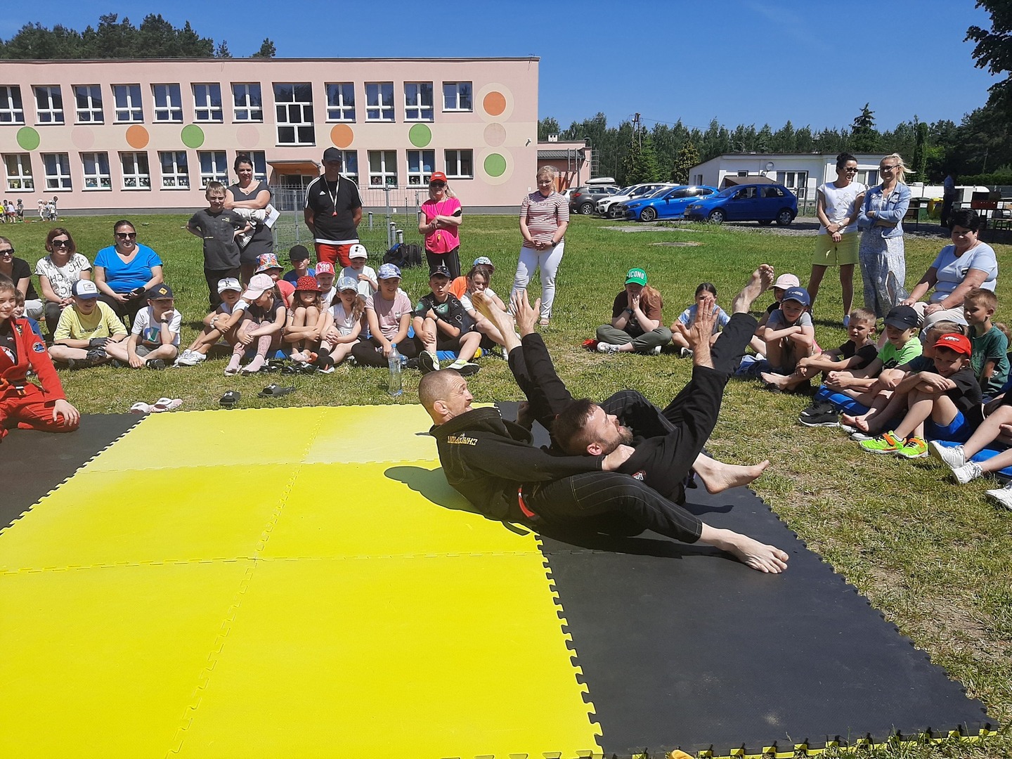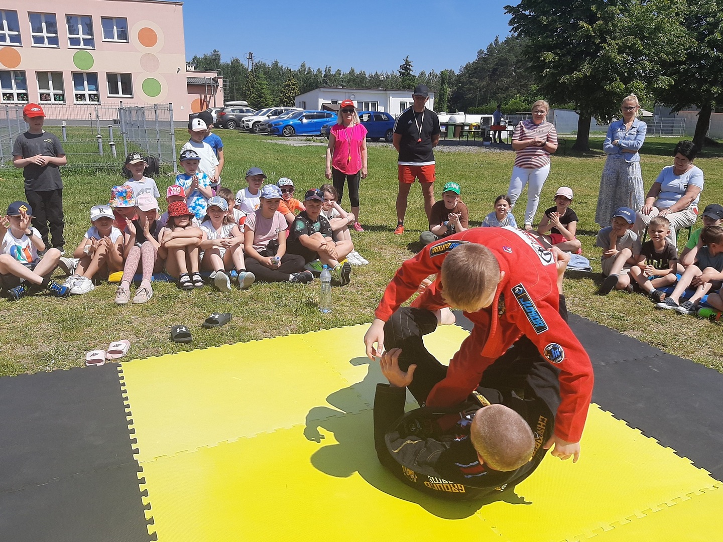 Iga Klamut z klasy I i Wiktor Klamut z klasy IV - trenują brazylijskie jiu - jitsu pod okiem trenerów: Łukasza Bilskiego i Wojciecha Klamuta - taty Igi i Wiktora. Uczniowie naszej szkoły mieli możliwość wzięcia udziału w krótkiej rozgrzewce z trenerami i zawodnikami, obejrzenia pokazu walki, mogli zadawać pytania dotyczące tego niezwykłego sportu.